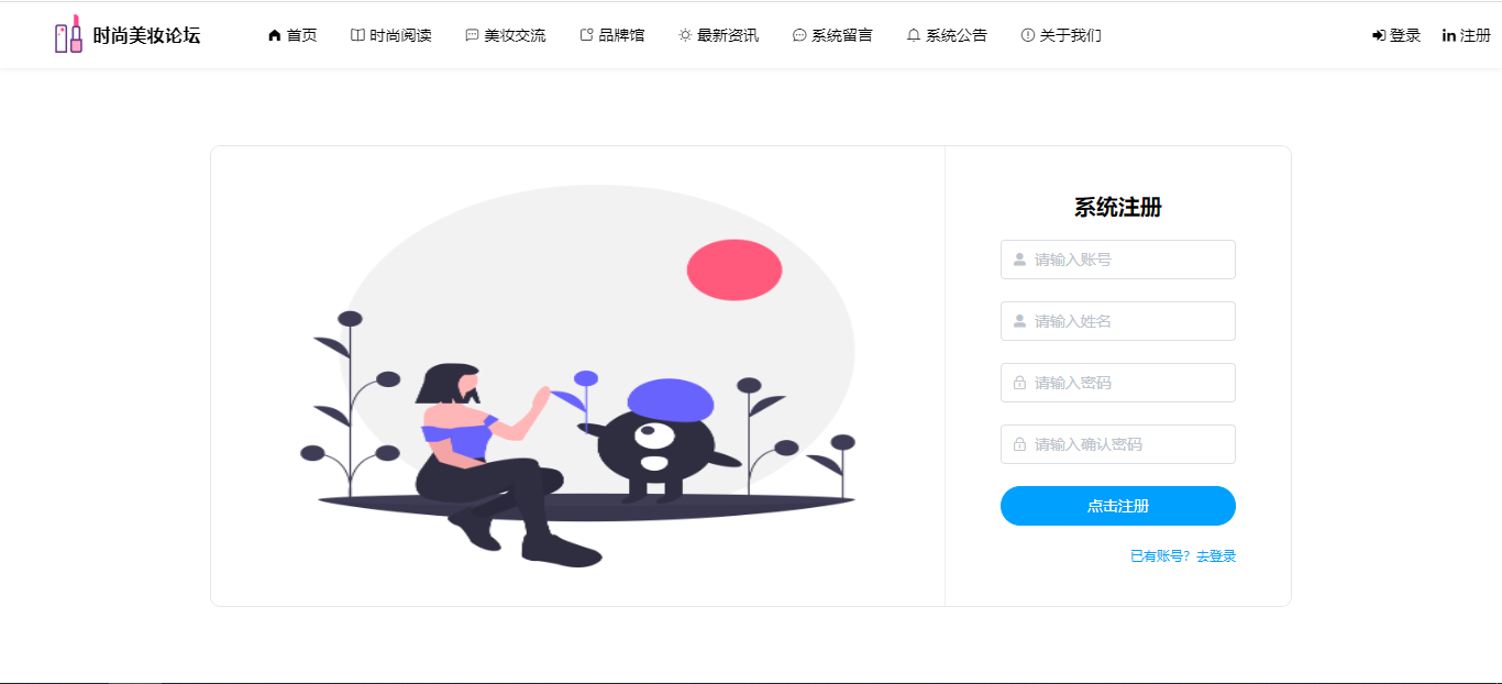 用户:注册、登录系统;首页;时尚阅读(点赞、收藏、评论);美妆交流(板块、帖子、点赞、收藏、评论);品牌馆(点赞、收藏、评论);最新资讯(点赞、收藏、评论);系统留言;系统公告;关于我们;