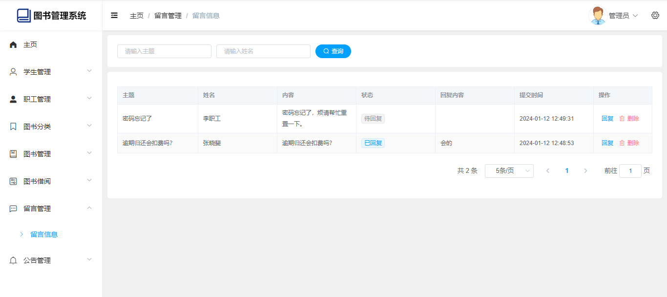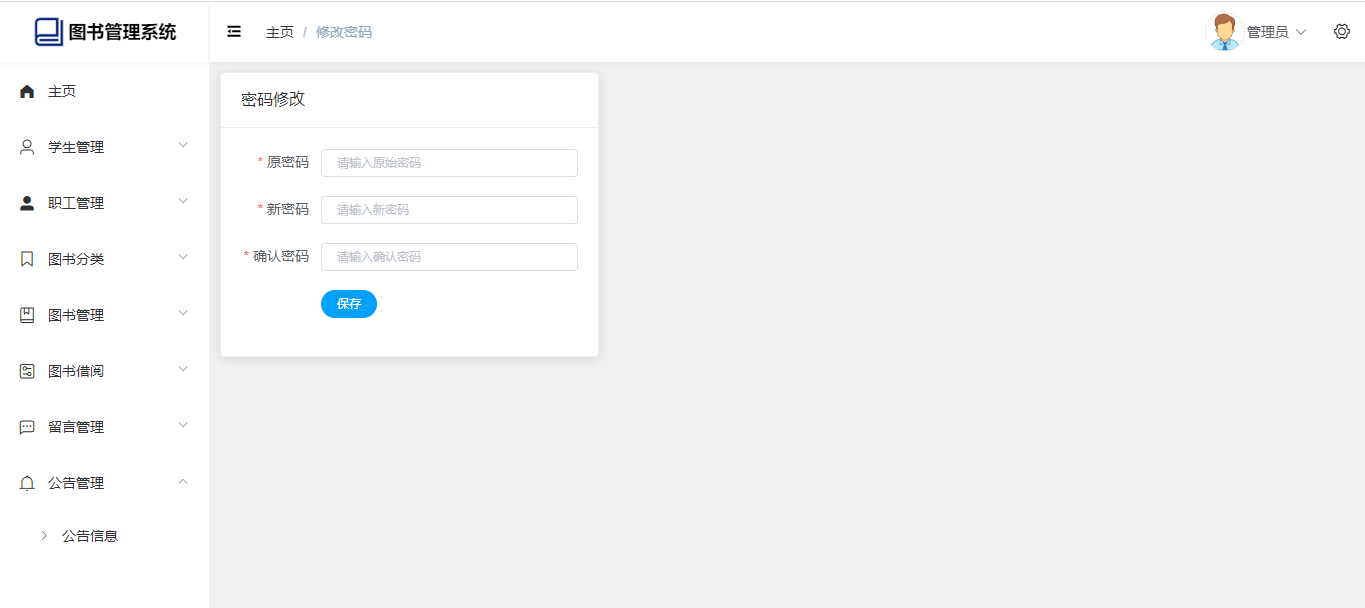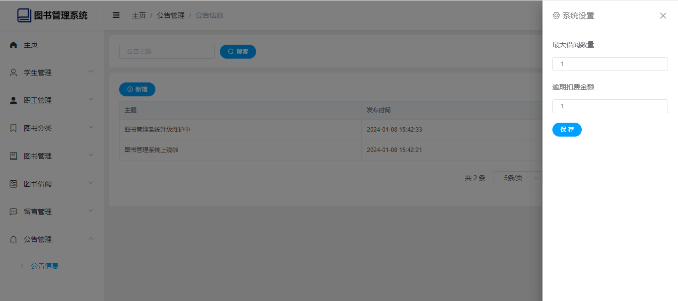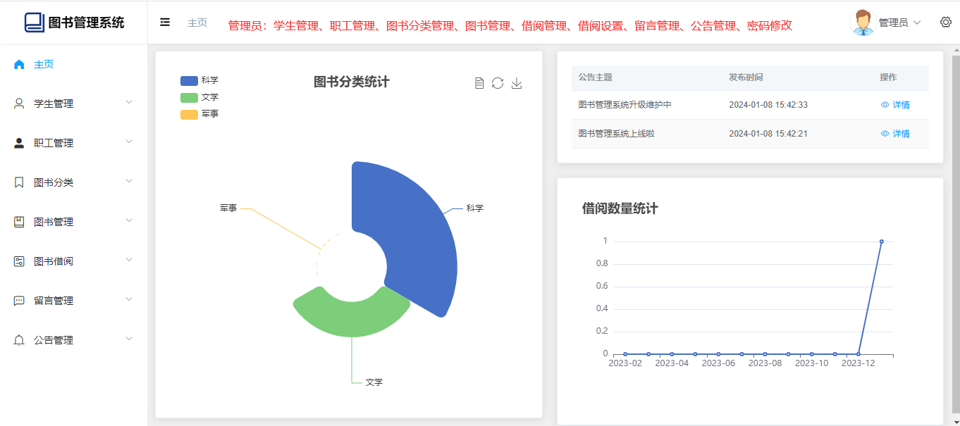 管理员:首页(数据统计);学生管理;职工管理;图书分类;图书管理;图书借阅;借阅设置(最大借阅数量、逾期扣费金额);留言管理(回复);公告信息;个人信息;密码修改;
