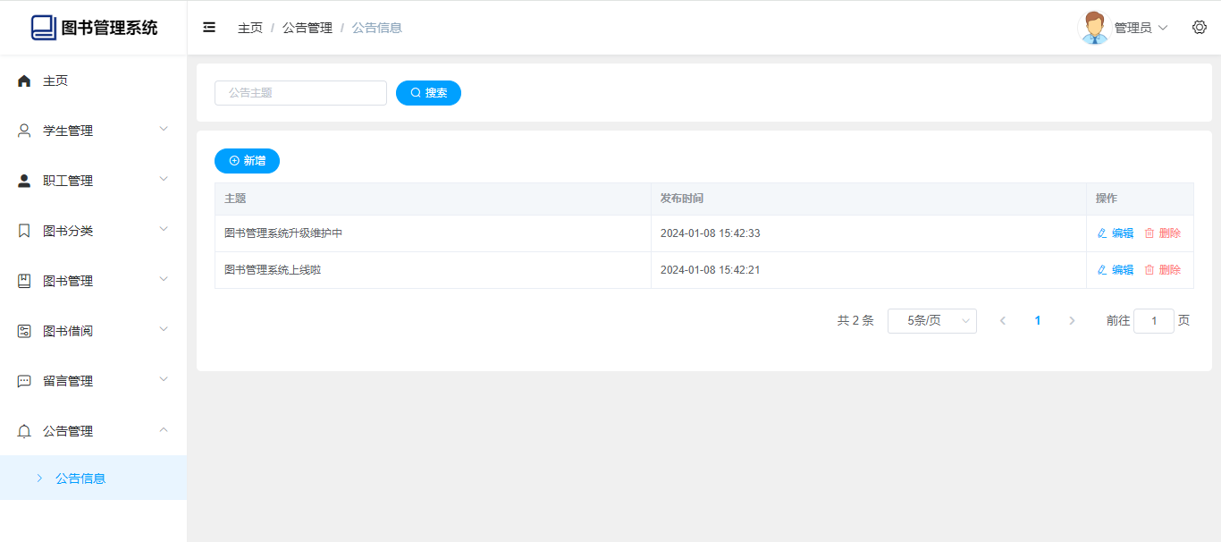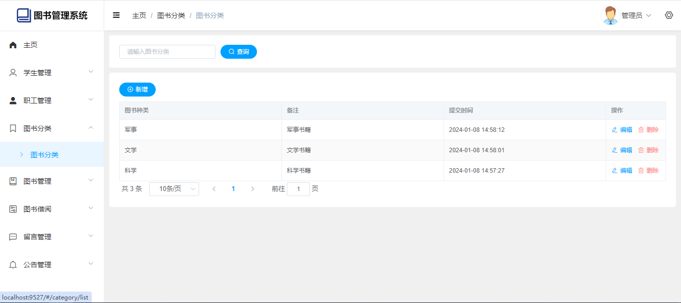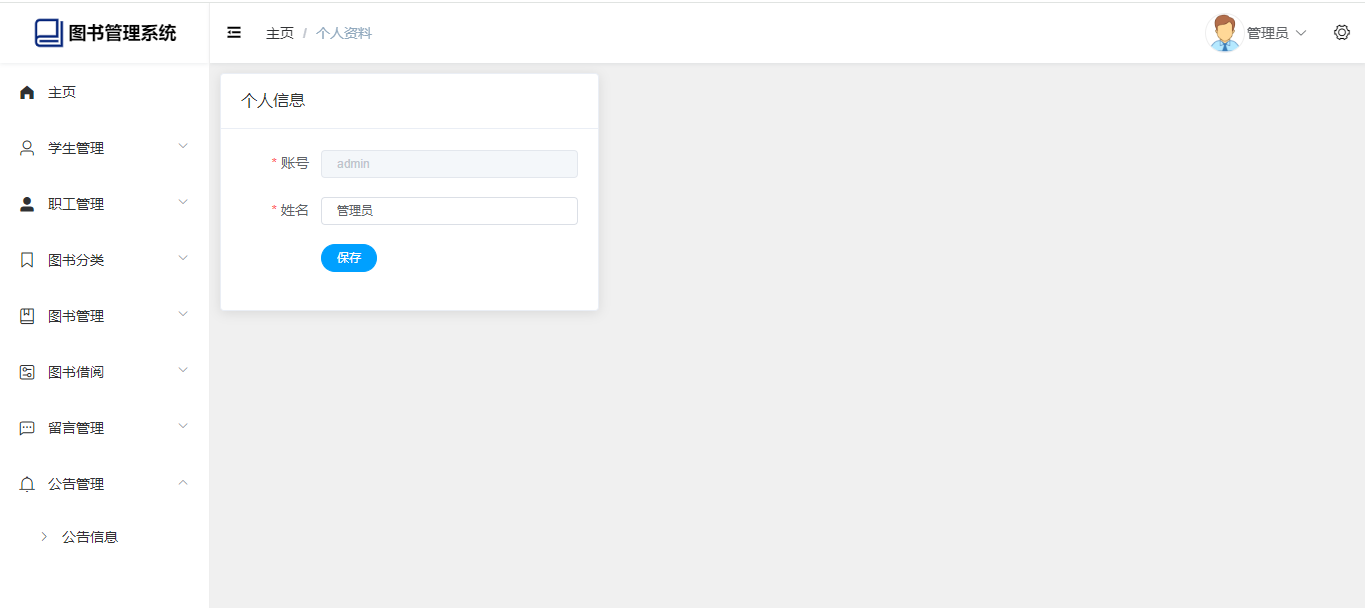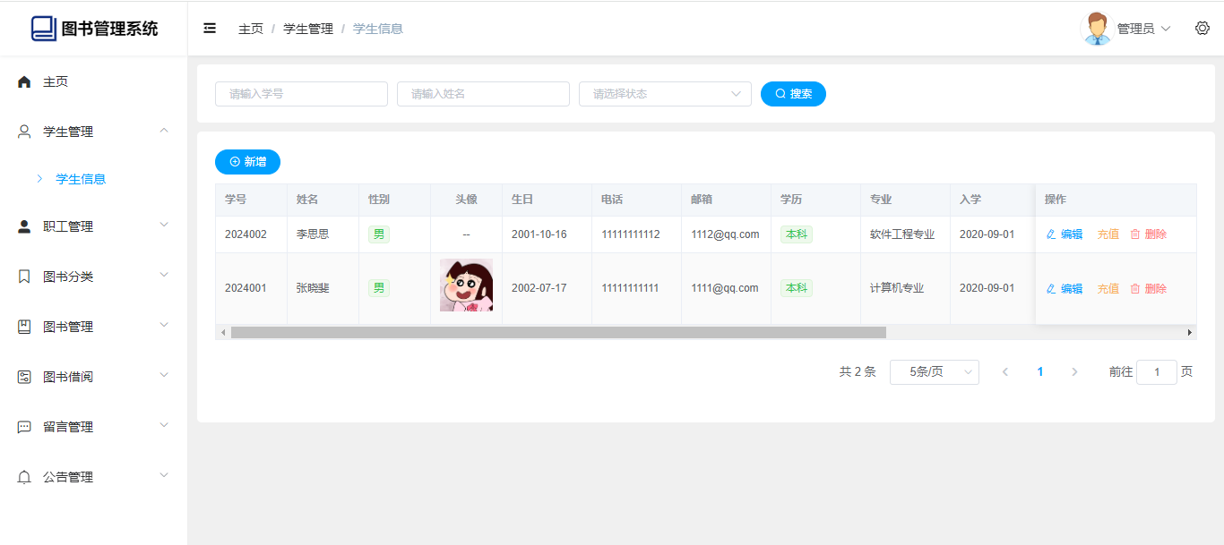 管理员:首页(数据统计);学生管理;职工管理;图书分类;图书管理;图书借阅;借阅设置(最大借阅数量、逾期扣费金额);留言管理(回复);公告信息;个人信息;密码修改;