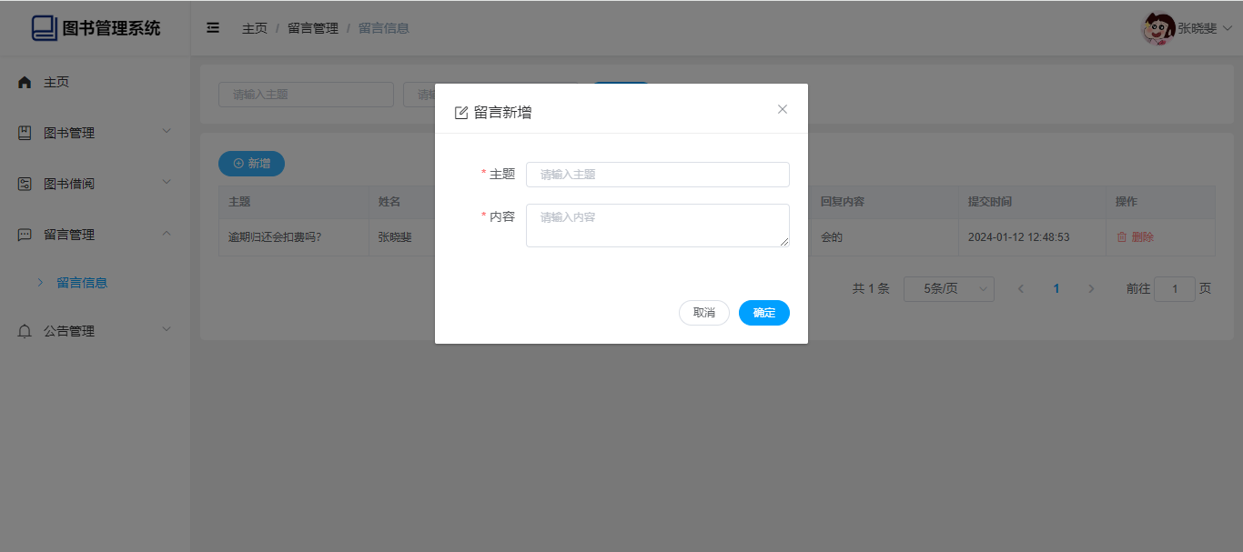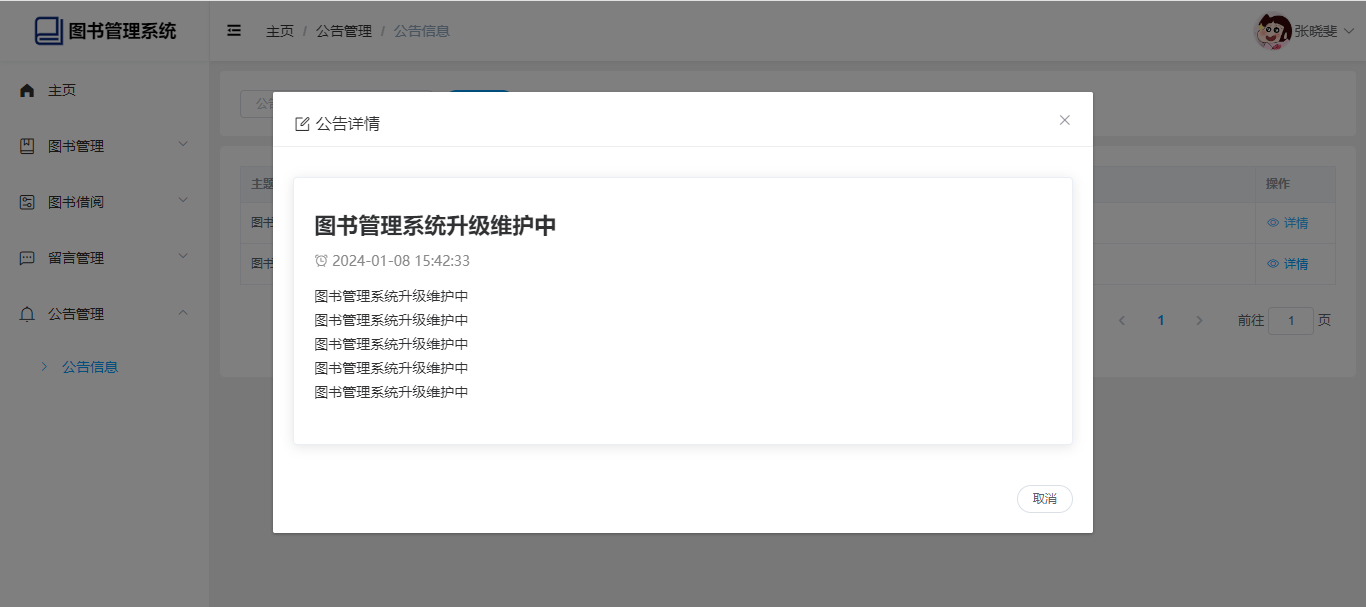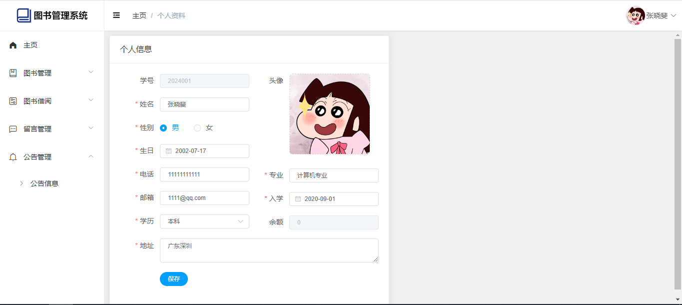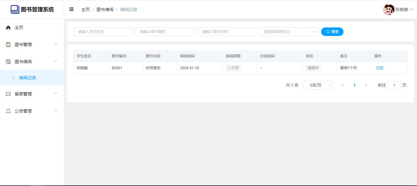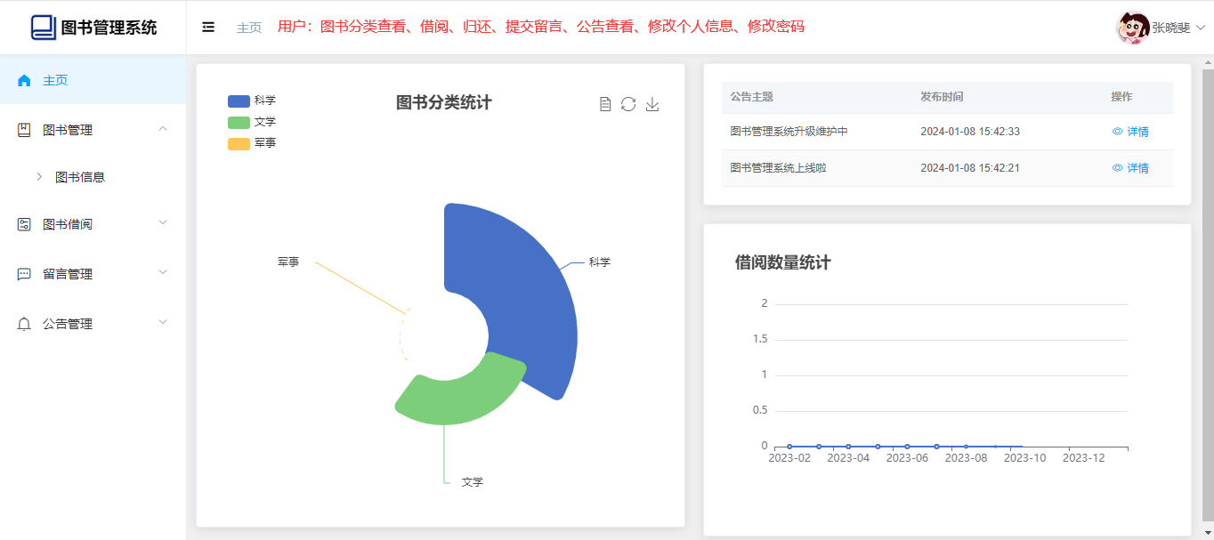 学生:注册、登录系统、图书信息查看(借阅)、图书借阅记录(归还)、留言管理、公告查看、个人信息修改(可上传头像);密码修改。