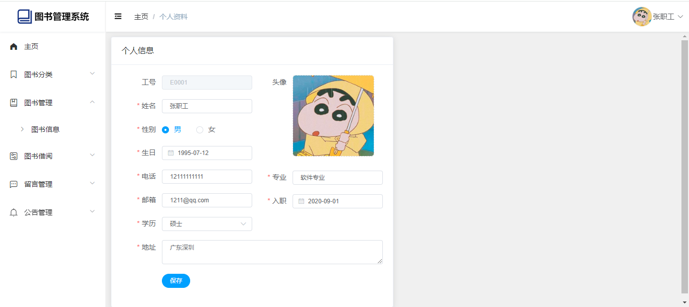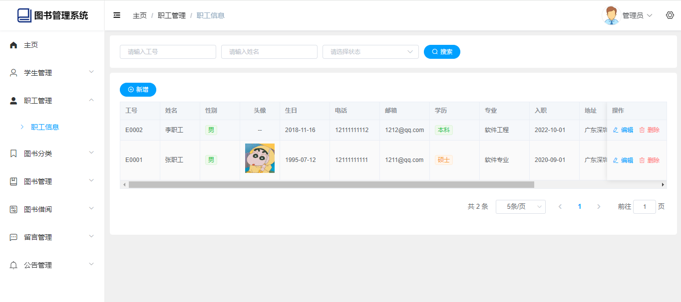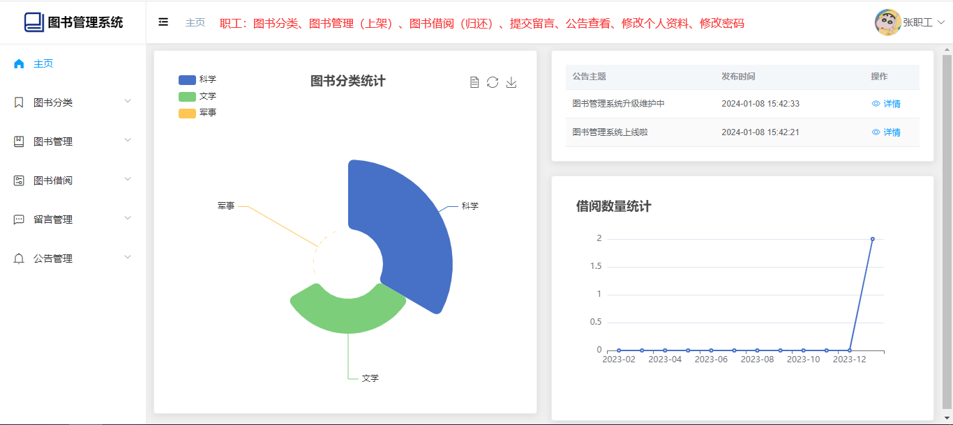 职工:注册、登录系统、首页;图书分类管理;图书管理(可上传图片);图书借阅(归还);留言管理;系统公告;个人信息(可上传头像);密码修改;
