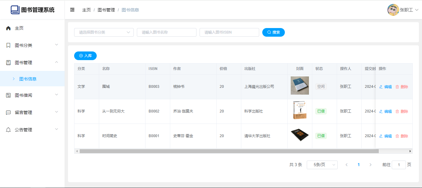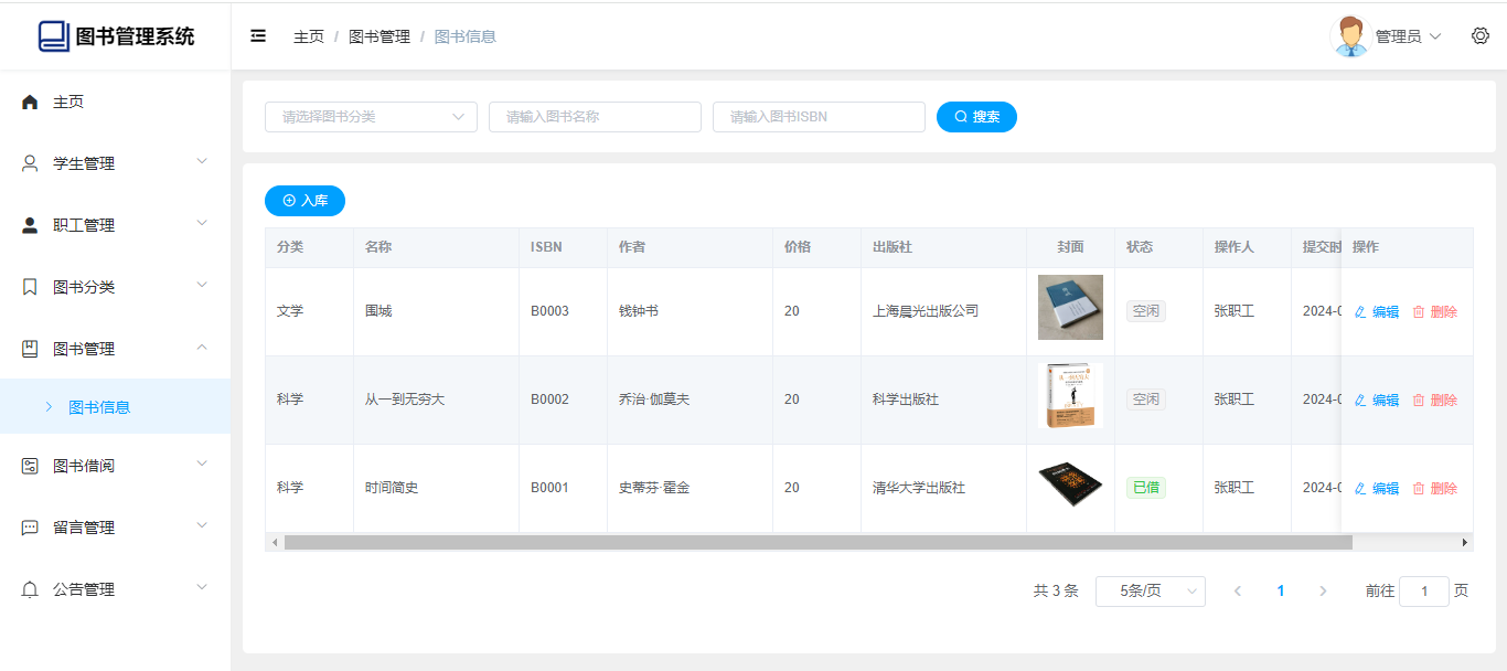 基于SpringBoot+Vue前后端分离的图书管理系统(源码+文档),系统包含管理员、图书管理员(员工)、用户(学生)角色,功能如下:
