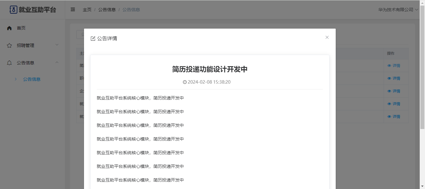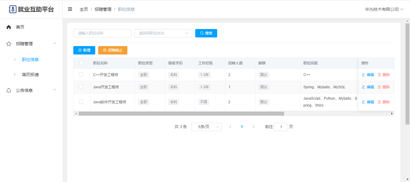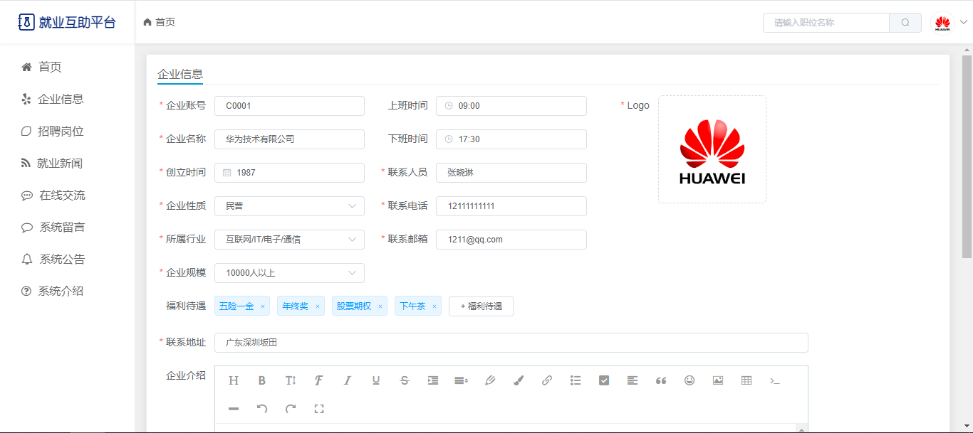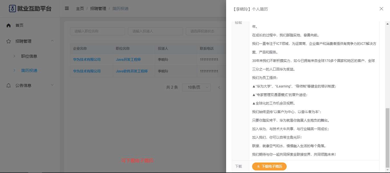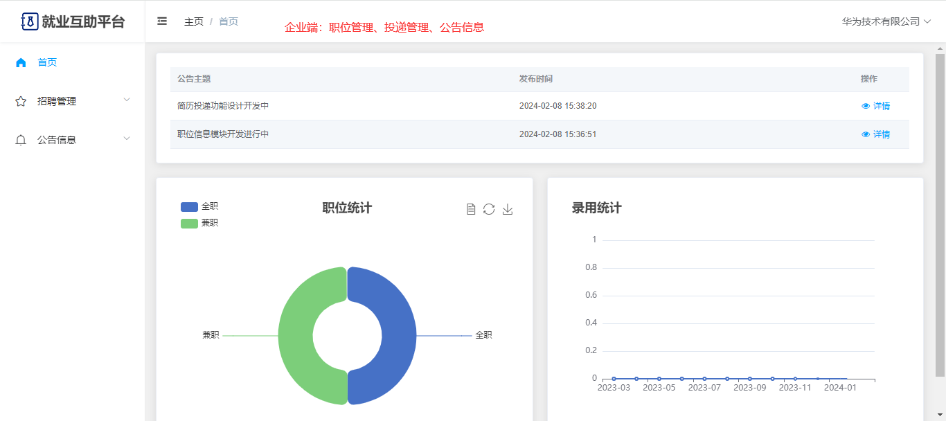 企业:可以查看前台的一些数据展示,有独立后台,可以管理企业的职位信息、可以管理简历投递(查看简历、录用);公告信息;修改企业资料、修改密码。