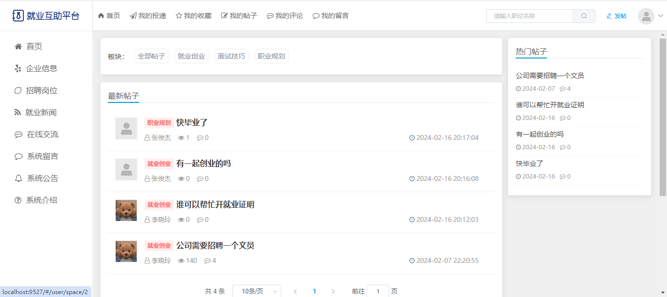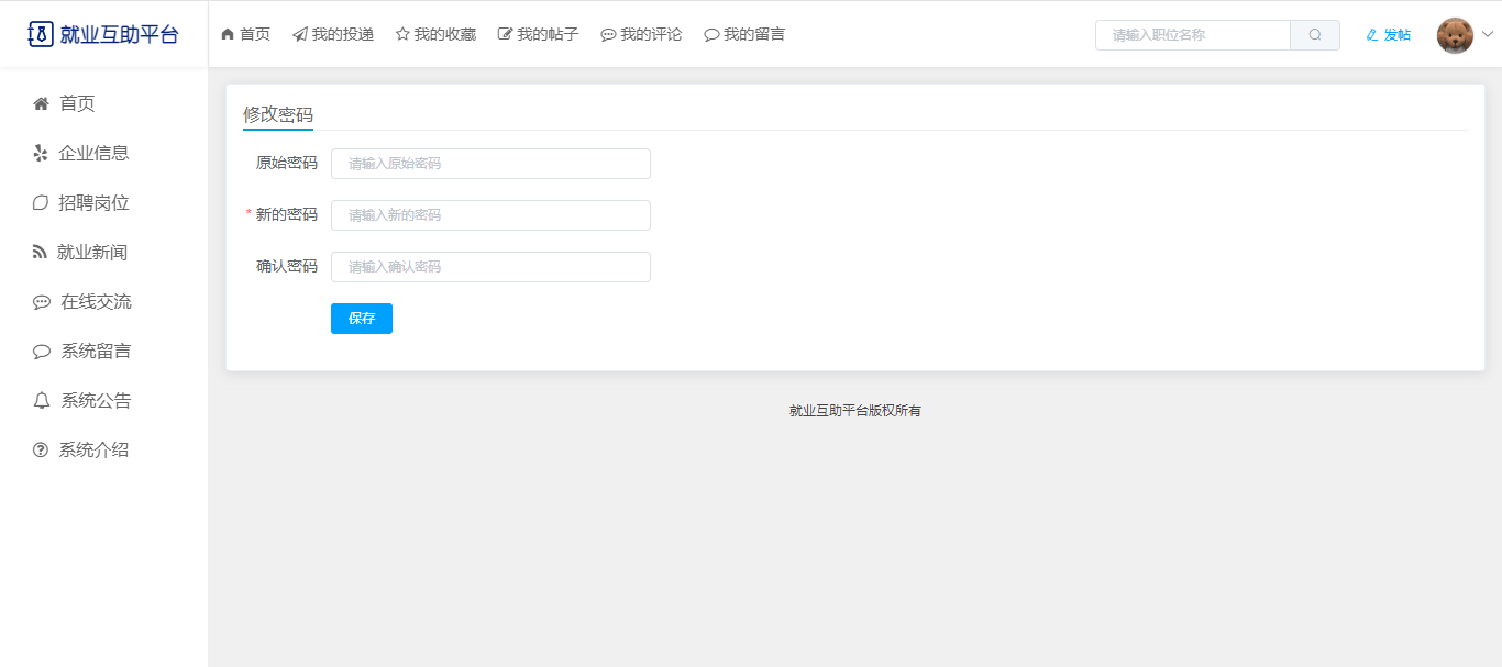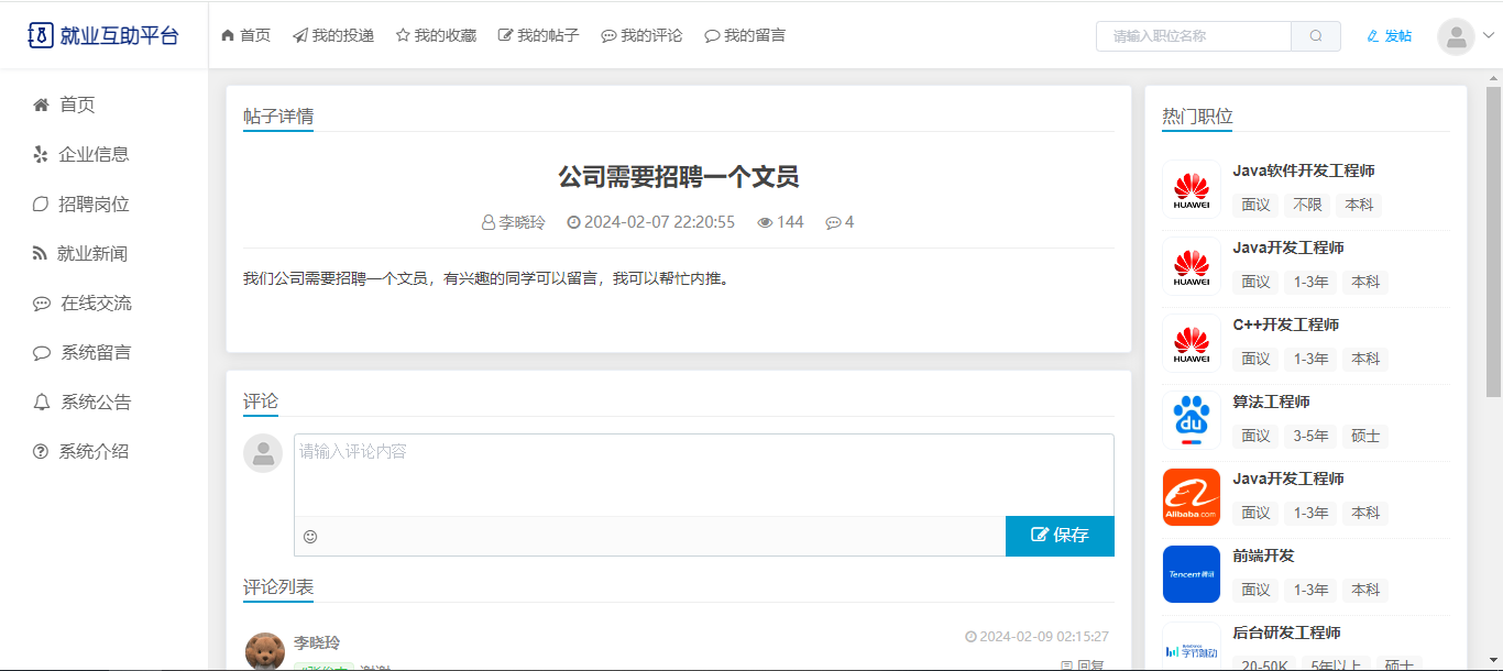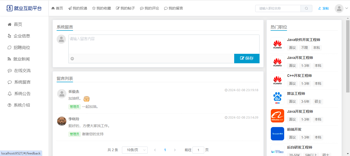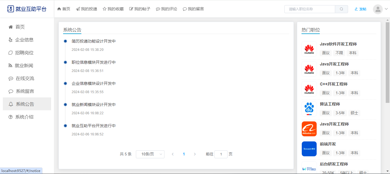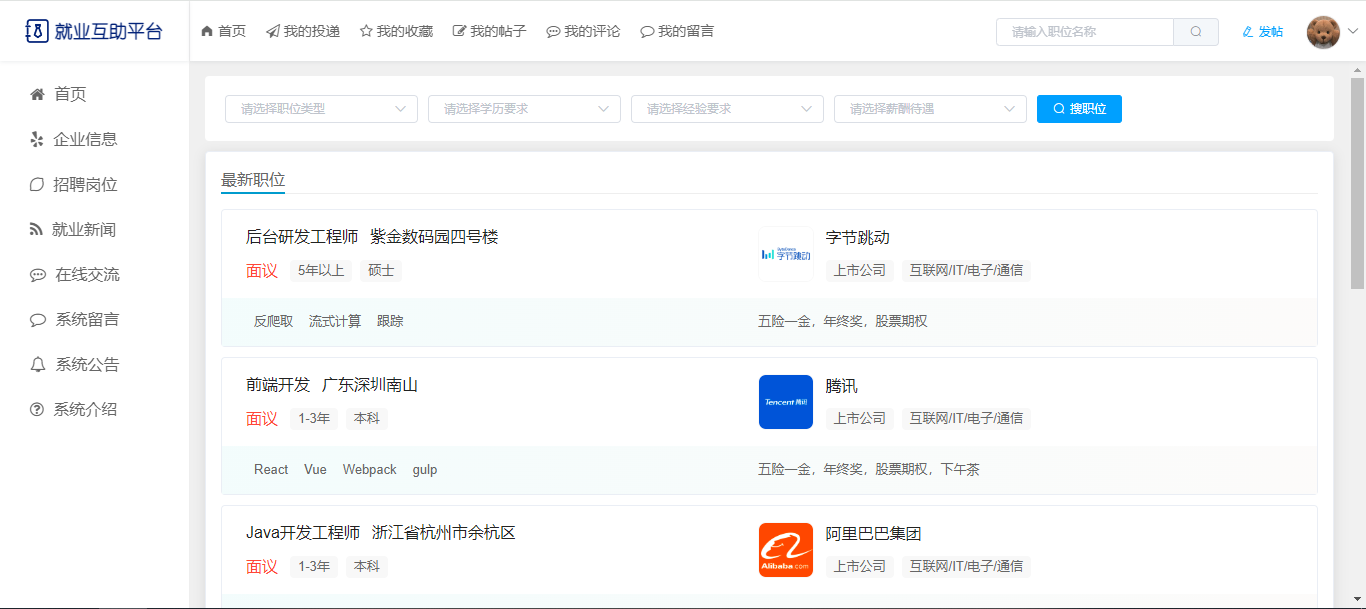 基于SpringBoot+Vue前后端分离的就业互助平台,本人原创开发。