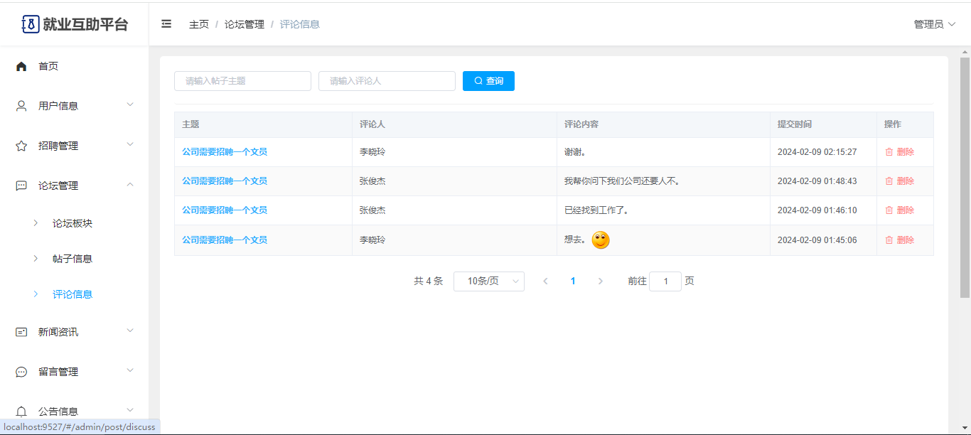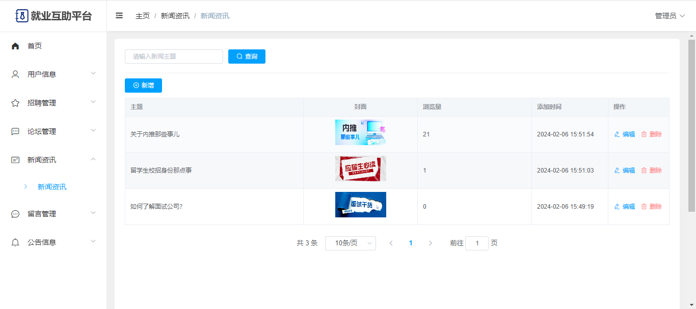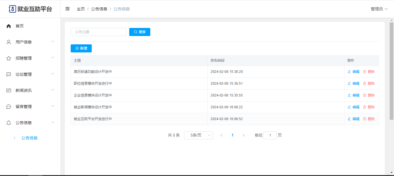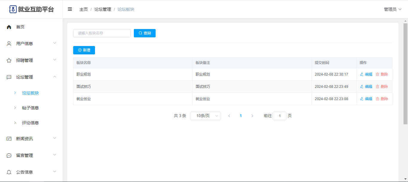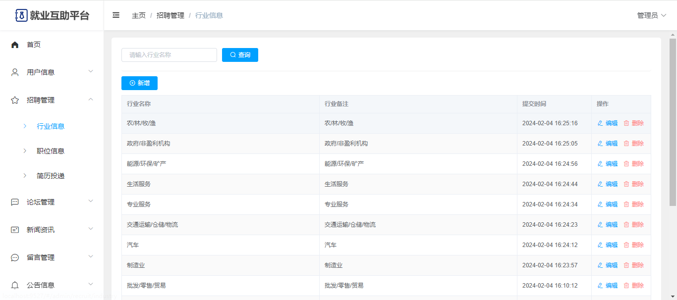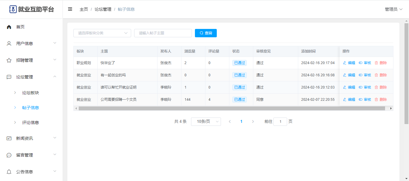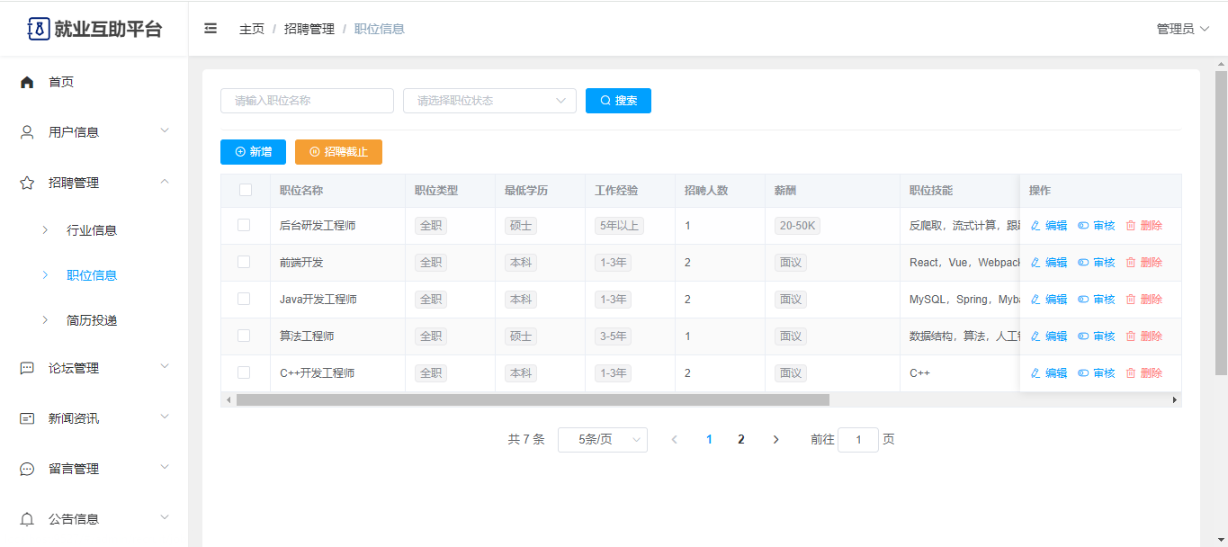 基于Springboot+Vue前后端分离的就业互助平台,系统包含管理员、用户角色,功能如下: