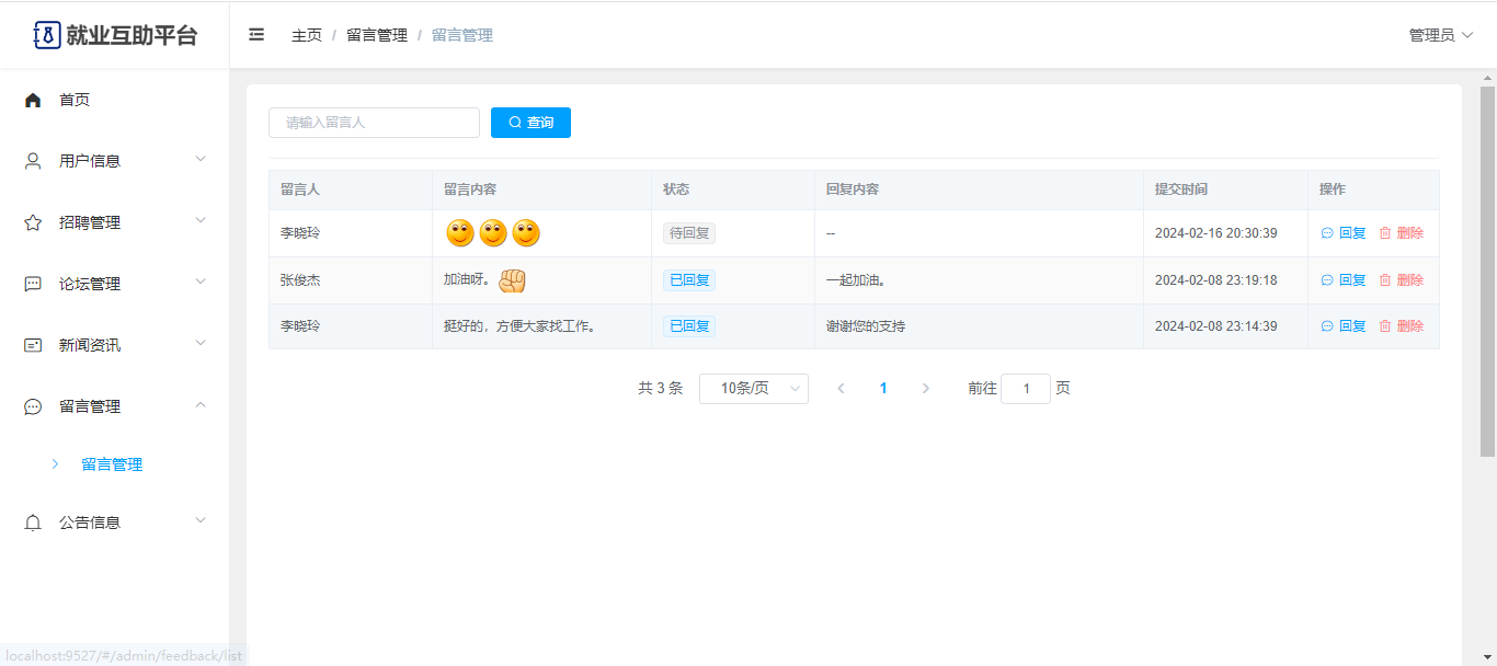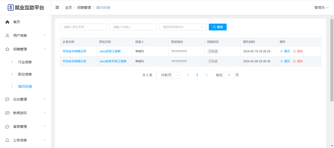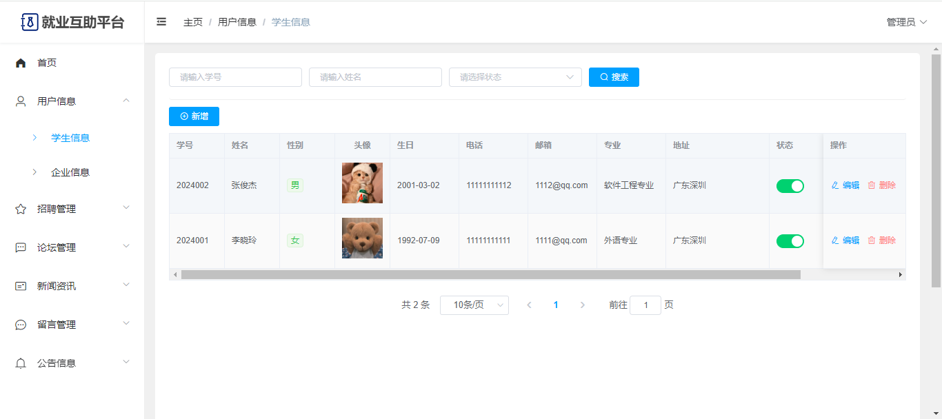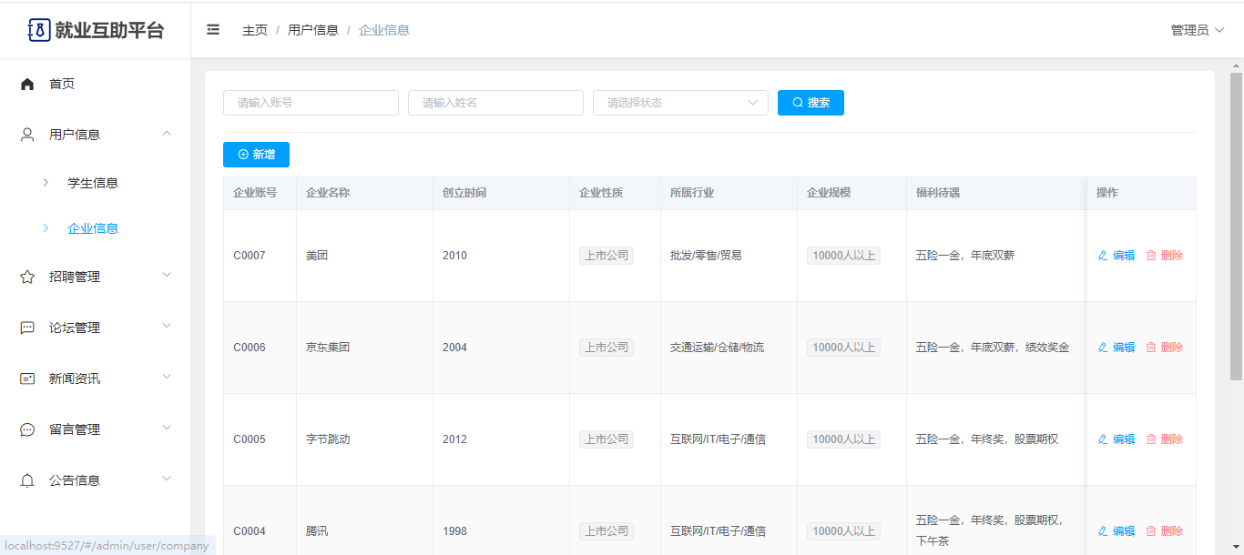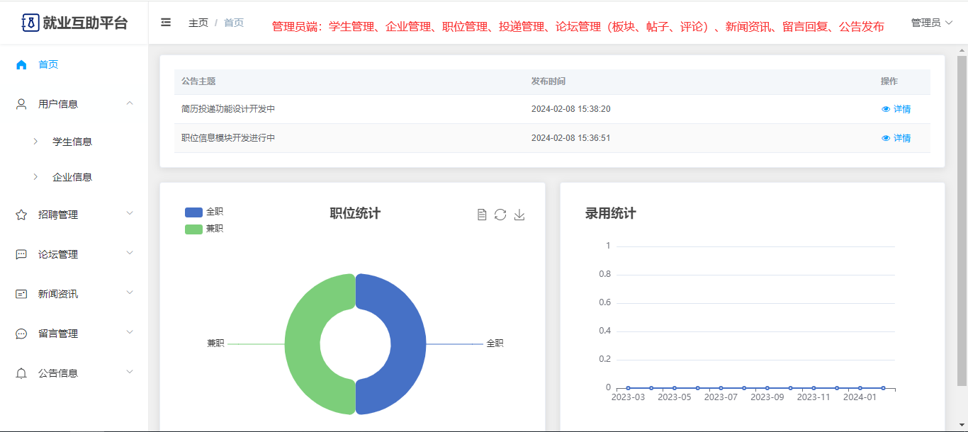 管理员:可以查看前台的一些数据展示;有独立后台,可以查看首页统计;用户管理(学生信息、企业信息);招聘管理(行业信息、职位信息、简历投递);论坛管理(板块、帖子、评论);新闻资讯;留言管理;系统公告;修改个人信息、修改密码。