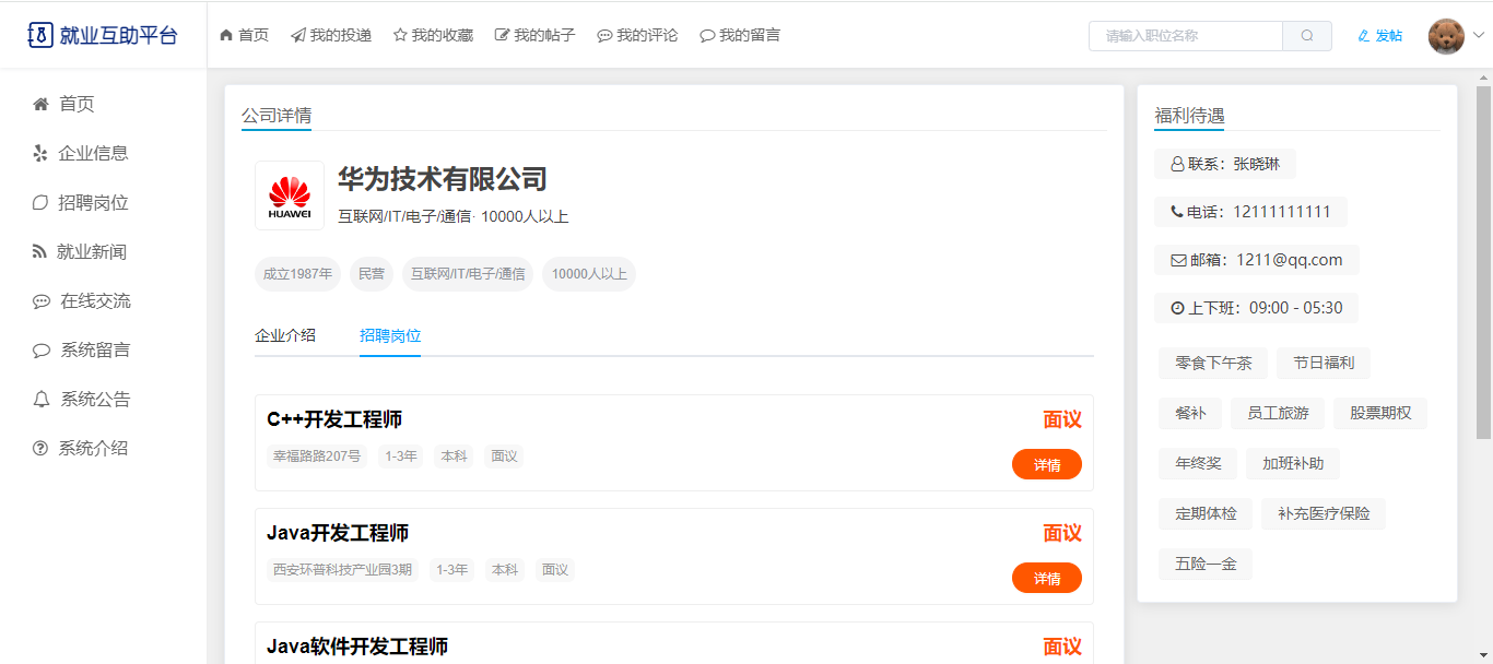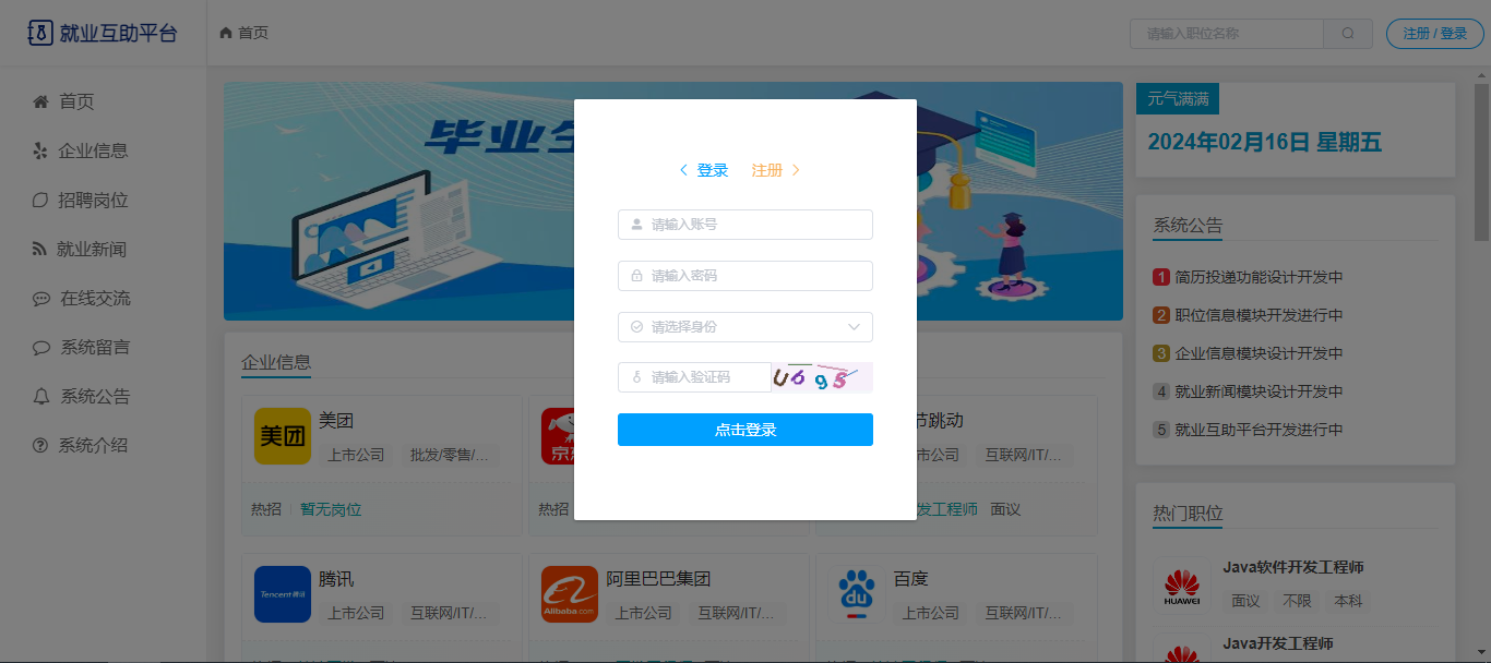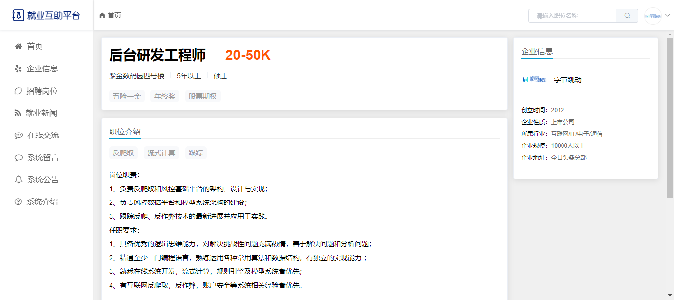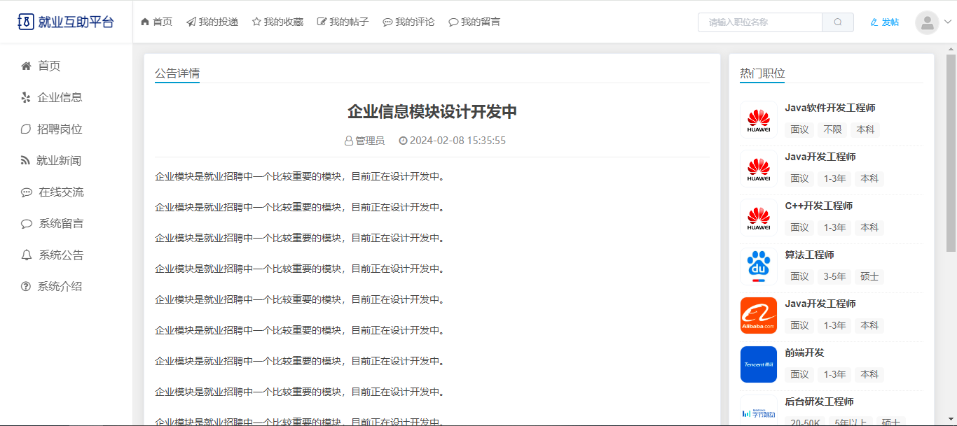 用户:注册、登录;首页,企业信息(企业详细信息、企业下招聘岗位列表);招聘岗位(条件查询职位列表、职位信息、收藏、投递职位);就业新闻;在线交流(按板块查看帖子、帖子详情、评论帖子);系统留言;系统公告;系统介绍。