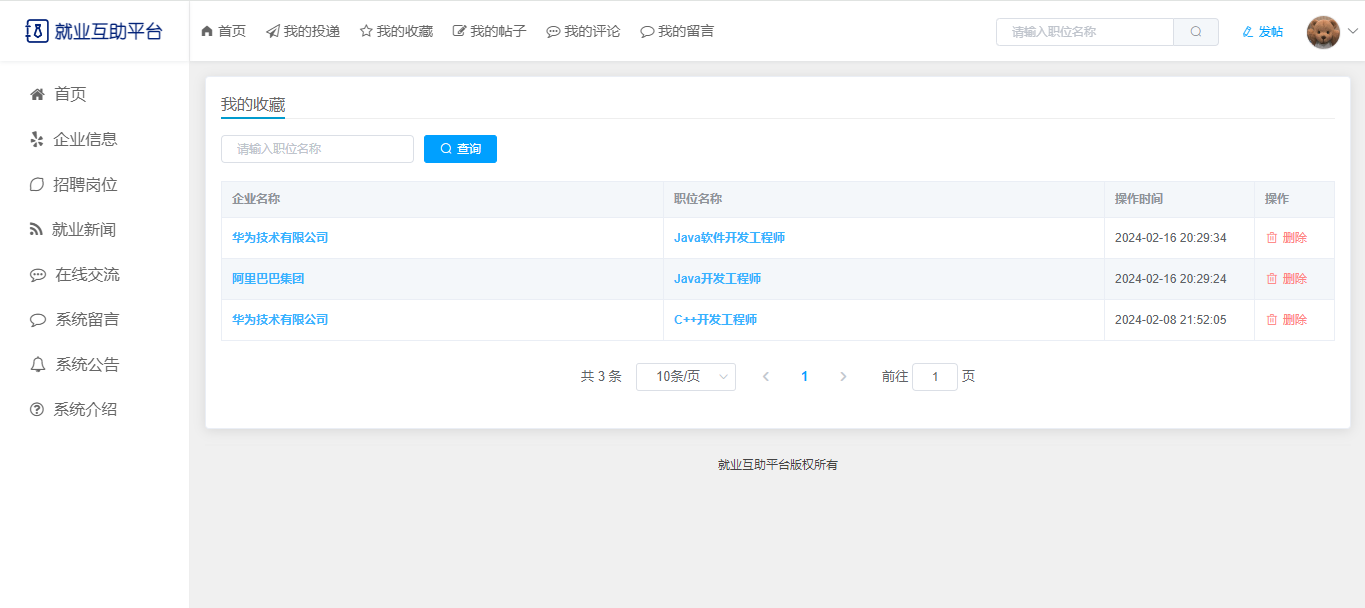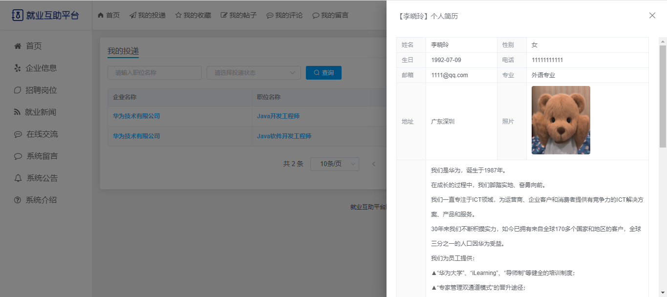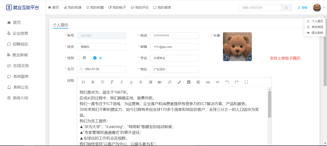 用户个人中心:我的投递、我的收藏、我的帖子、我的评论(发布帖子)、我的留言、个人简历(可上传电子简历)、修改密码。
