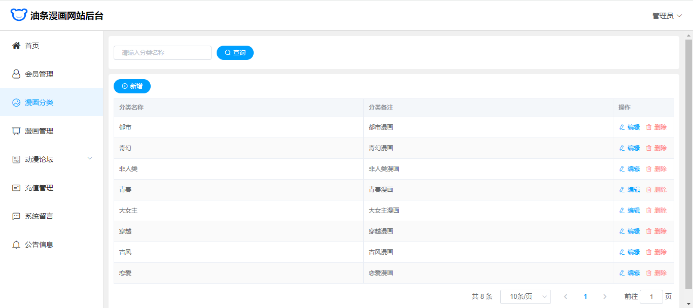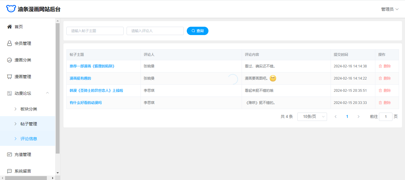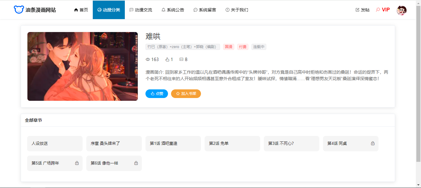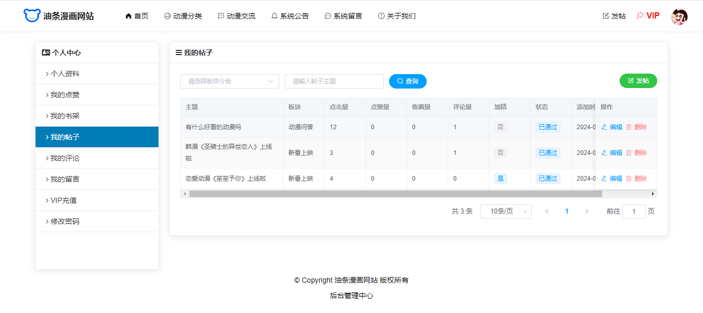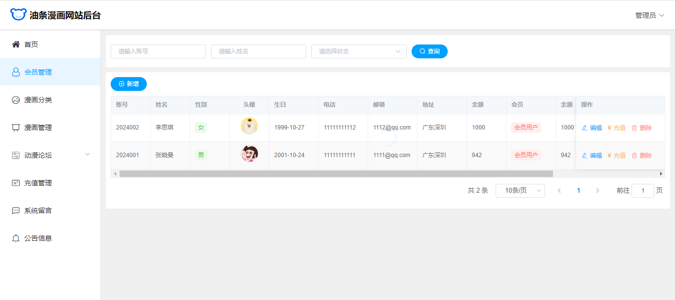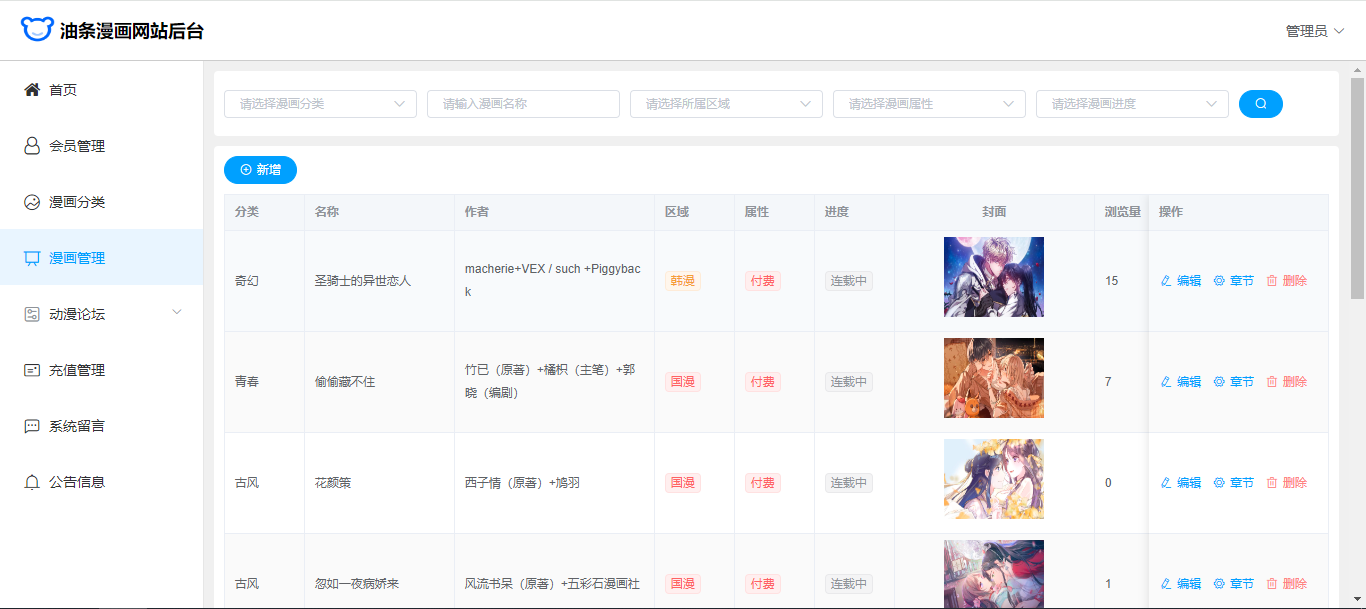 基于SpringBoot+Vue前后端分离的漫画网站(源码+文档),系统包含管理员、会员用户角色,功能如下: