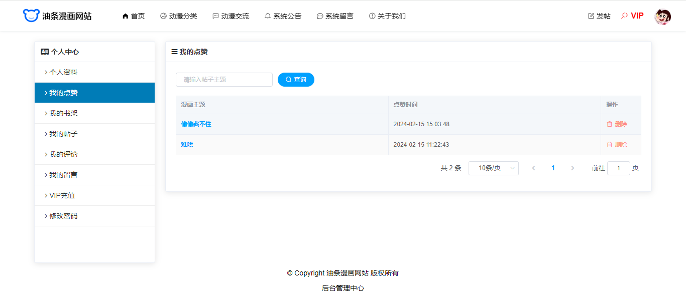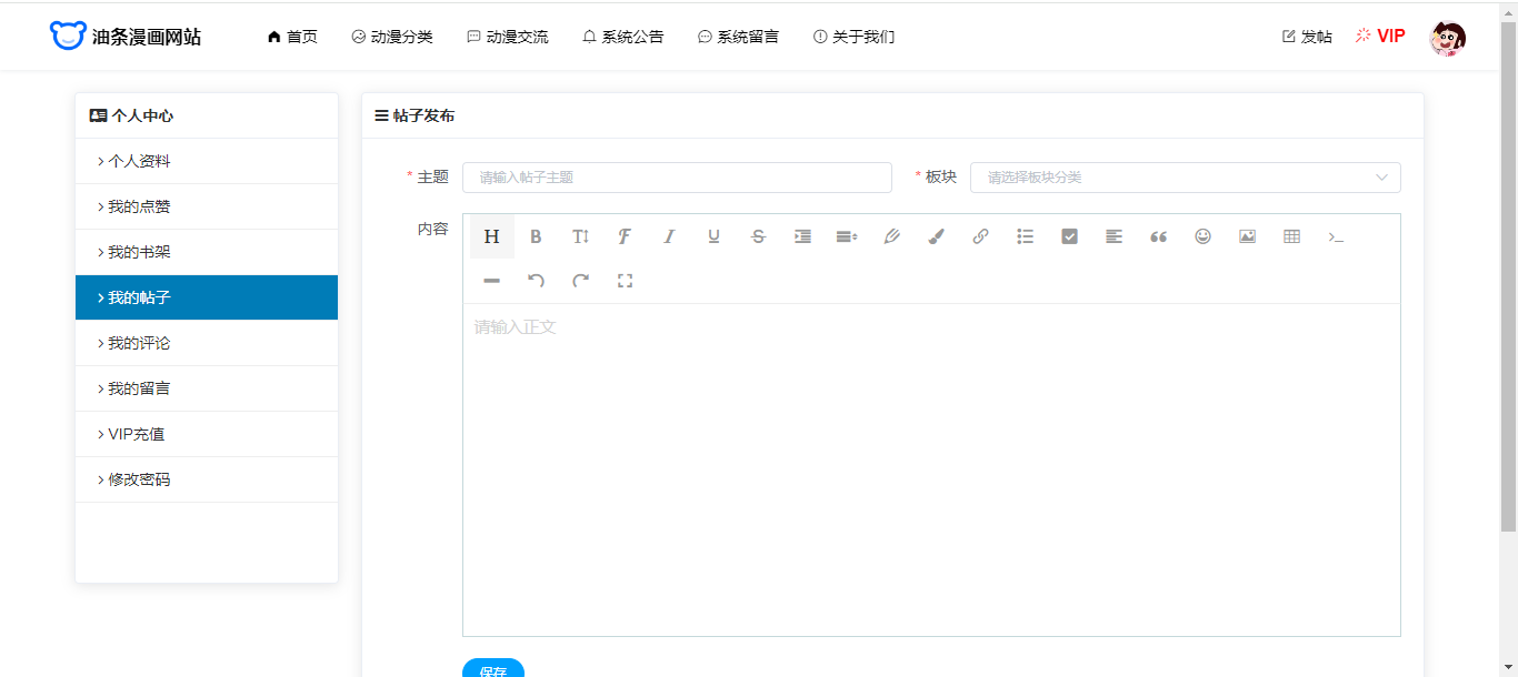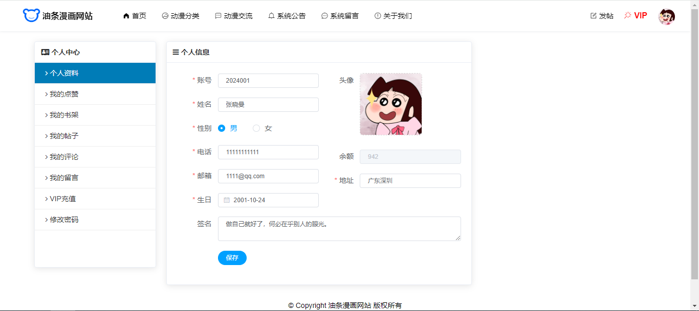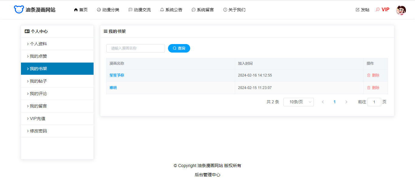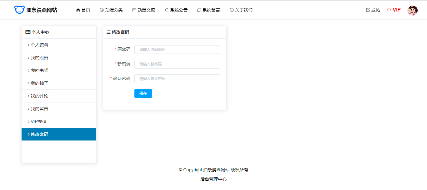 用户还具有个人中心功能,个人信息修改、密码修改、我的点赞、我的书架、我的帖子(发帖)、我的评论、我的留言、VIP充值。