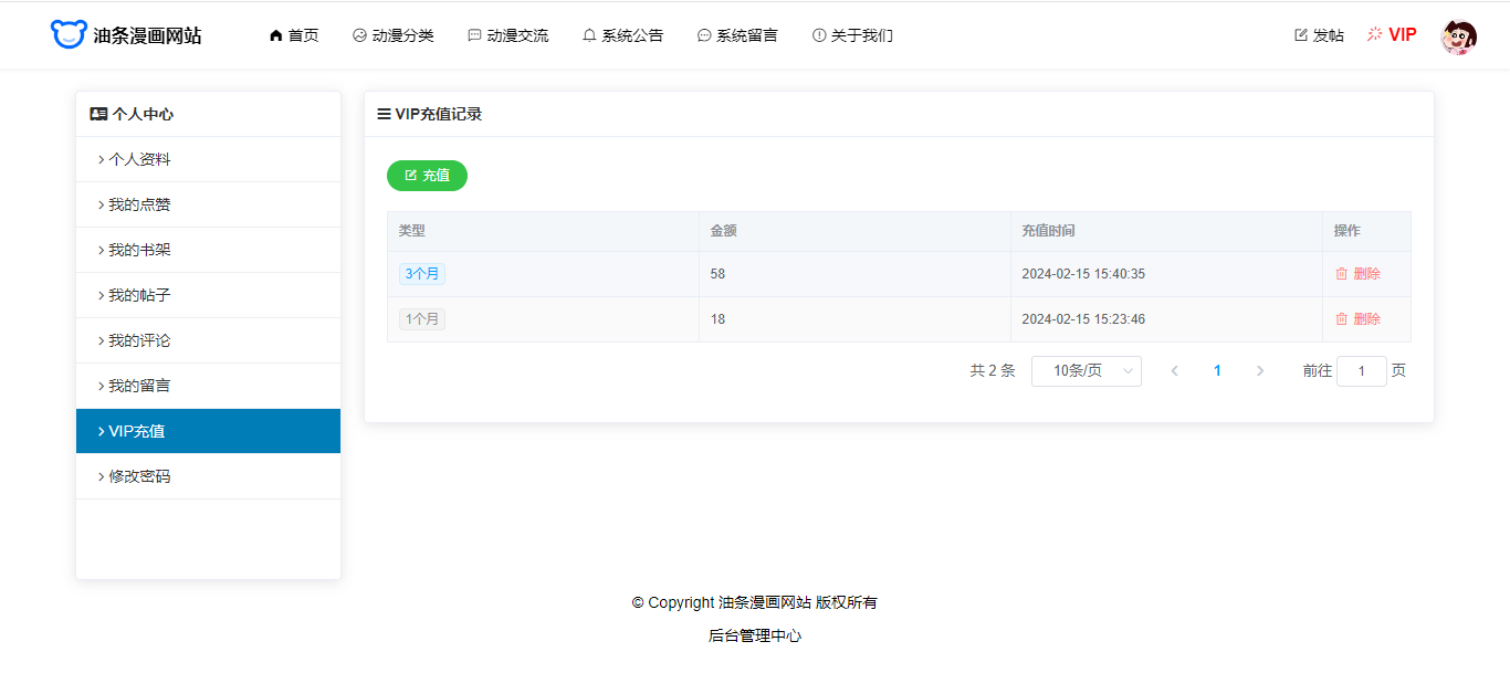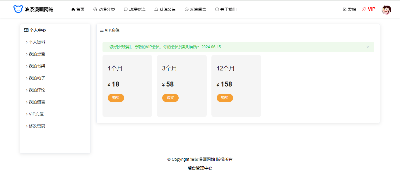 本系统还加入了会员功能、用户可以购买充值VIP,成为VIP之后可以观看VIP章节,VIP多次购买之后,有效期叠加。