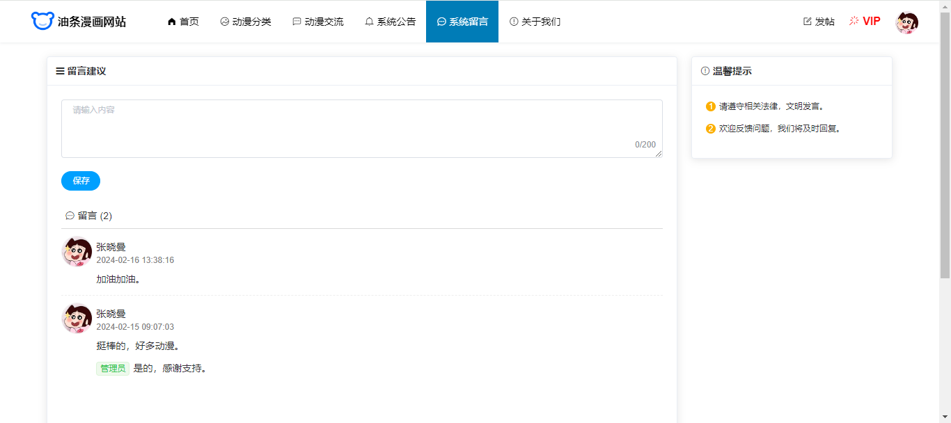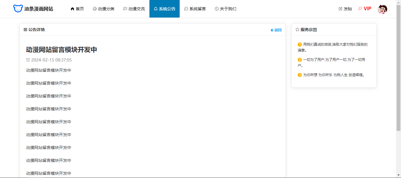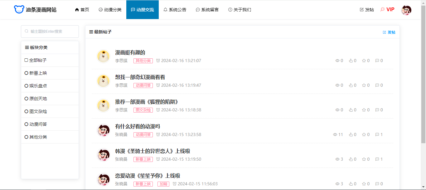 用户:注册、登录;首页,动漫分类(按条件搜索查询漫画、点赞、加入书架);漫画详情(漫画下全部章节、章节详情);动漫交流(查看论坛板块、按板块查看帖子、评论帖子);查看系统公告;系统留言;关于我们。