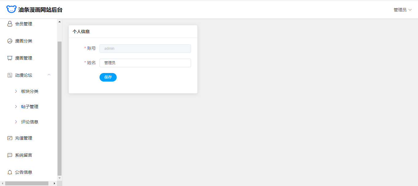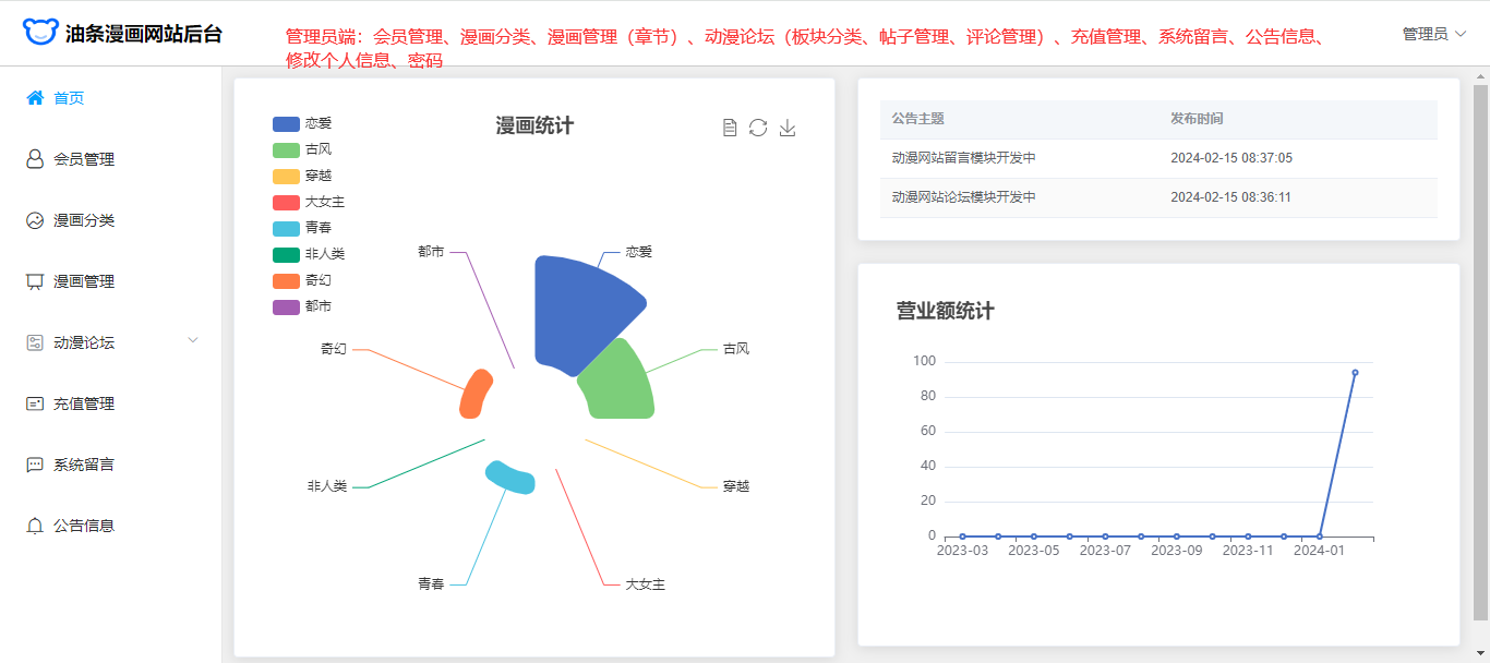 管理员:首页统计;会员管理(充值、账号冻结、解冻);漫画分类;漫画管理(章节);充值管理;系统留言回复;系统公告;修改个人信息、密码。