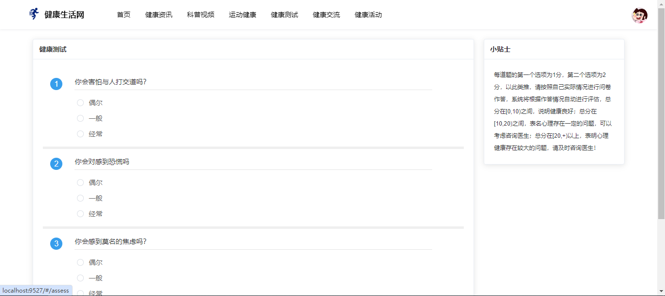 用户:注册、登录;首页,健康资讯(收藏);科普视频(点赞);运动健康视频(可以打卡);健康测试(可以答题);健康交流(发帖);健康活动(报名参加),系统公告
