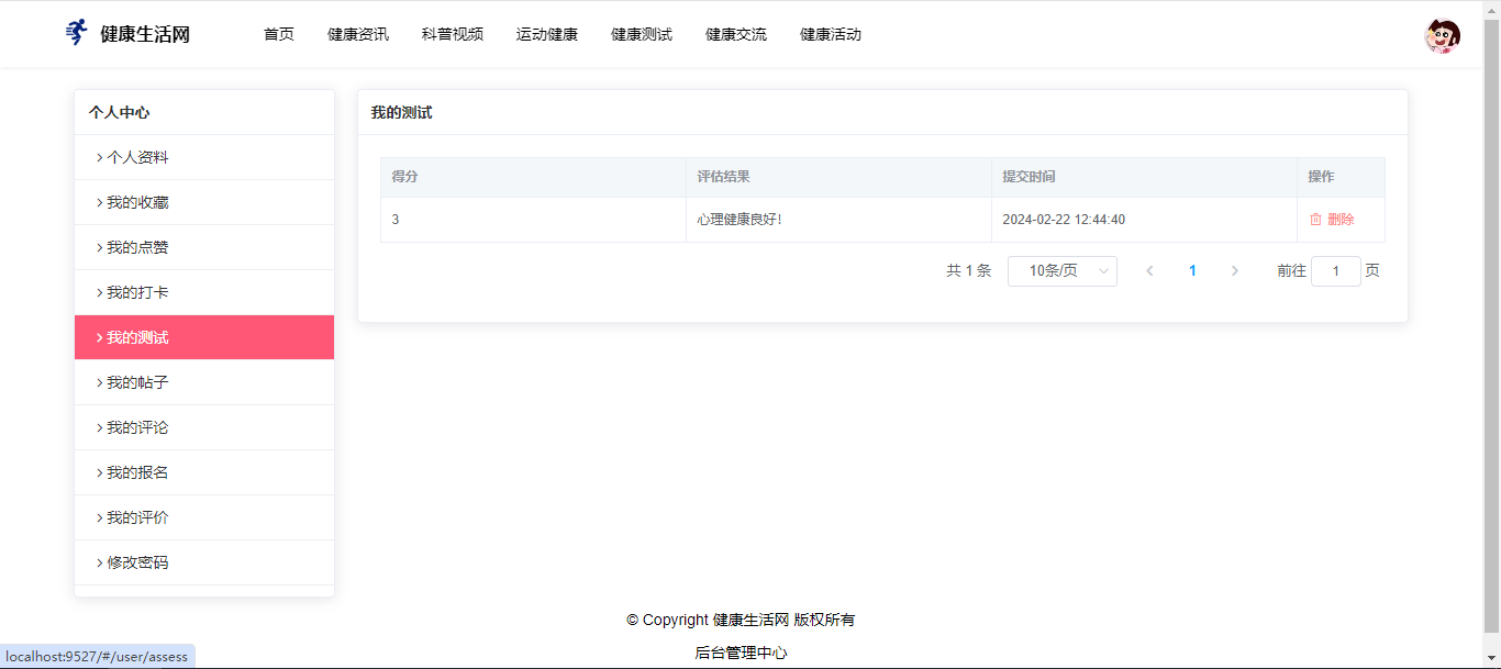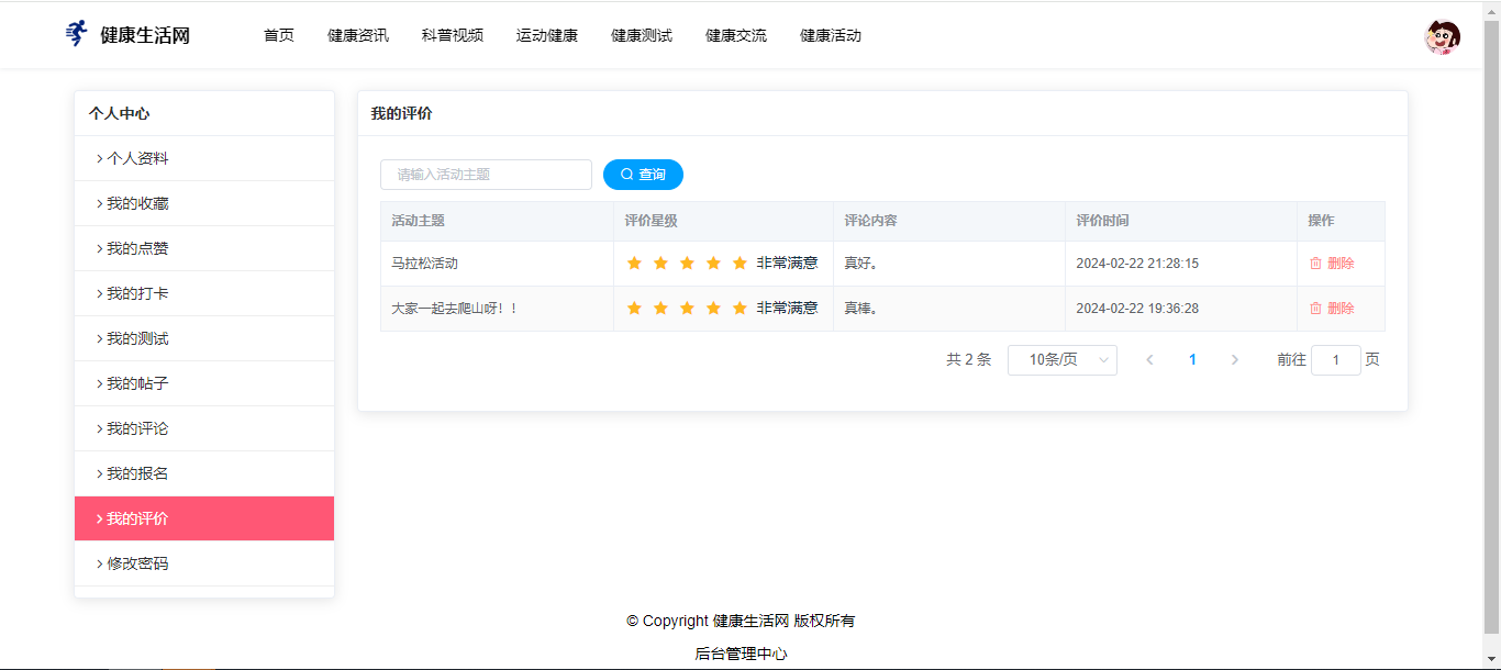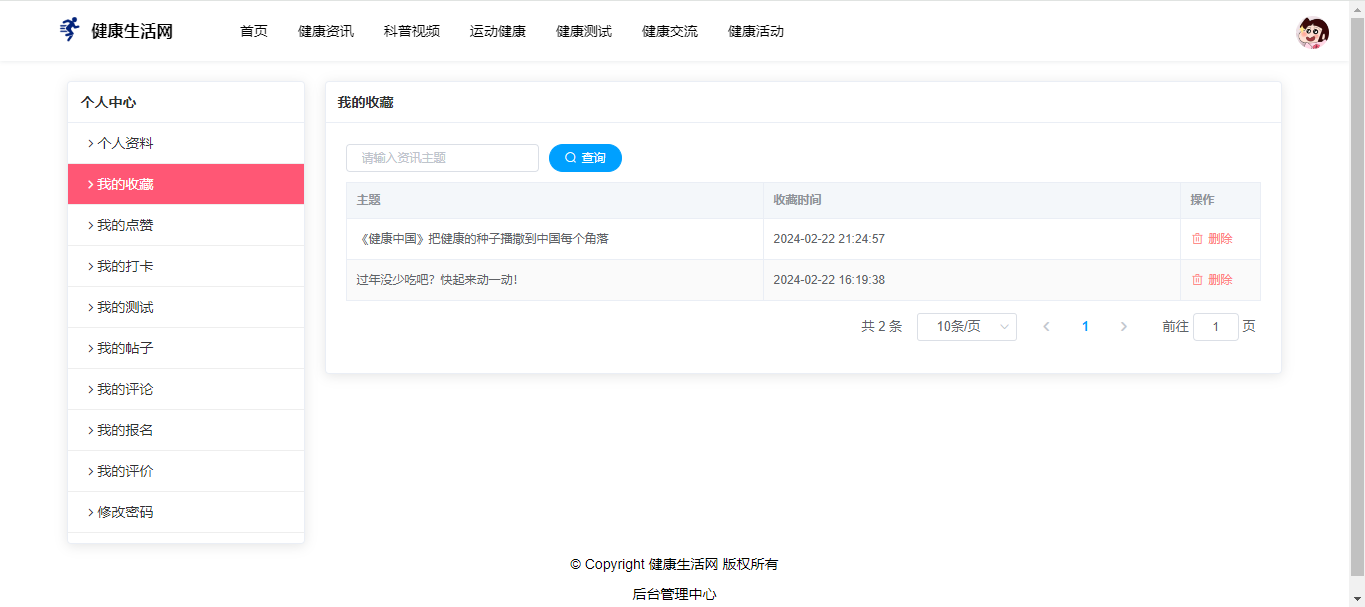 个人中心功能,我的收藏、我的点赞、我的打卡、我的测试、我的帖子、我的评论、我的报名、我的活动评价、个人资料密码修改。