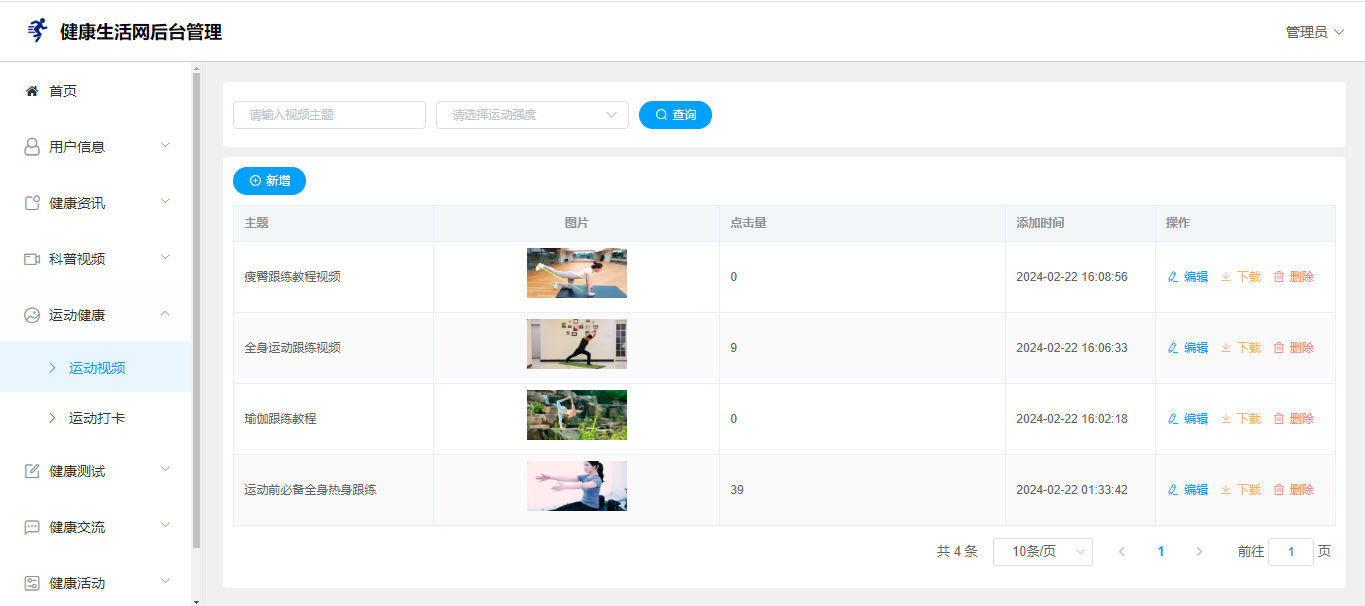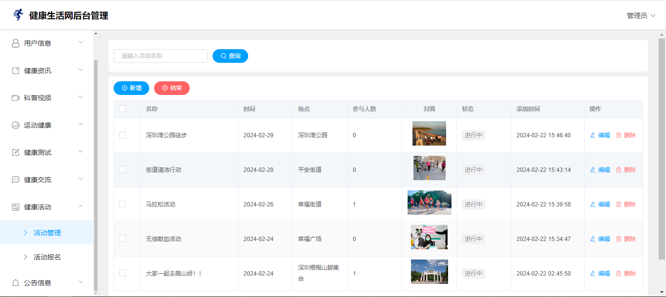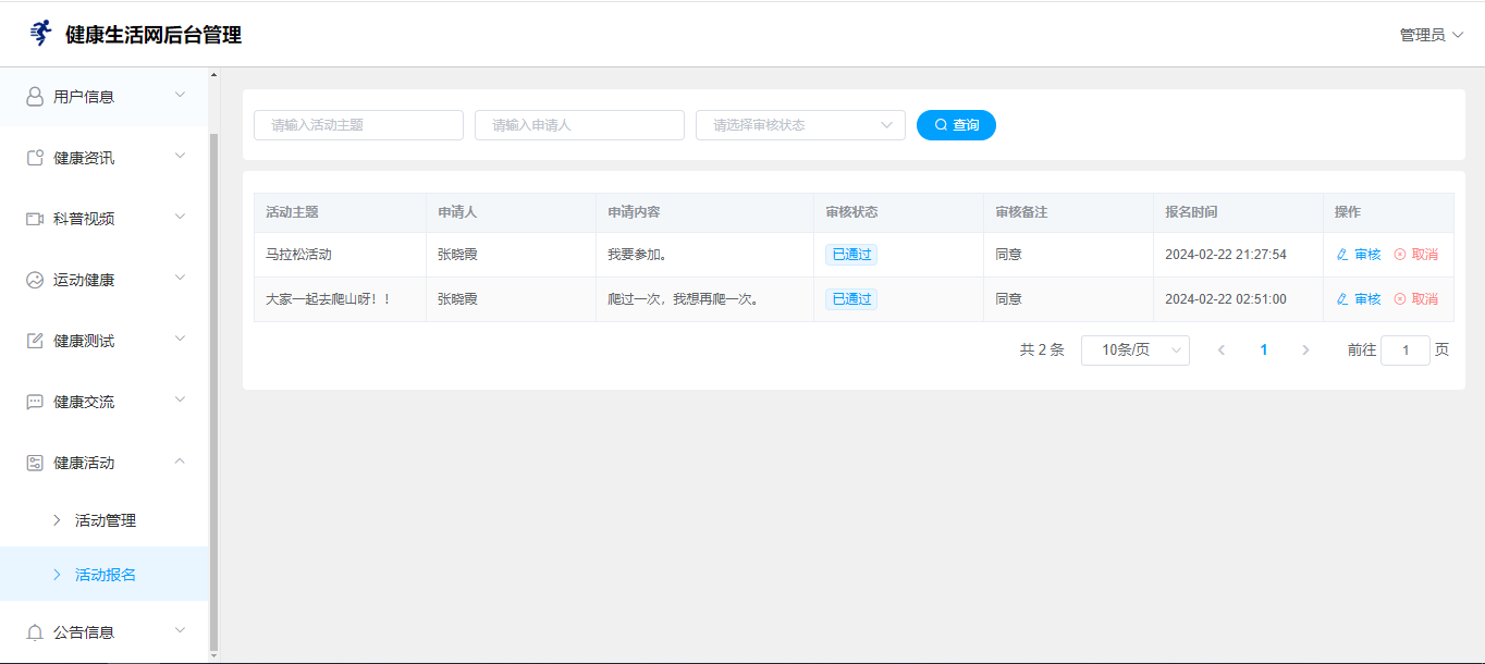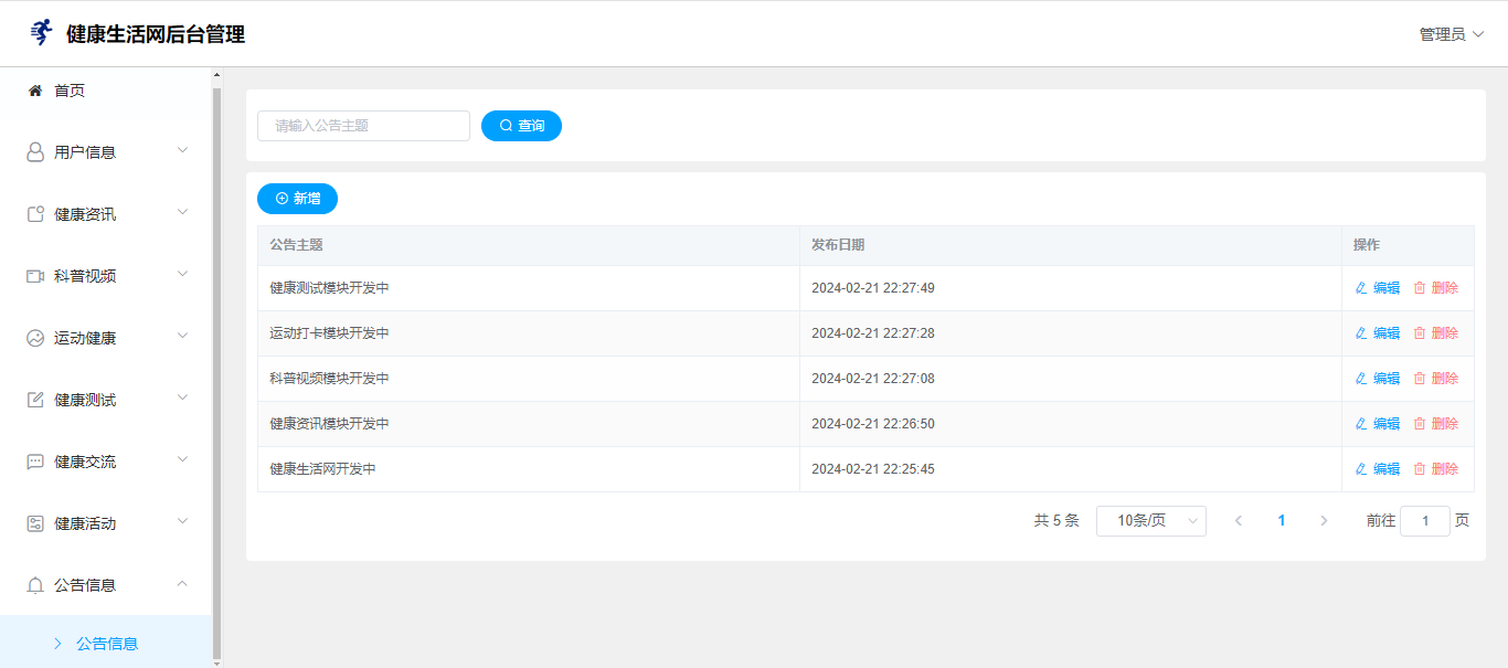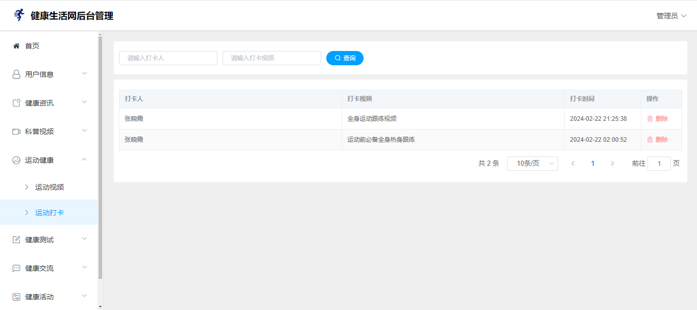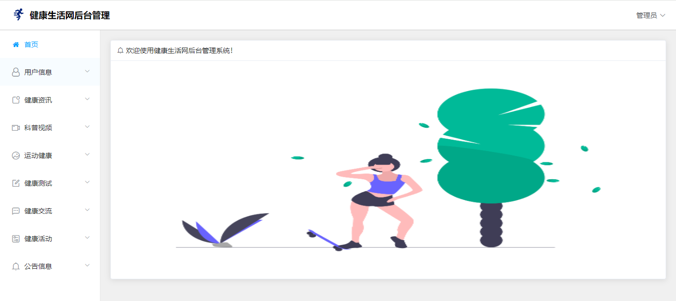 管理员:用户管理;健康资讯管理;科普视频管理;运动健康管理(运动视频、打卡管理);健康测试(题目管理、用户测试);健康交流(帖子管理、评论管理);健康活动(活动管理、活动报名);公告管理;修改个人信息、密码。