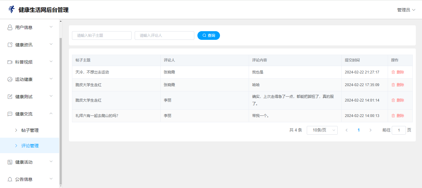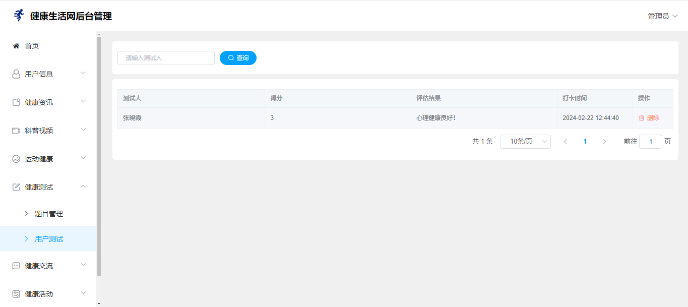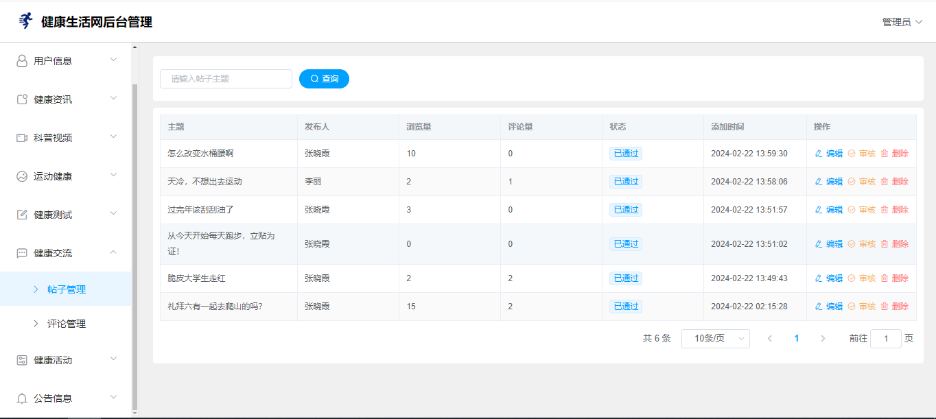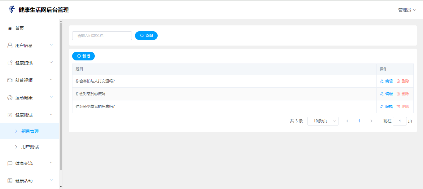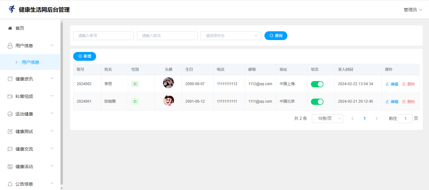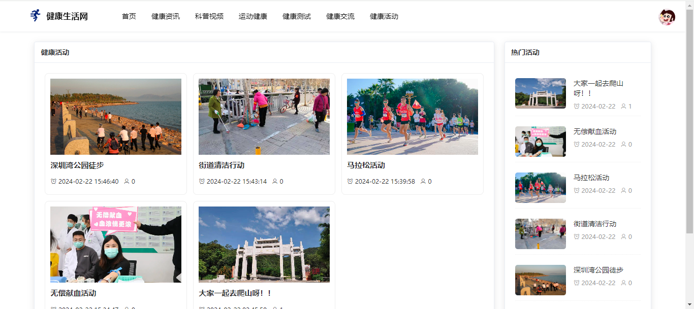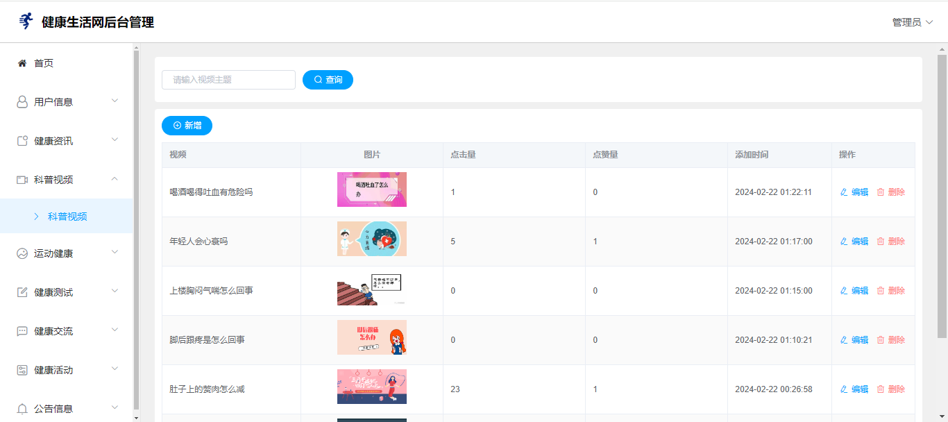 管理员:用户管理;健康资讯管理;科普视频管理;运动健康管理(运动视频、打卡管理);健康测试(题目管理、用户测试);健康交流(帖子管理、评论管理);健康活动(活动管理、活动报名);公告管理;修改个人信息、密码。