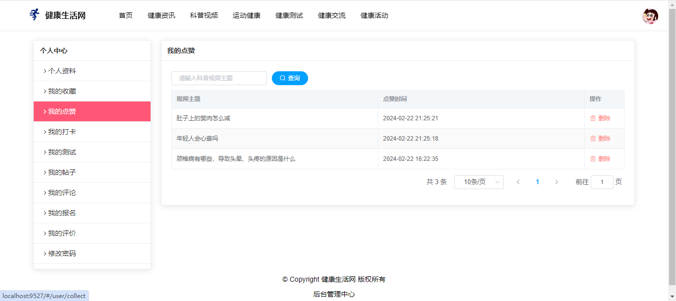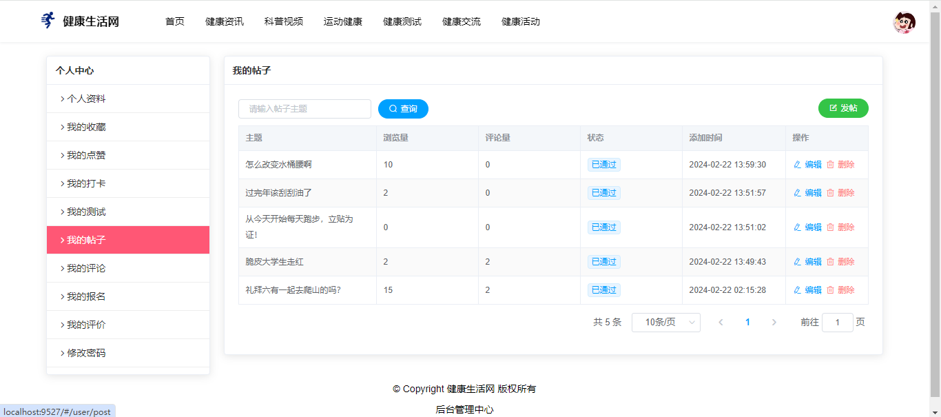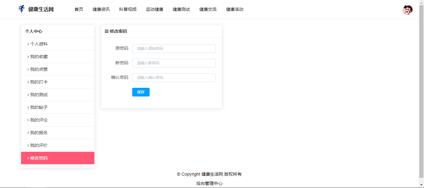 基于SpringBoot+Vue前后端分离的健康生活网(源码+文档),系统包含管理员、用户角色,功能如下: