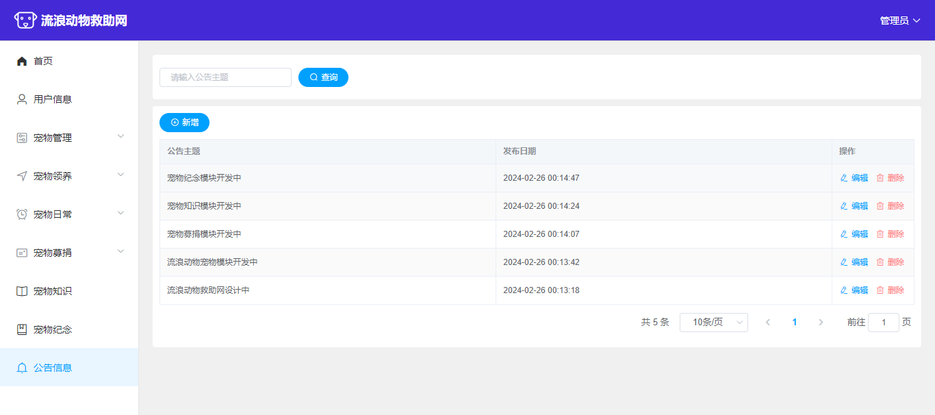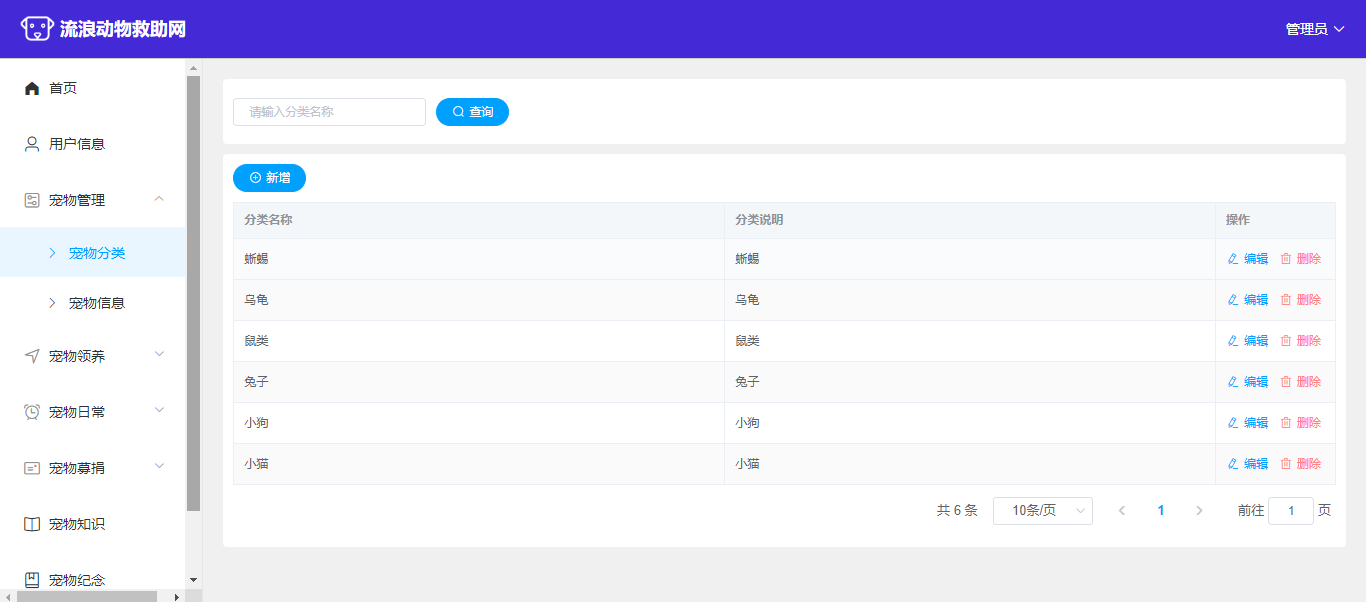 管理员:用户管理;宠物管理(分类、宠物信息);宠物领养(审核、回访);宠物日常(日常管理、评论管理);宠物募捐(募捐管理、捐赠记录);宠物知识;宠物纪念;修改个人信息、密码。