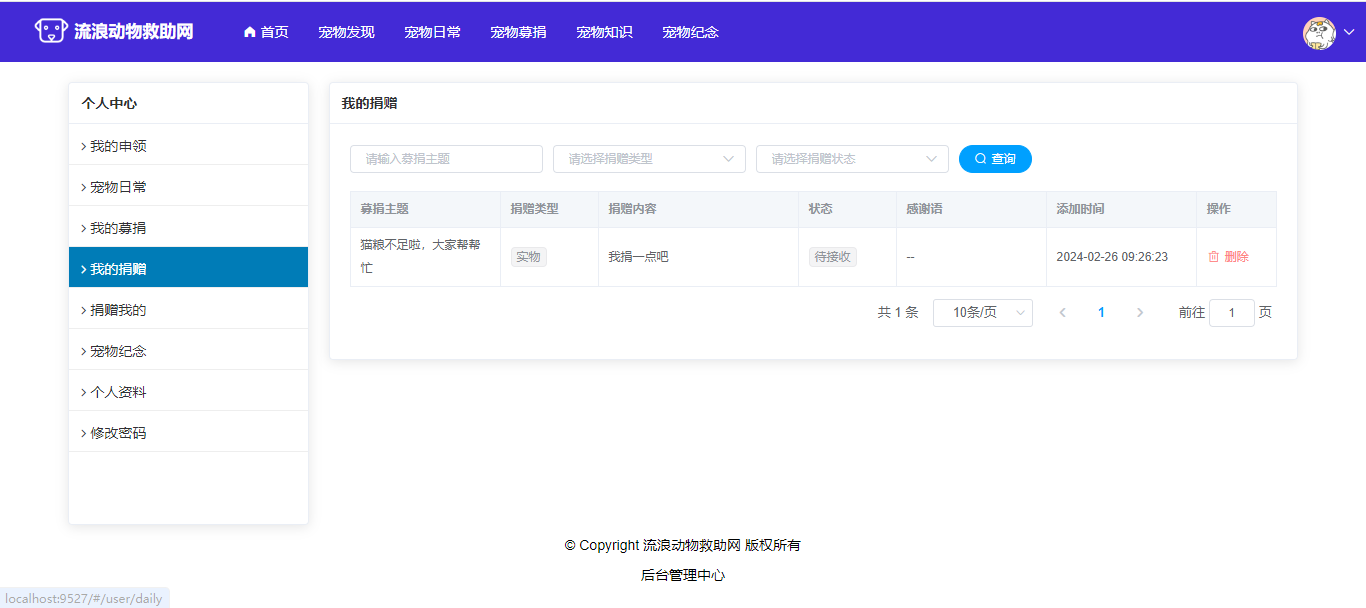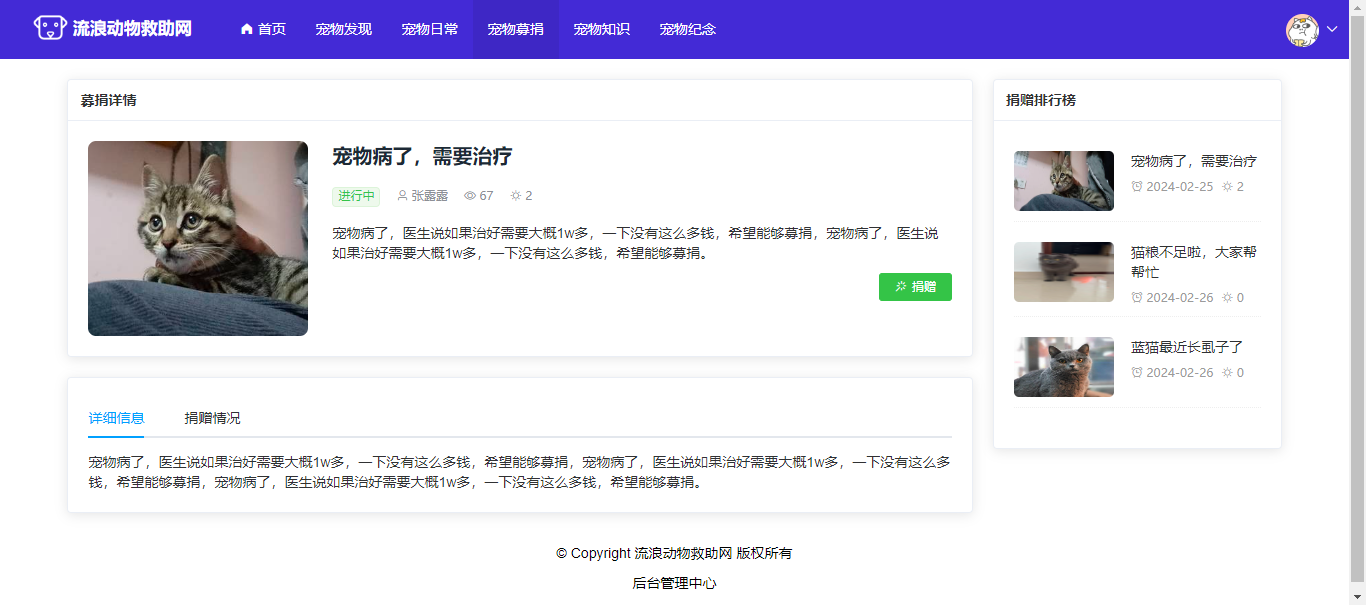 基于SpringBoot+Vue前后端分离的流浪动物救助网(源码+文档),本人原创开发。