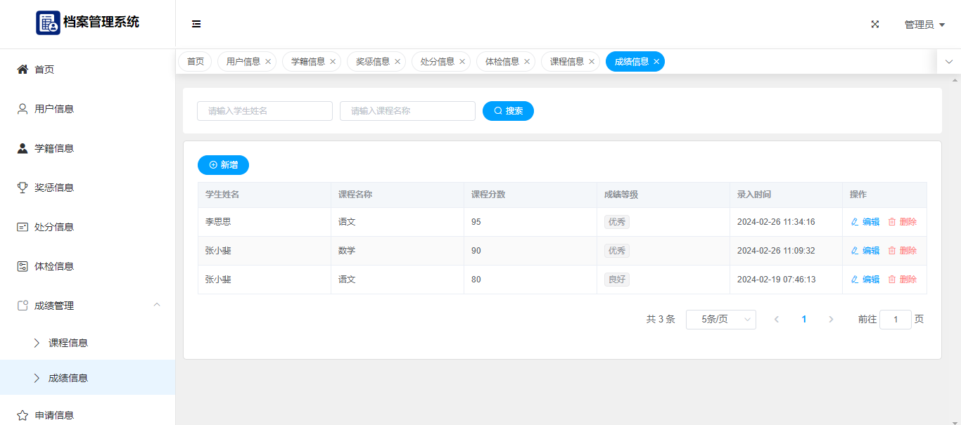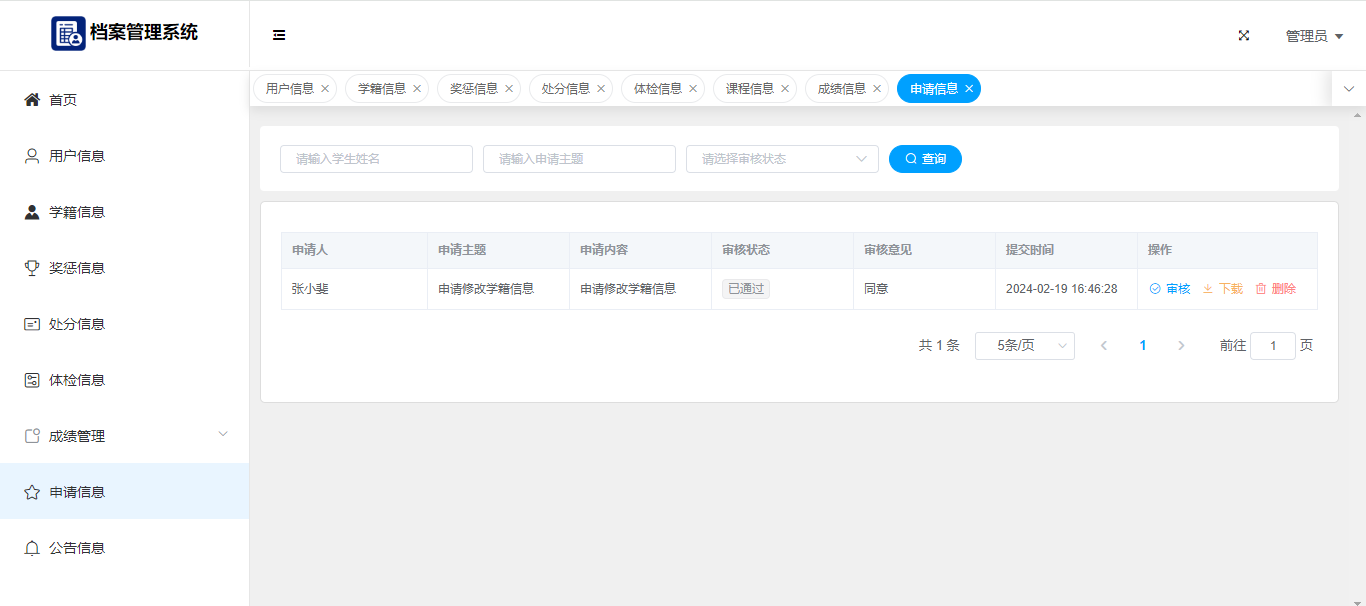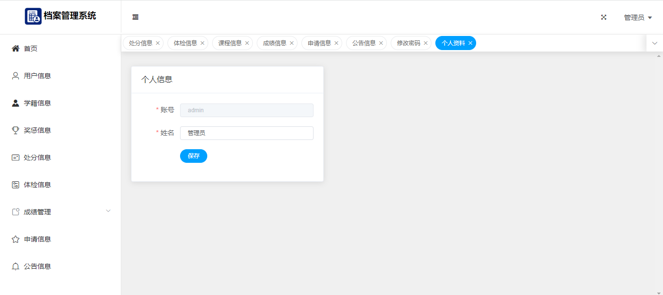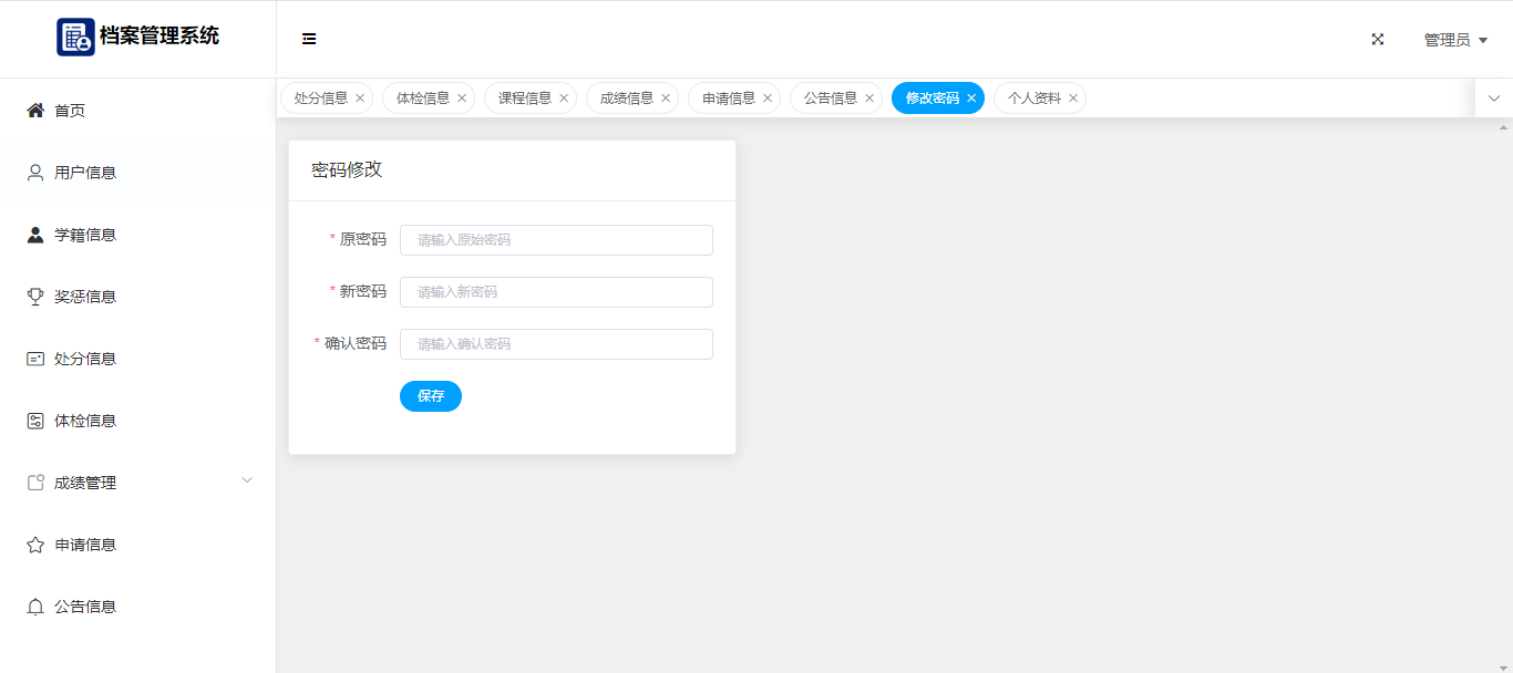 管理员:首页、用户管理;学籍管理;奖惩管理;处分管理;体检信息管理;成绩管理(课程管理、成绩管理)、申请管理(修改、提取);公告管理;修改个人信息、密码。