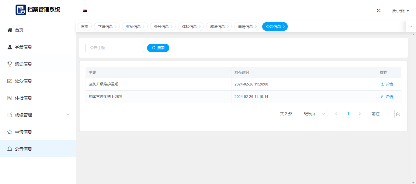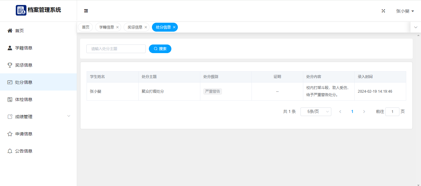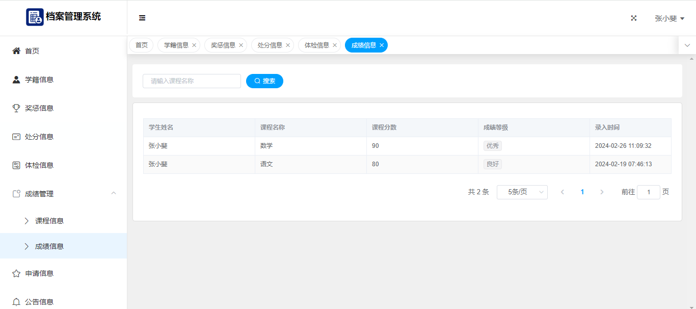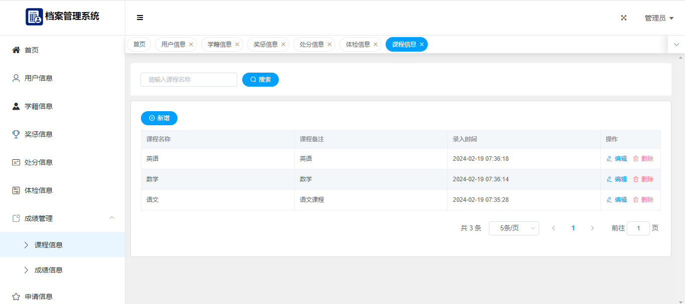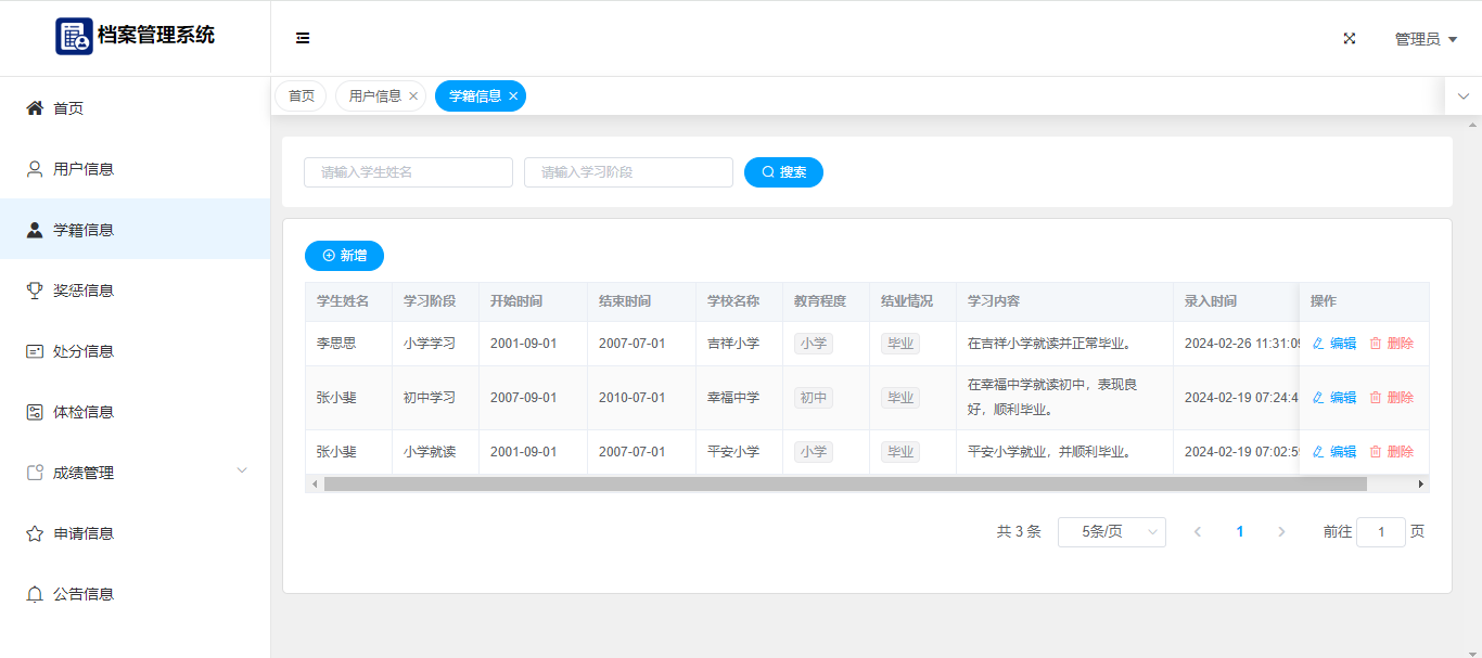 管理员:首页、用户管理;学籍管理;奖惩管理;处分管理;体检信息管理;成绩管理(课程管理、成绩管理)、申请管理(修改、提取);公告管理;修改个人信息、密码。