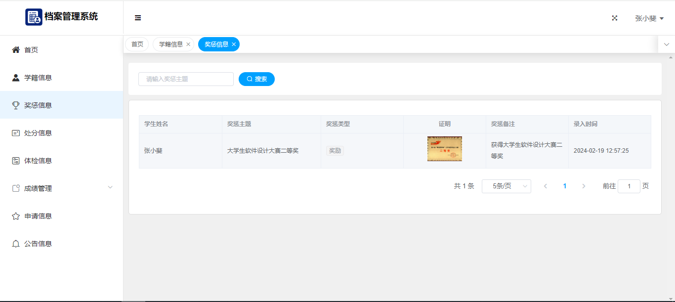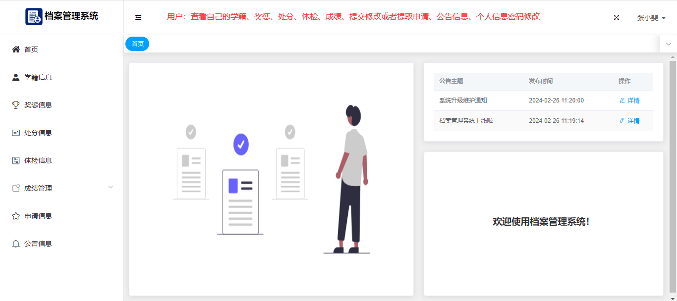 用户:注册、登录;首页,可以查看学籍信息、奖惩信息、处分信息、体检信息、成绩信息(课程、成绩)、提交申请(修改和提取申请)、公告信息;个人信息密码修改。