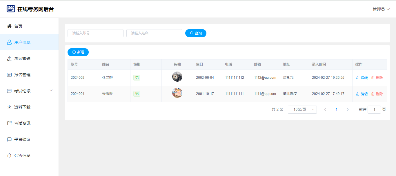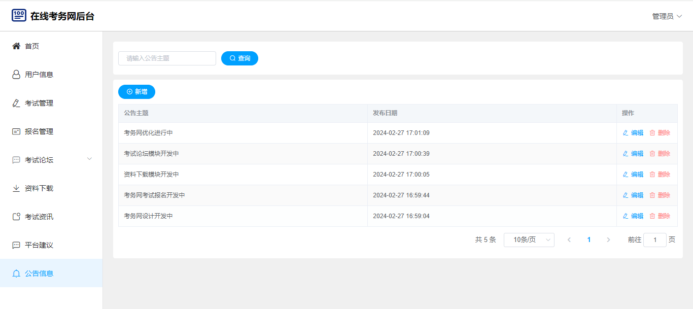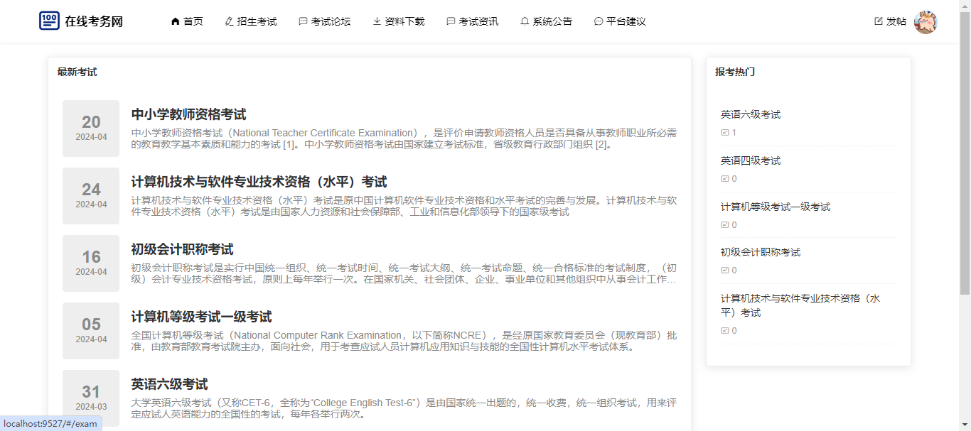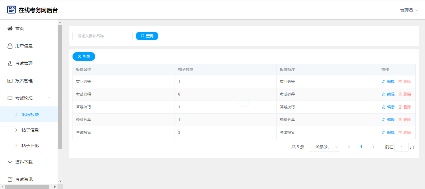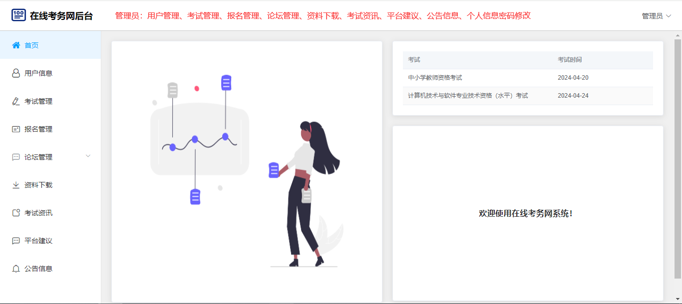 管理员:首页、用户管理;考试管理;报名管理;考试论坛(板块、帖子、评论);资料下载;考试资讯;平台建议;公告管理;修改个人信息、密码。