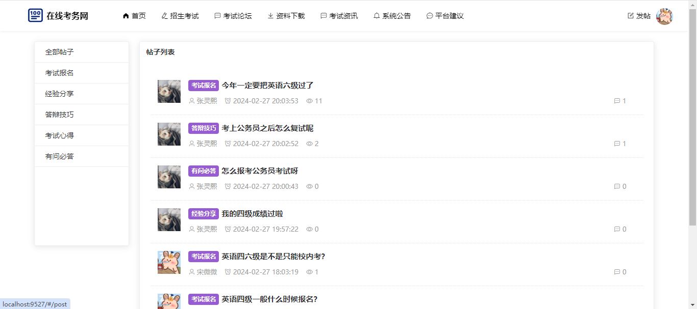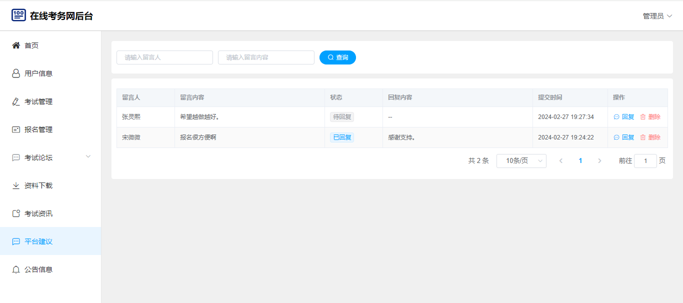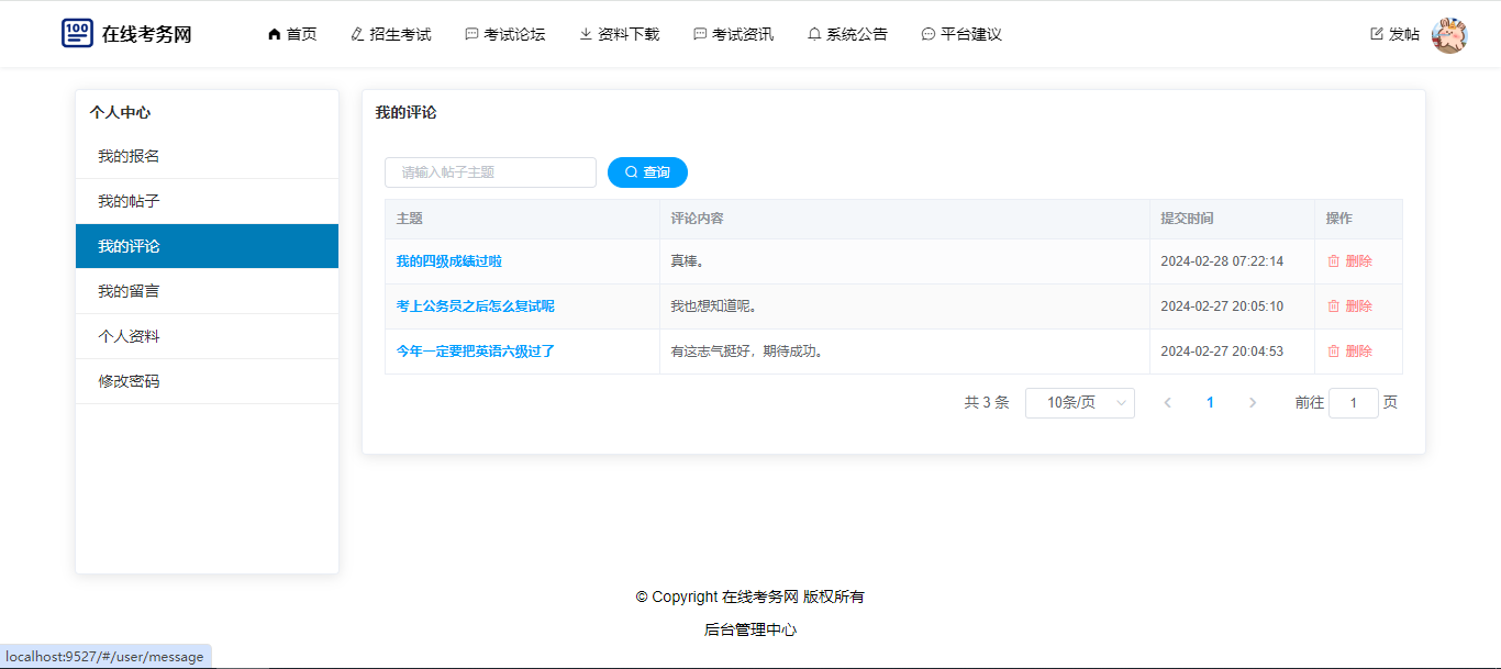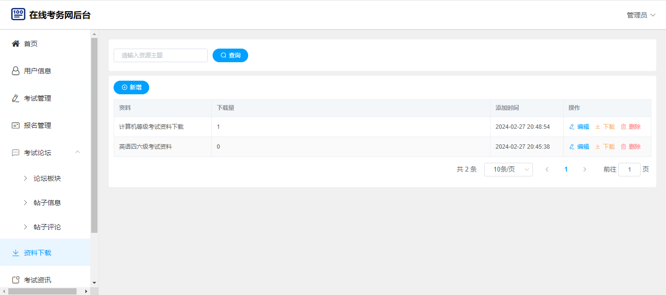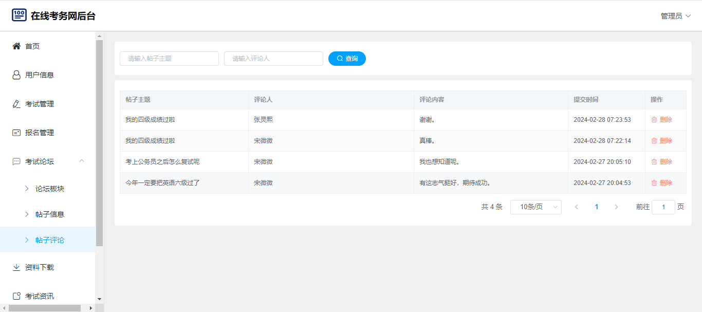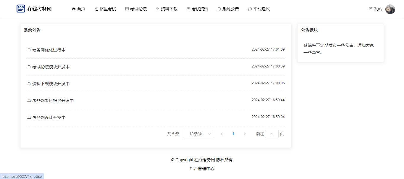管理员:首页、用户管理;考试管理;报名管理;考试论坛(板块、帖子、评论);资料下载;考试资讯;平台建议;公告管理;修改个人信息、密码。