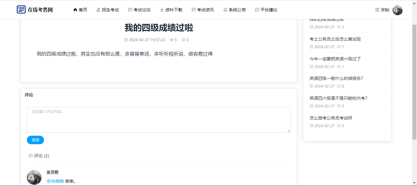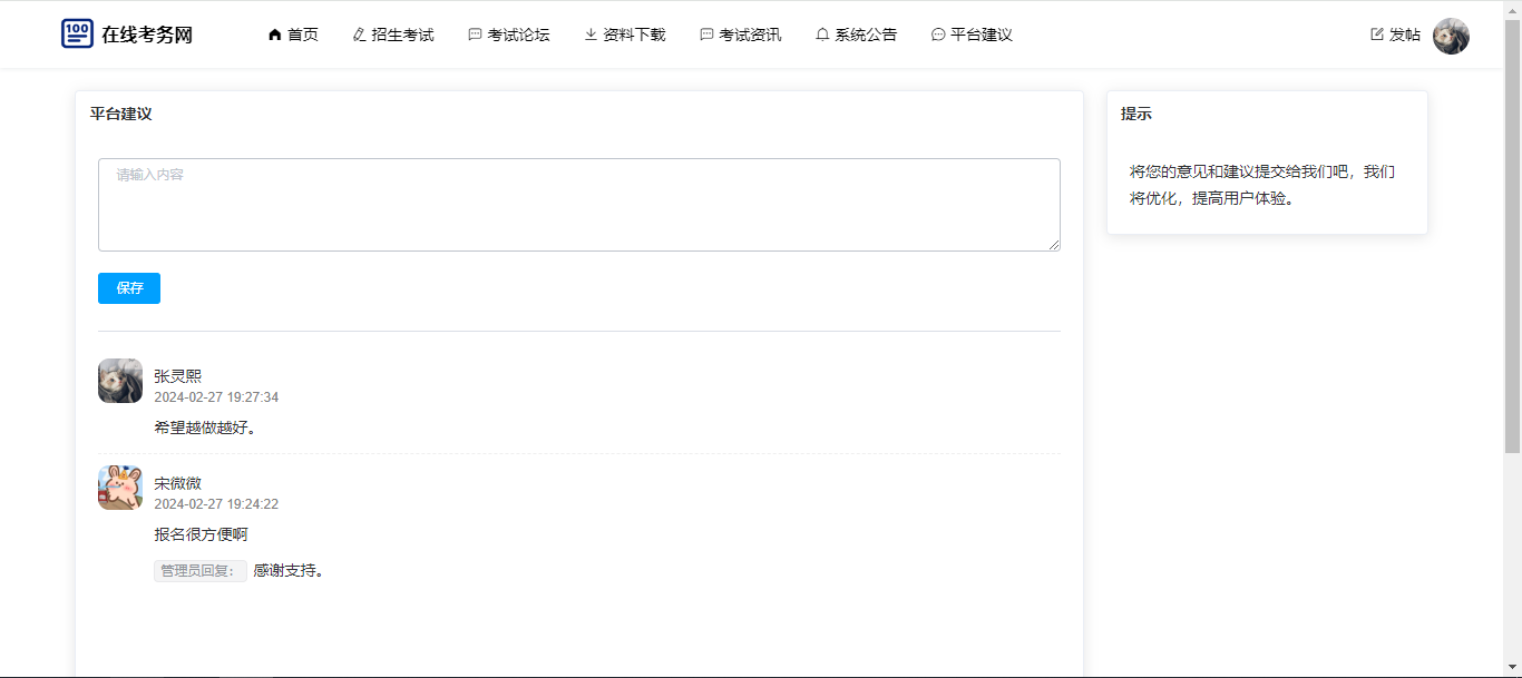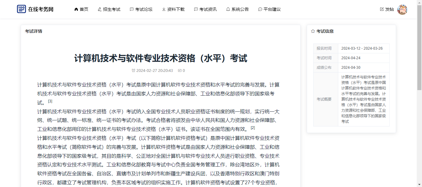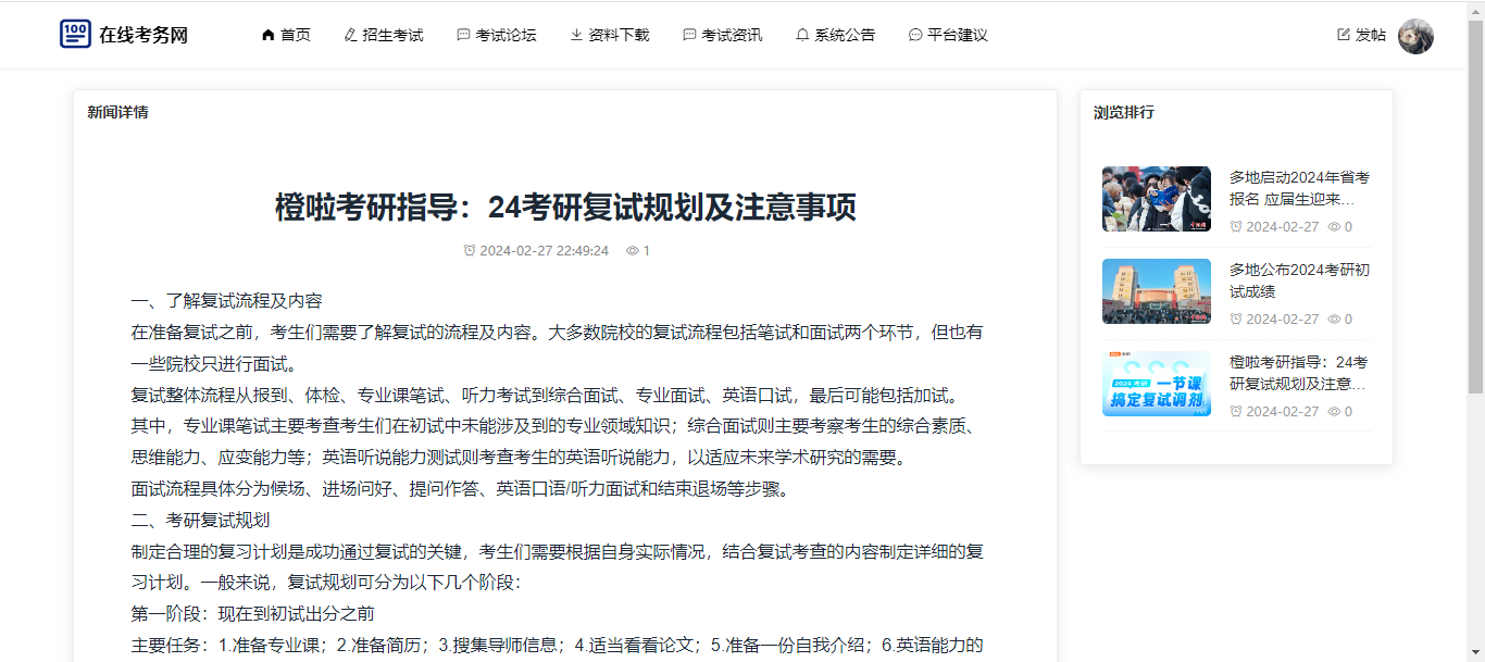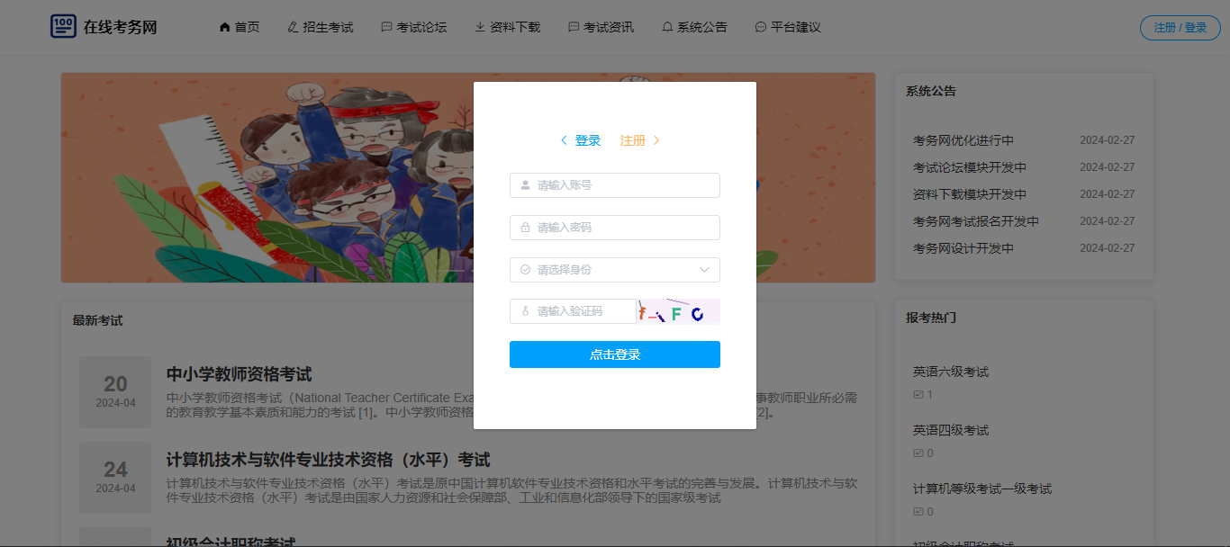 用户:注册、登录;首页,查看招生考试(考试详情、报名);考试论坛(按板块查看帖子、帖子详情、评论、发帖);资料下载;考试资讯查看;系统公告查看;平台建议提交