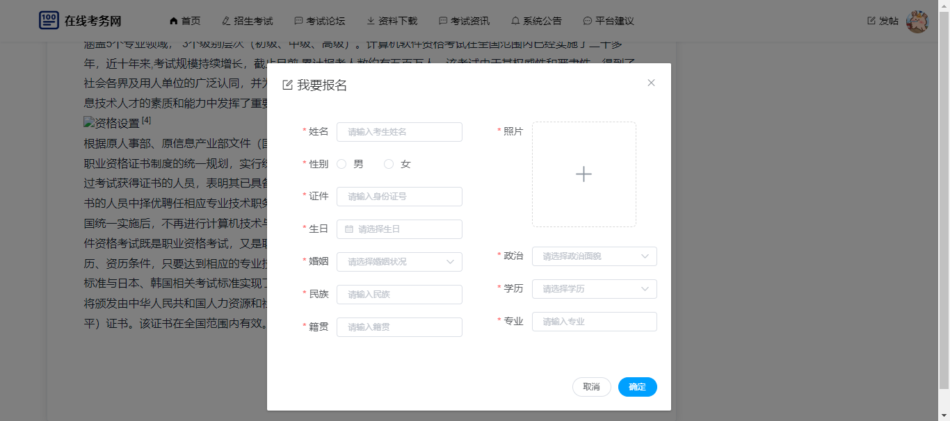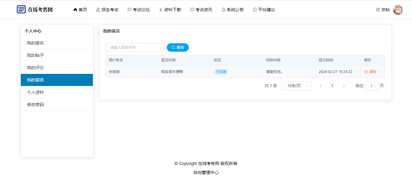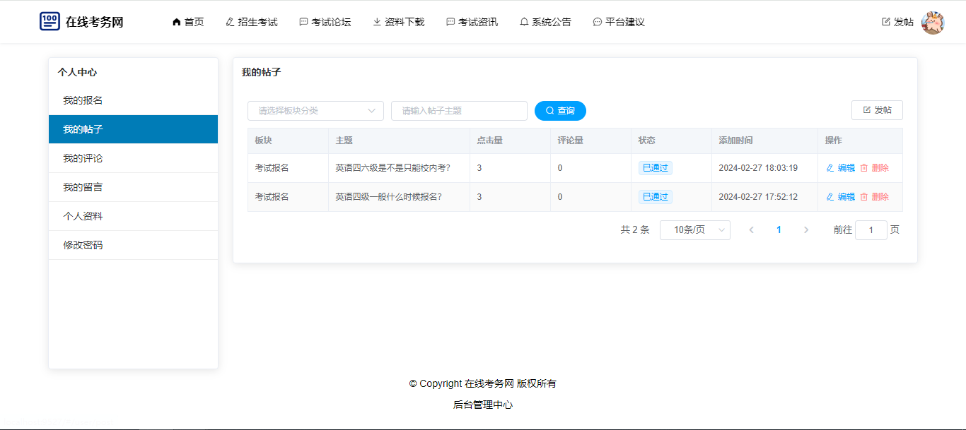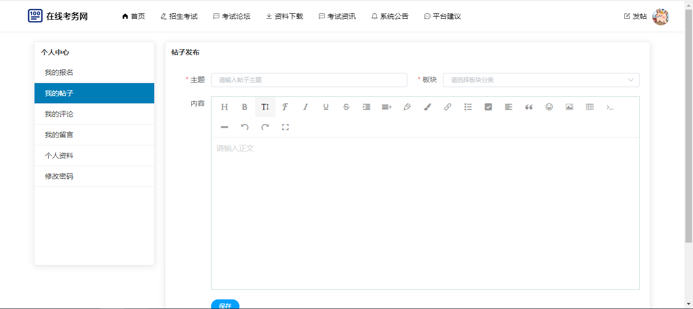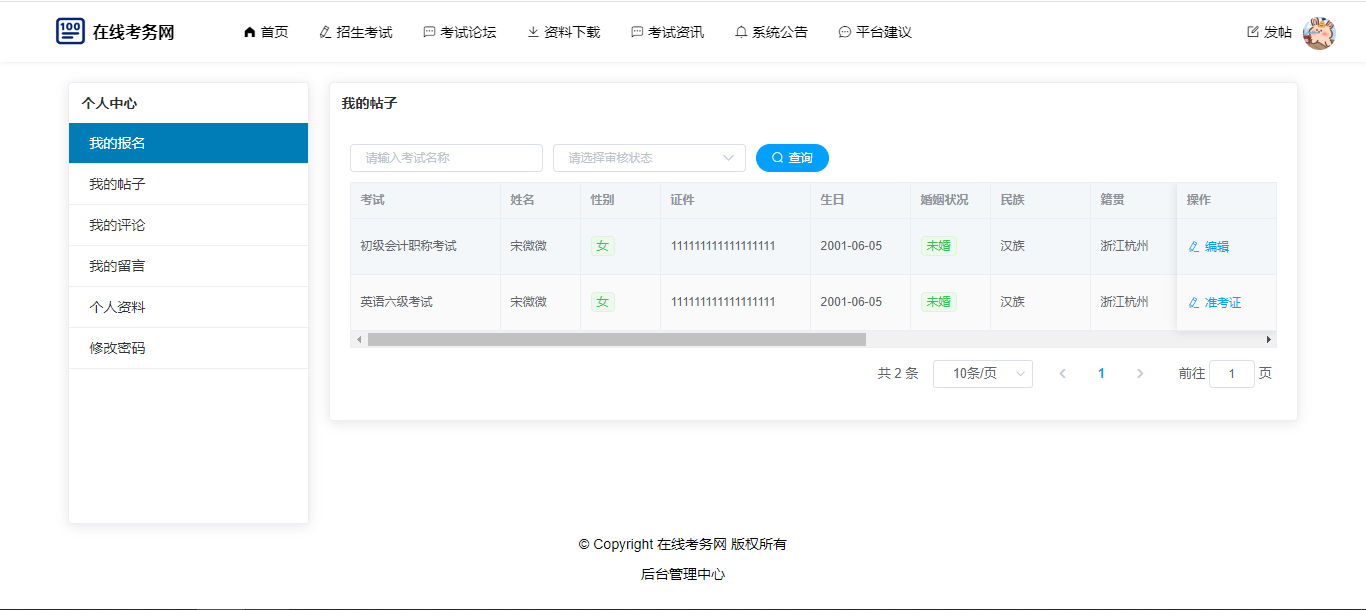 个人中心功能:我的报名(可上传证件照、准考证)、我的帖子、我的评论、我的留言、个人资料(可上传头像);密码修改。