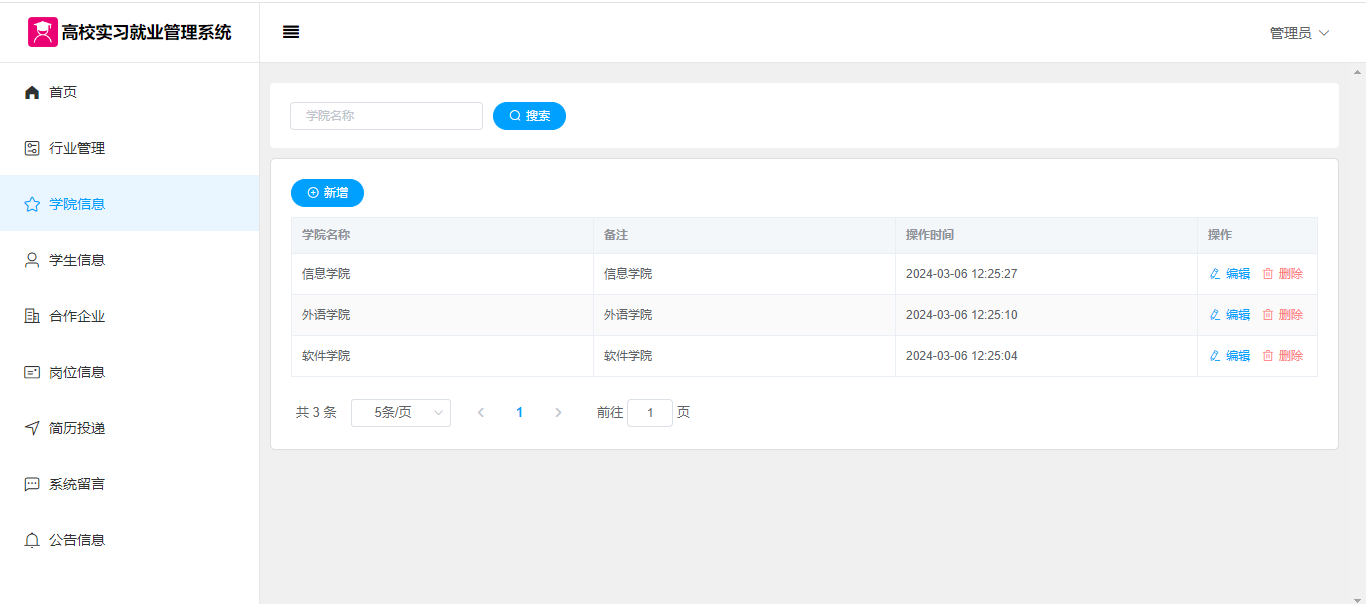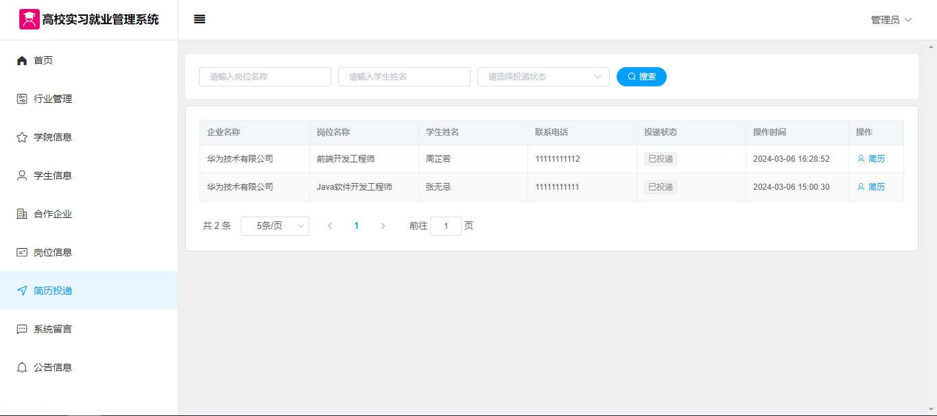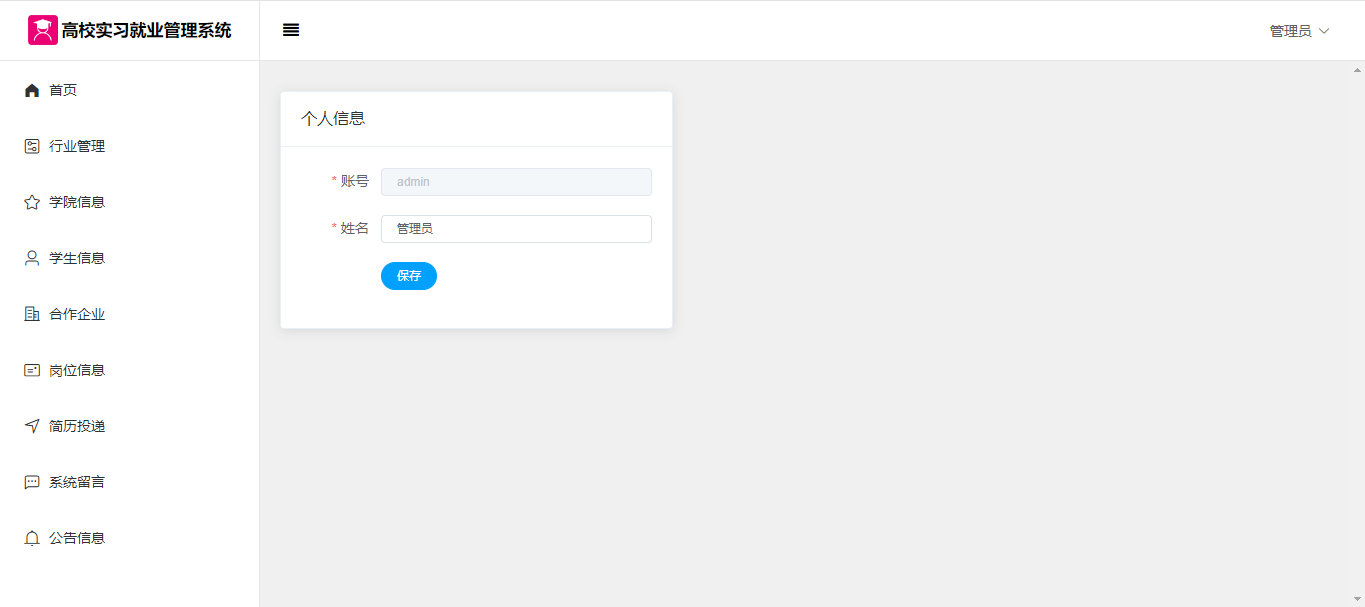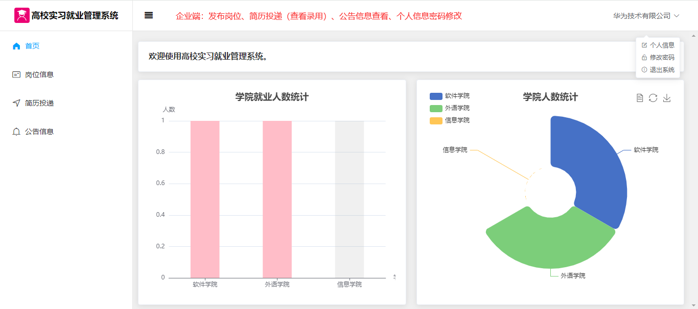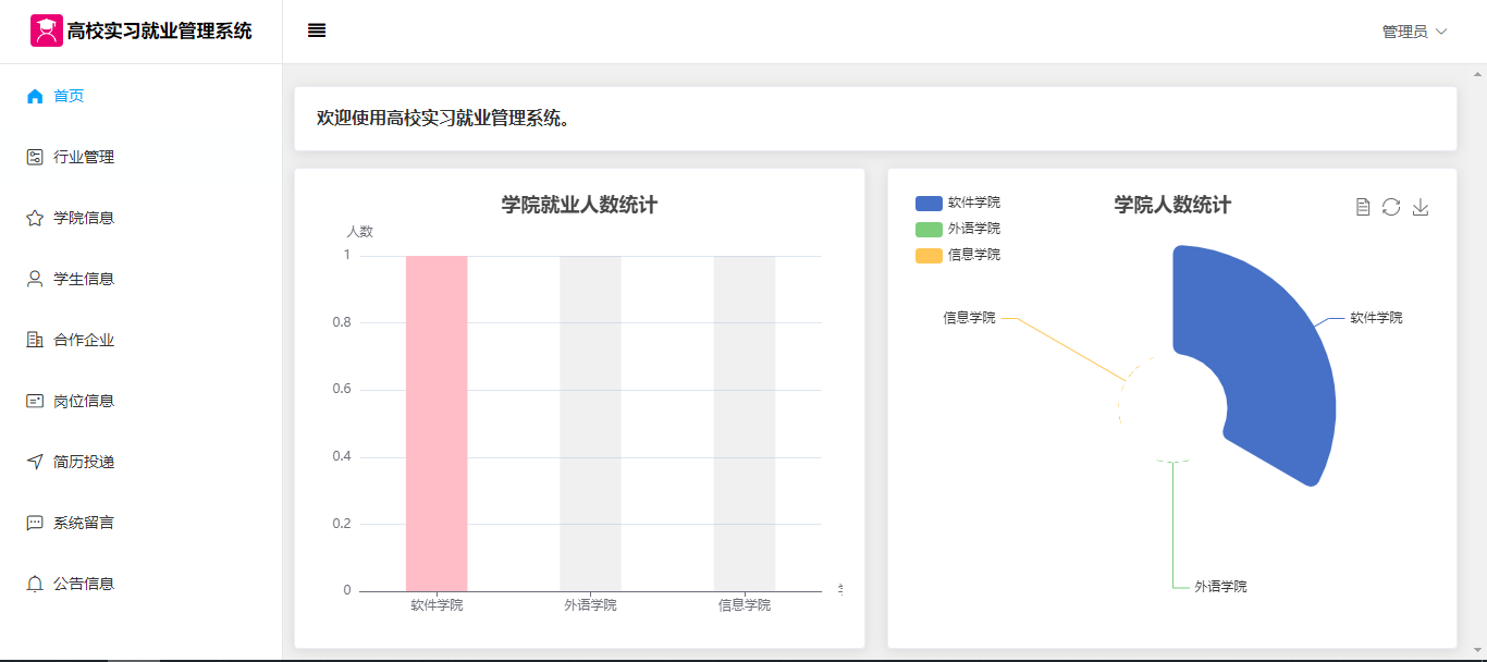 管理员:首页(数据图表统计);行业管理;学院信息;学生信息;合作企业;岗位信息;简历投递;公告信息管理;个人信息;密码修改;