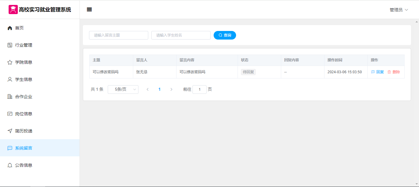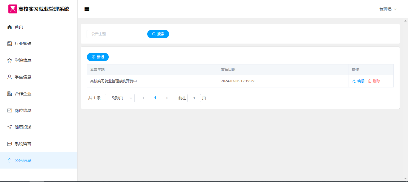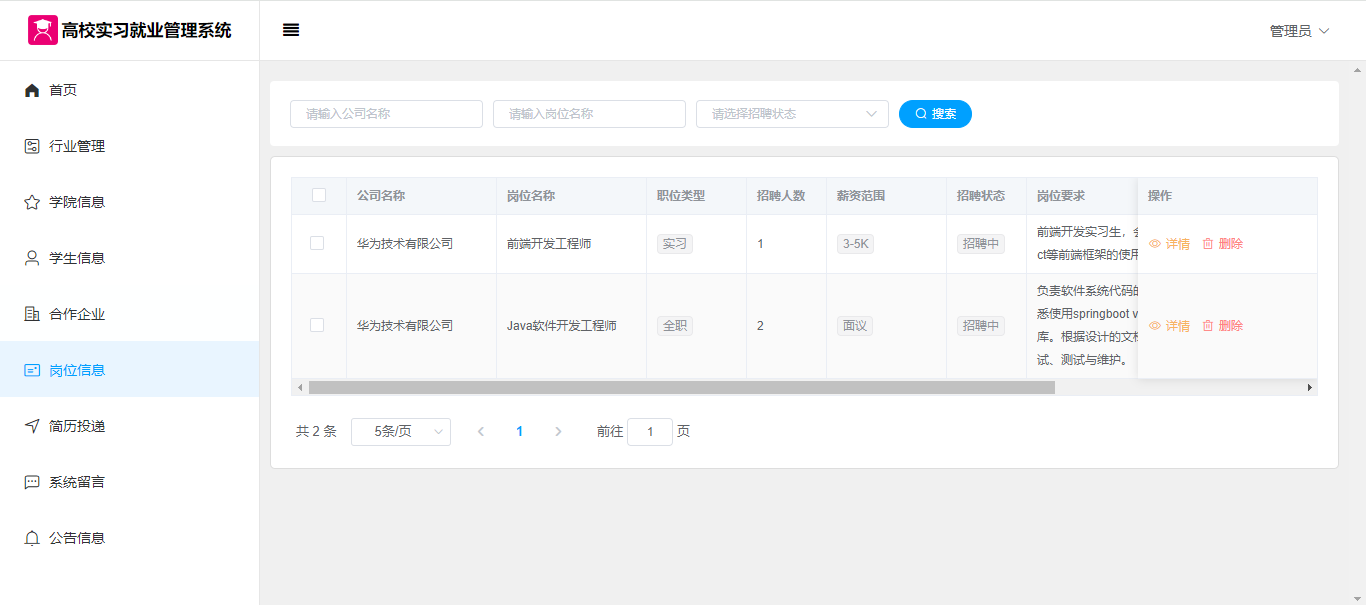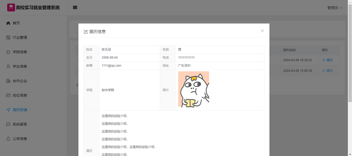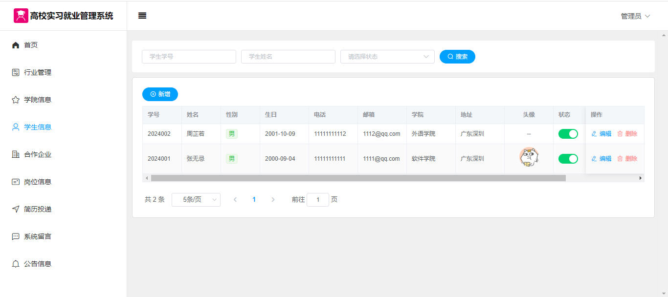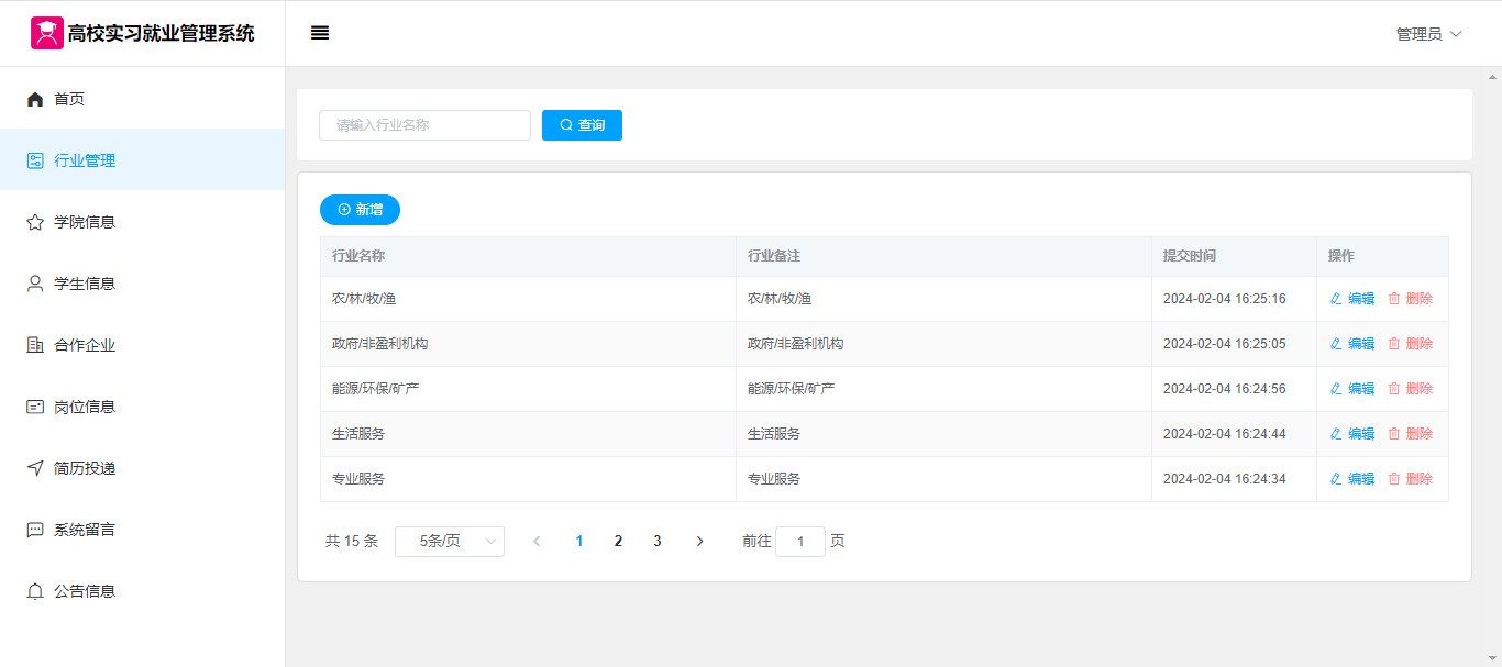 管理员:首页(数据图表统计);行业管理;学院信息;学生信息;合作企业;岗位信息;简历投递;公告信息管理;个人信息;密码修改;