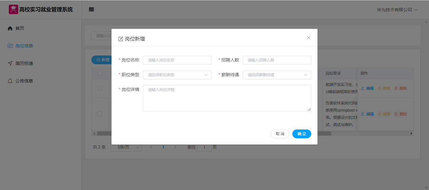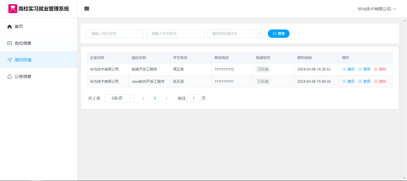 企业:发布岗位信息(全职和实习);查看简历投递情况(可以查看简历、录用);查看公告;修改个人信息;密码;