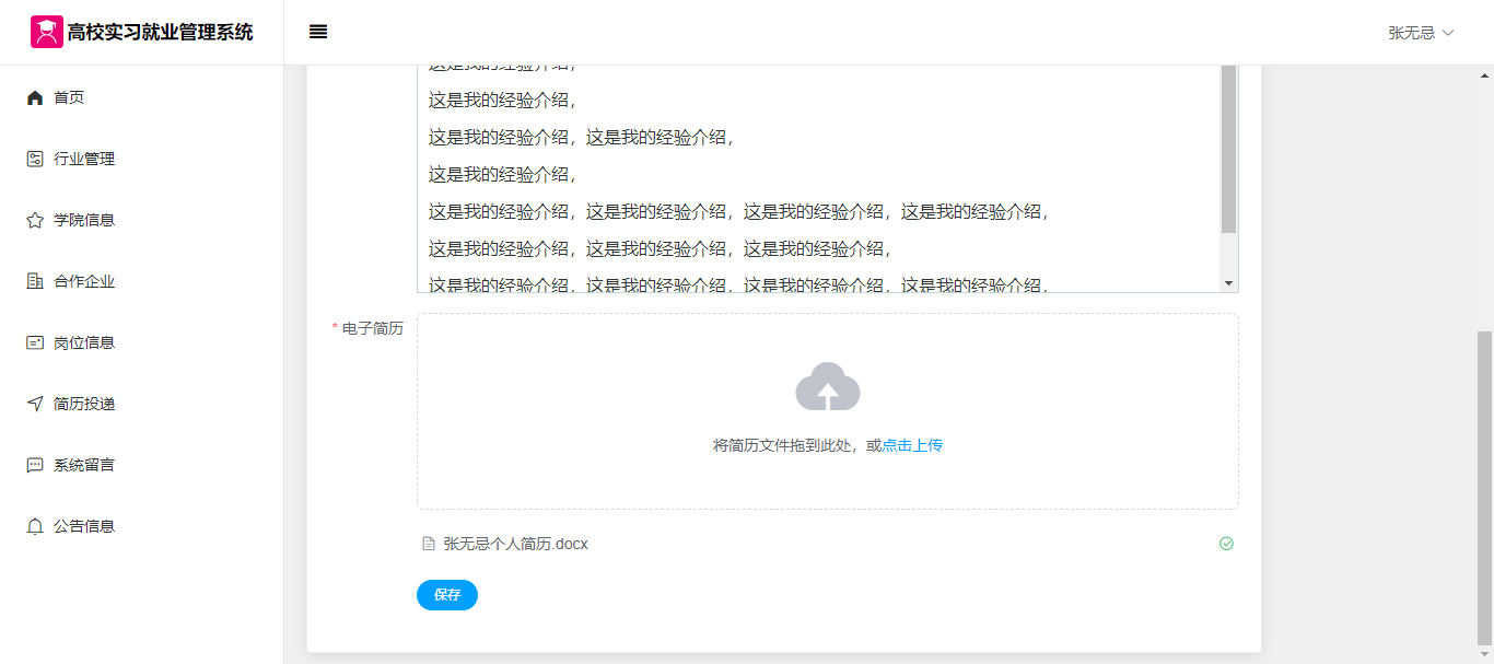 学生:行业信息;学院信息;合作企业;岗位信息;简历投递;系统留言;公告信息;修改个人信息;修改个人简历(上传简历电子版);修改密码。