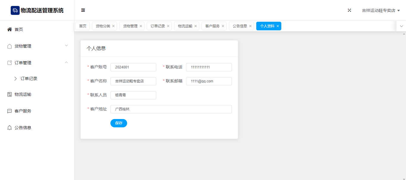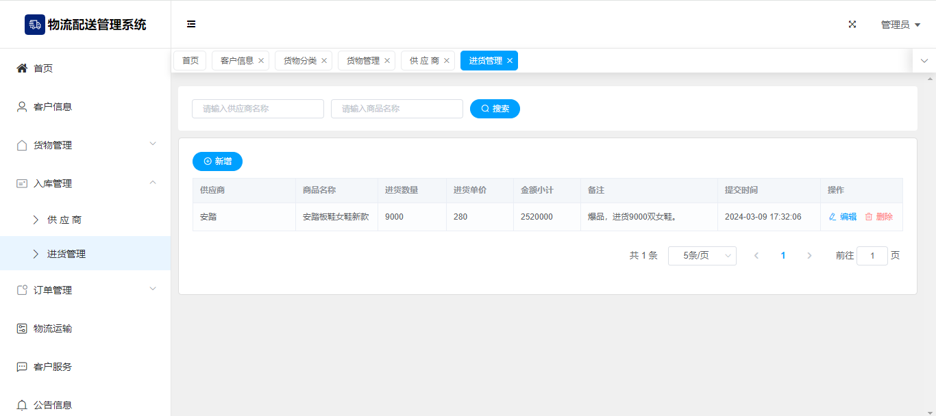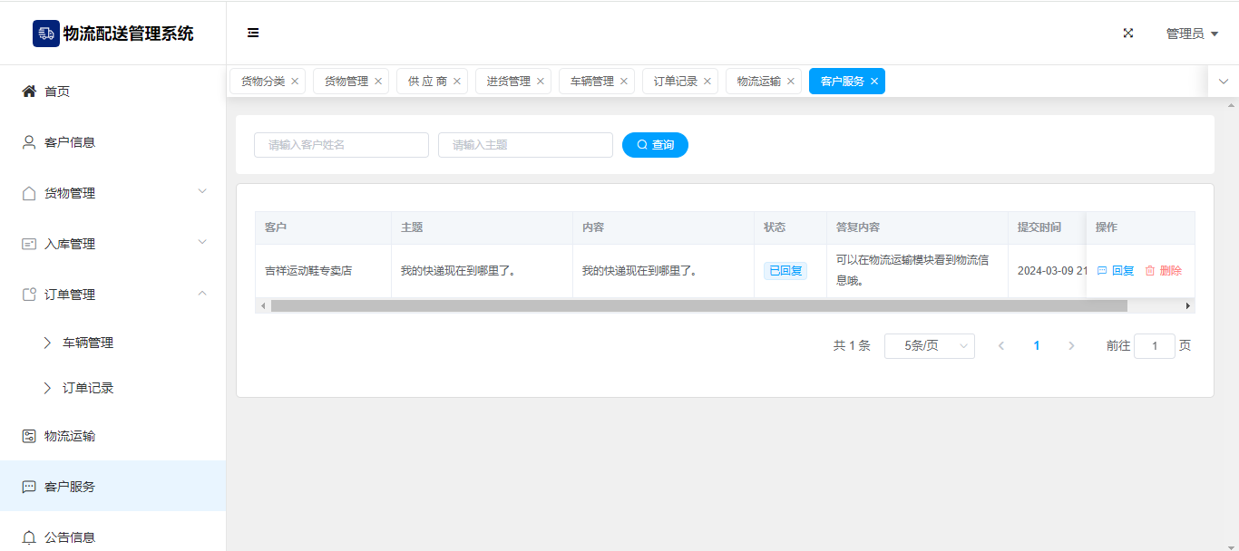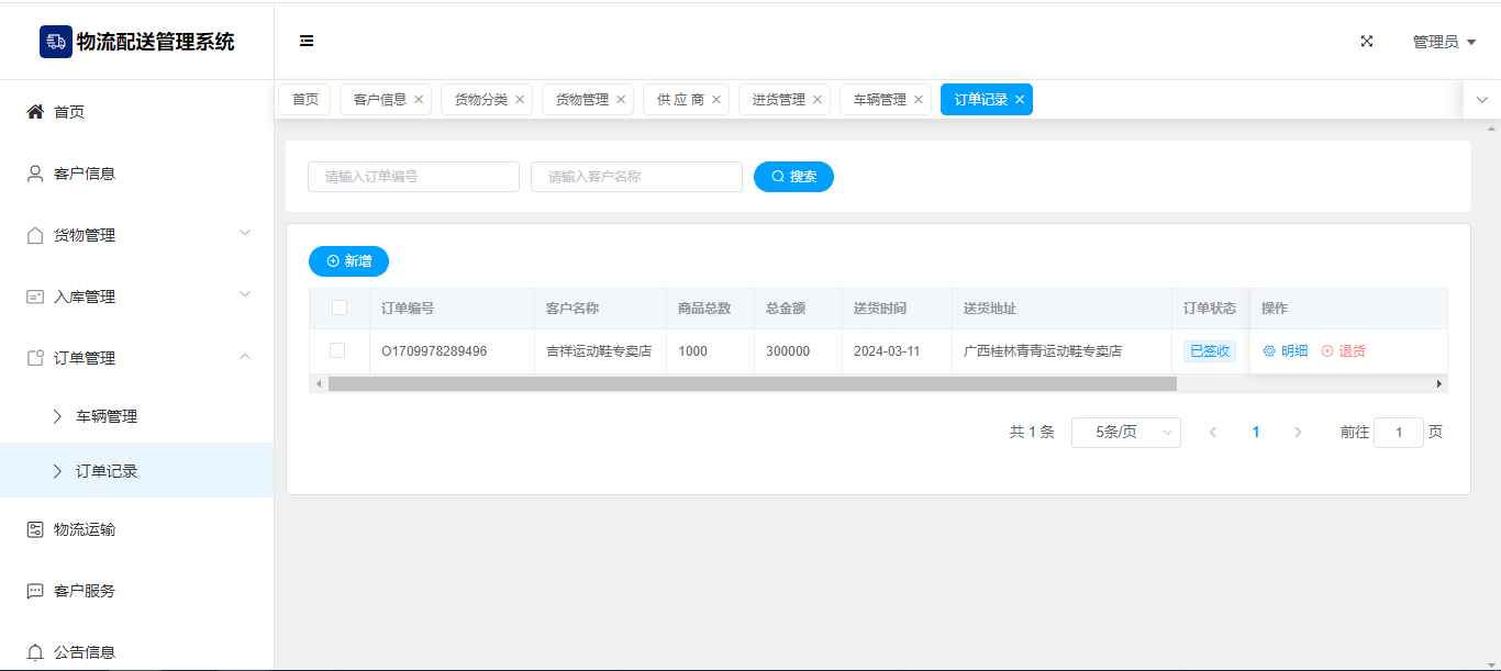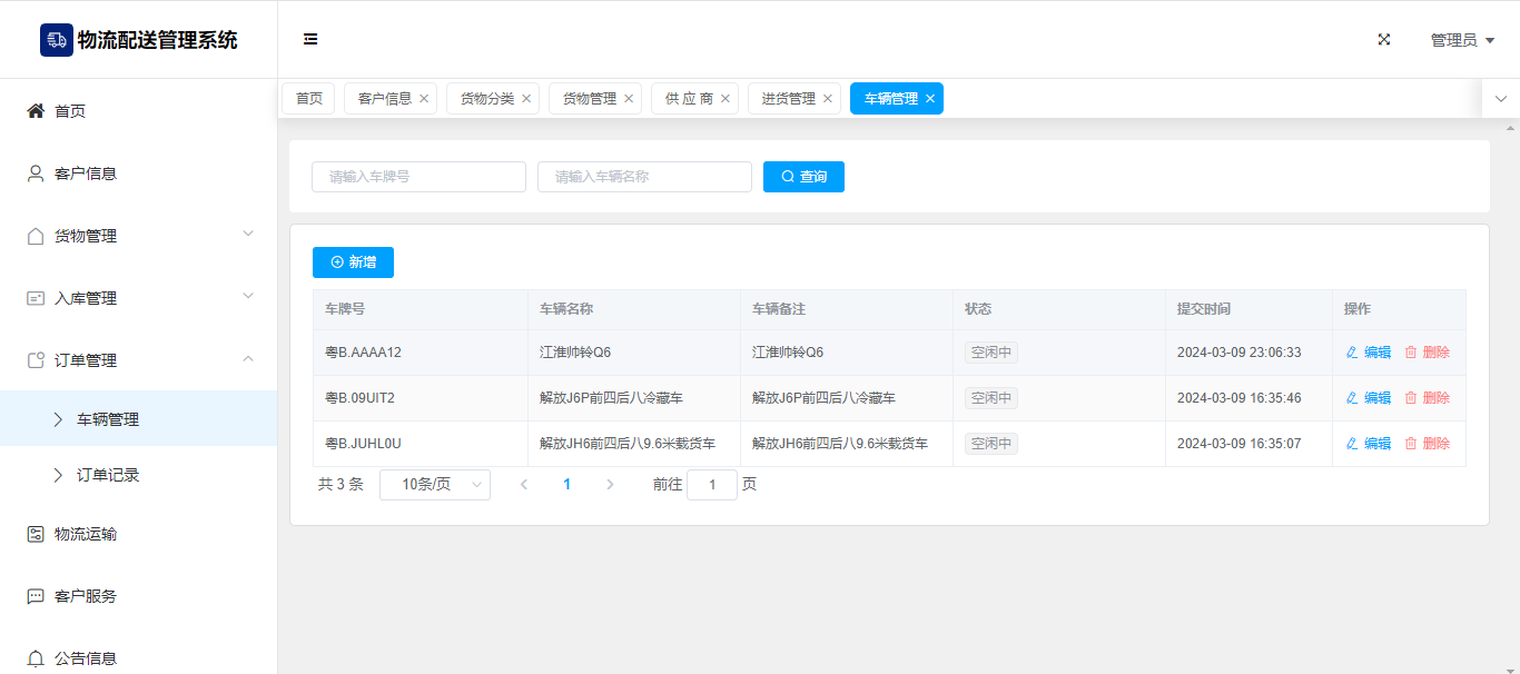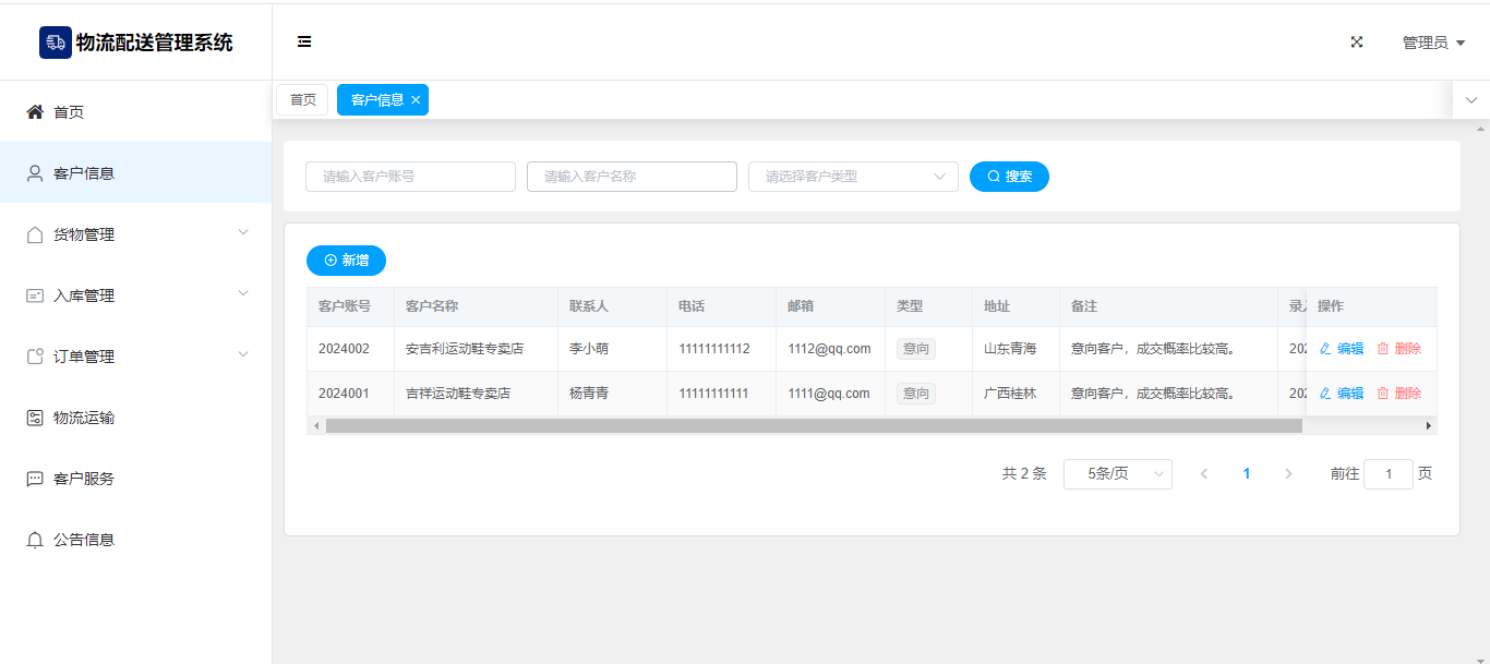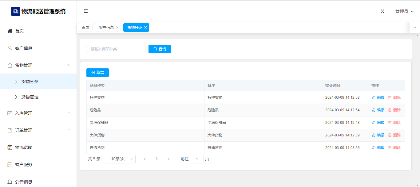 基于SpringBoot+Vue前后端分离的物流配送管理系统,系统包含管理员、客户角色,功能如下: