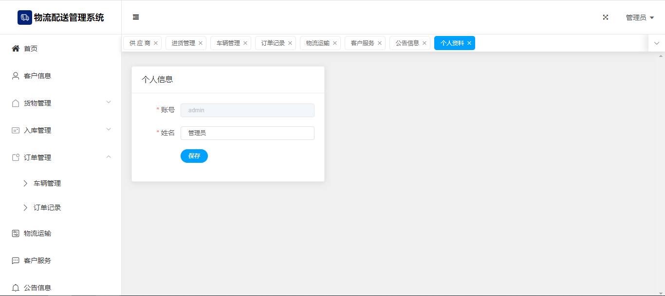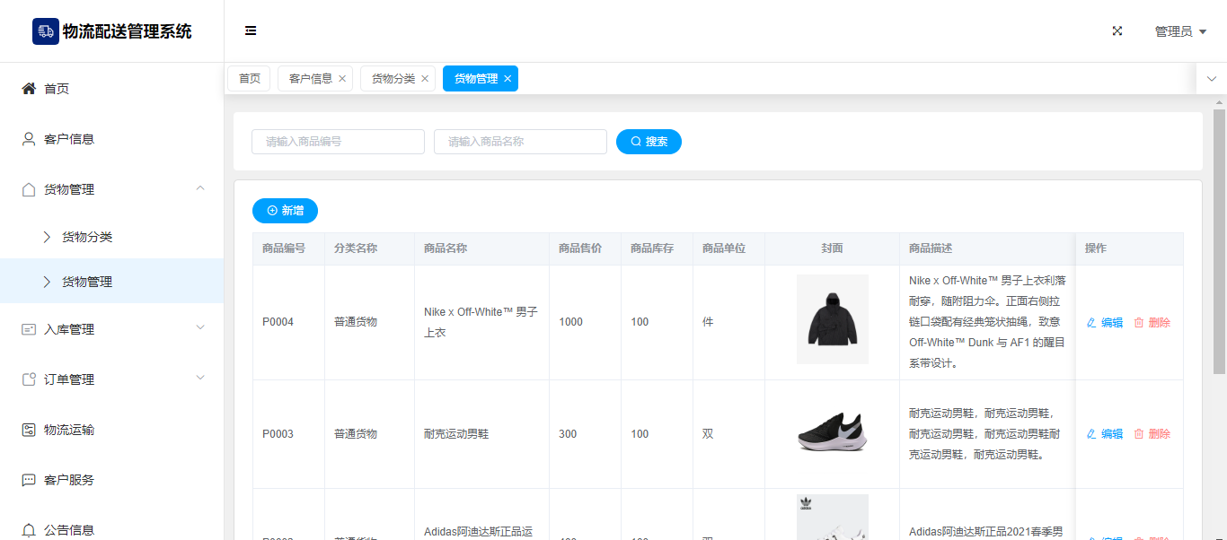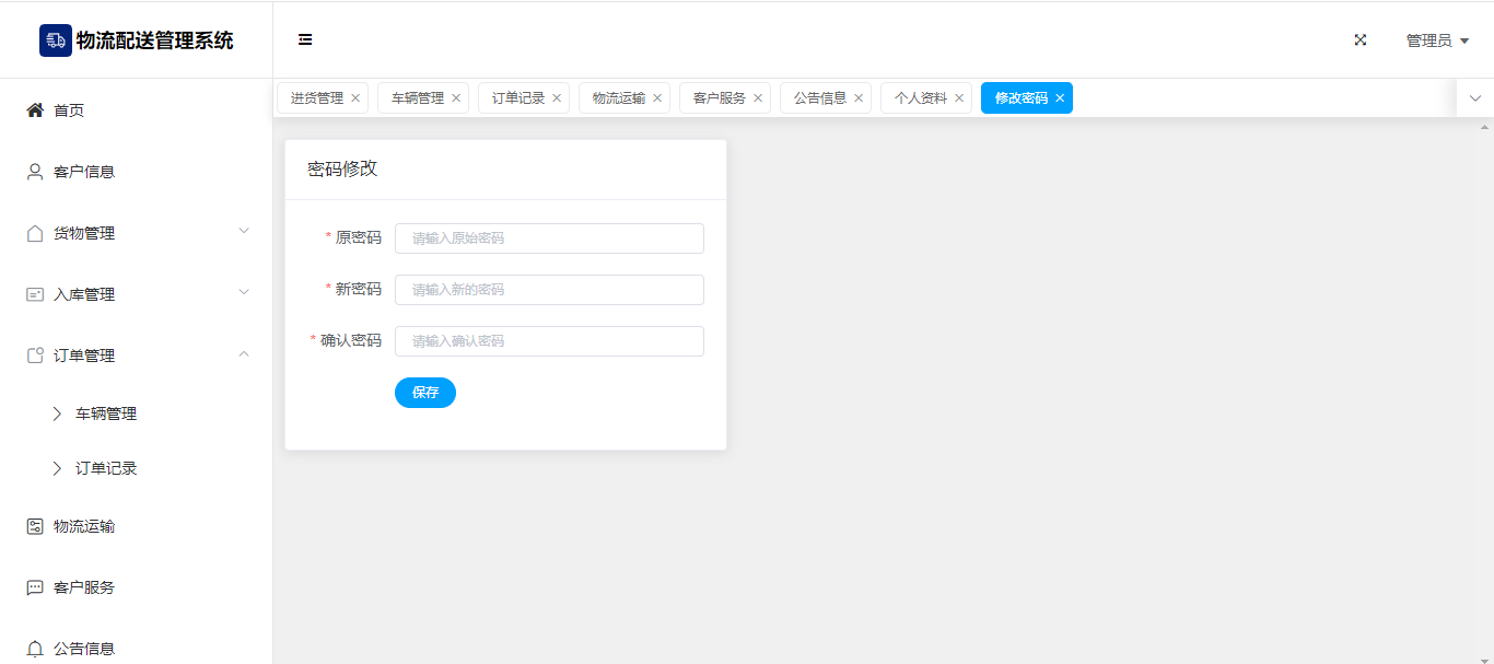 管理员:客户信息管理;货物管理(货物分类、货物管理);入库管理(供应商管理;进货管理);订单管理(车辆管理、订单记录);物流运输(物流进度);客户服务;公告信息;个人信息;密码修改;