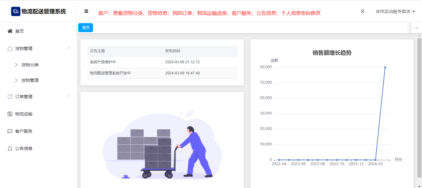 客户:注册、登录系统;货物管理(查看分类、货物);订单管理(我的订单);物流运输查看物流进度;客户服务提交留言;公告信息;修改个人信息密码。