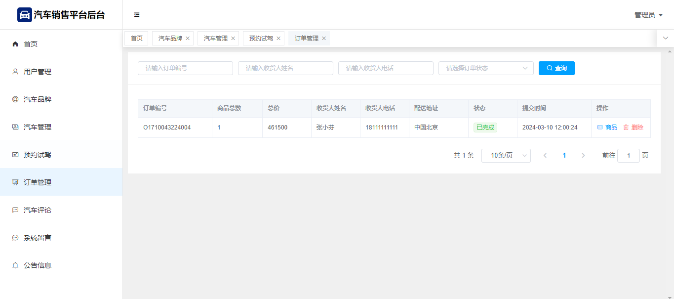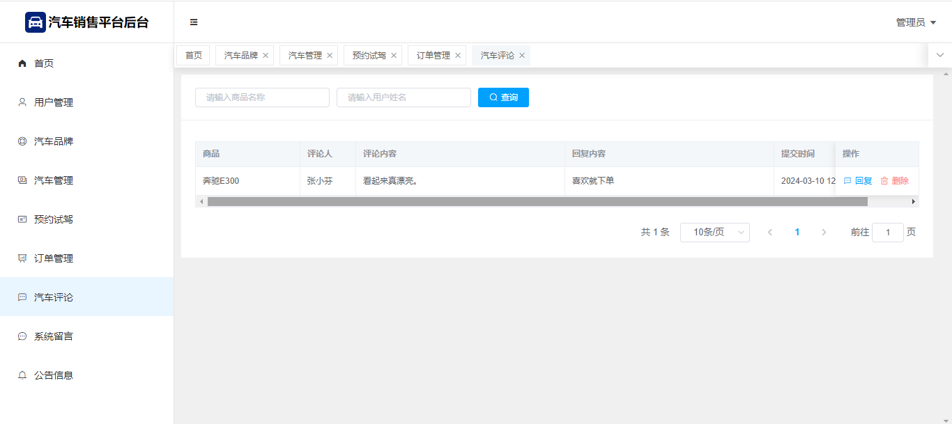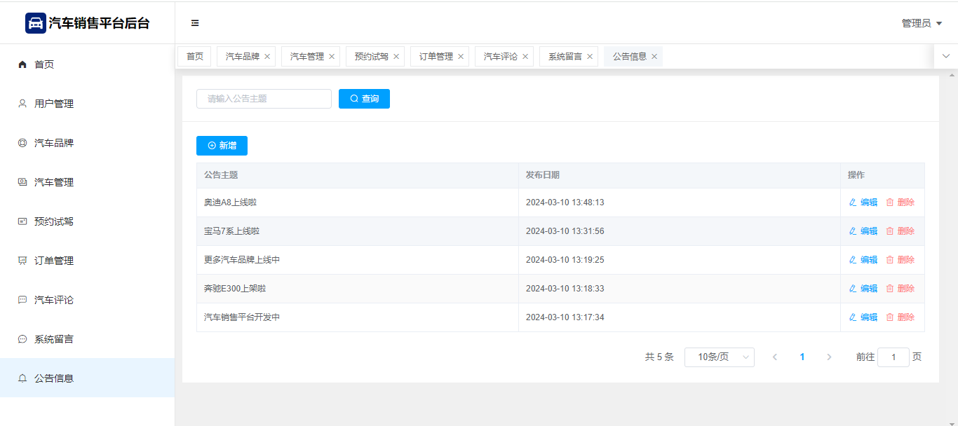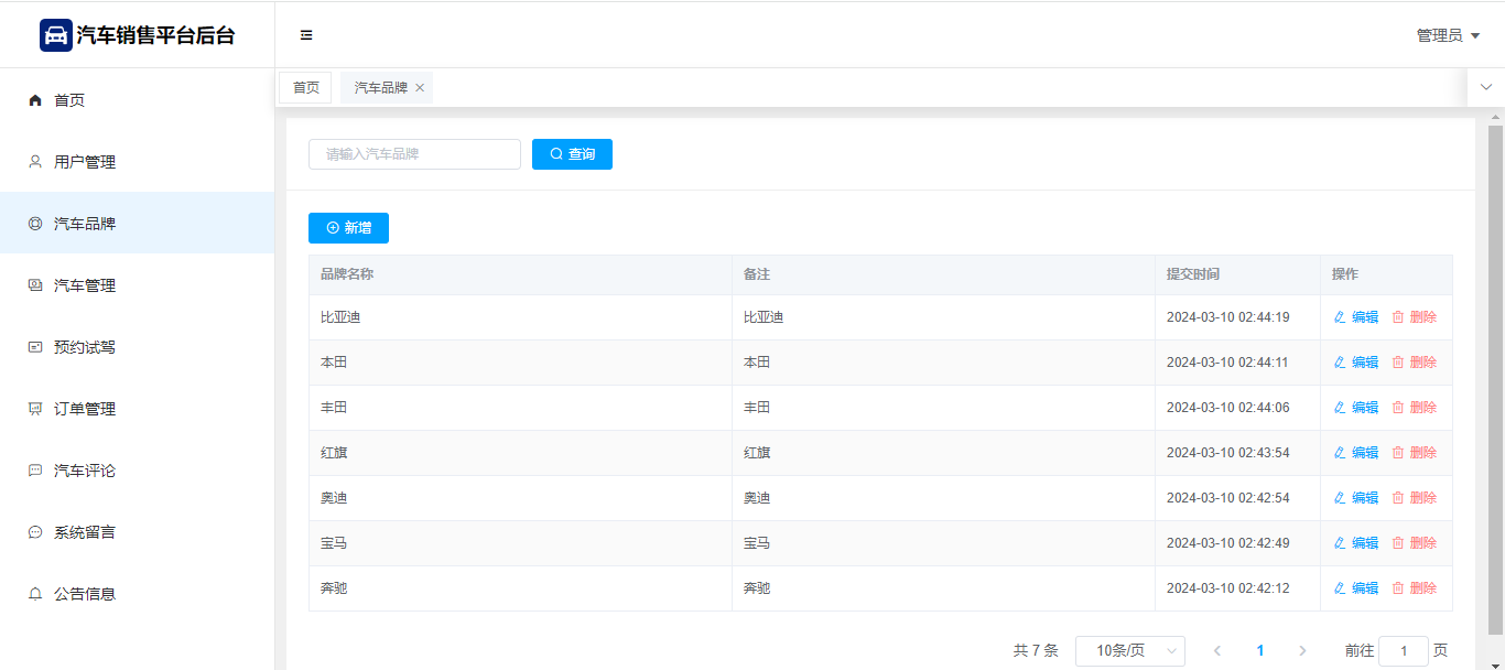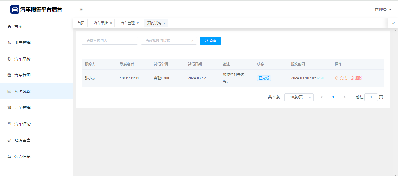 管理员:用户管理;汽车品牌管理;汽车管理;预约试驾管理;订单管理;汽车评论;系统留言;公告信息;个人信息;密码修改;
