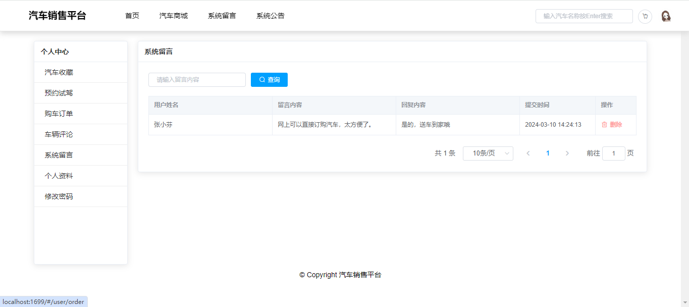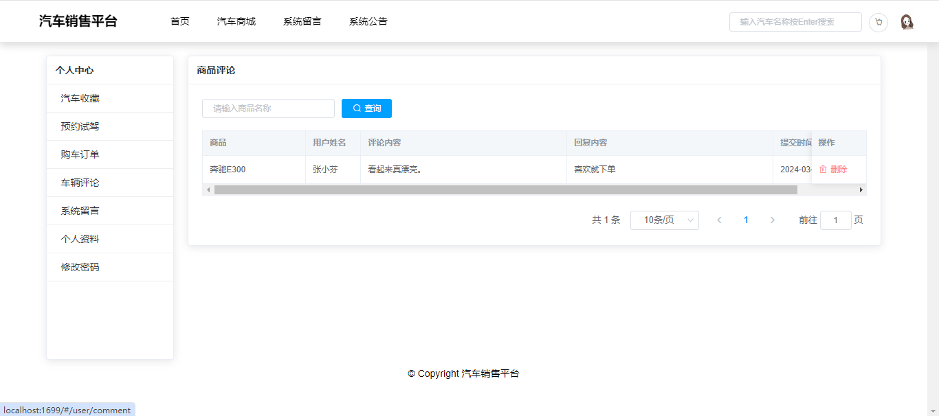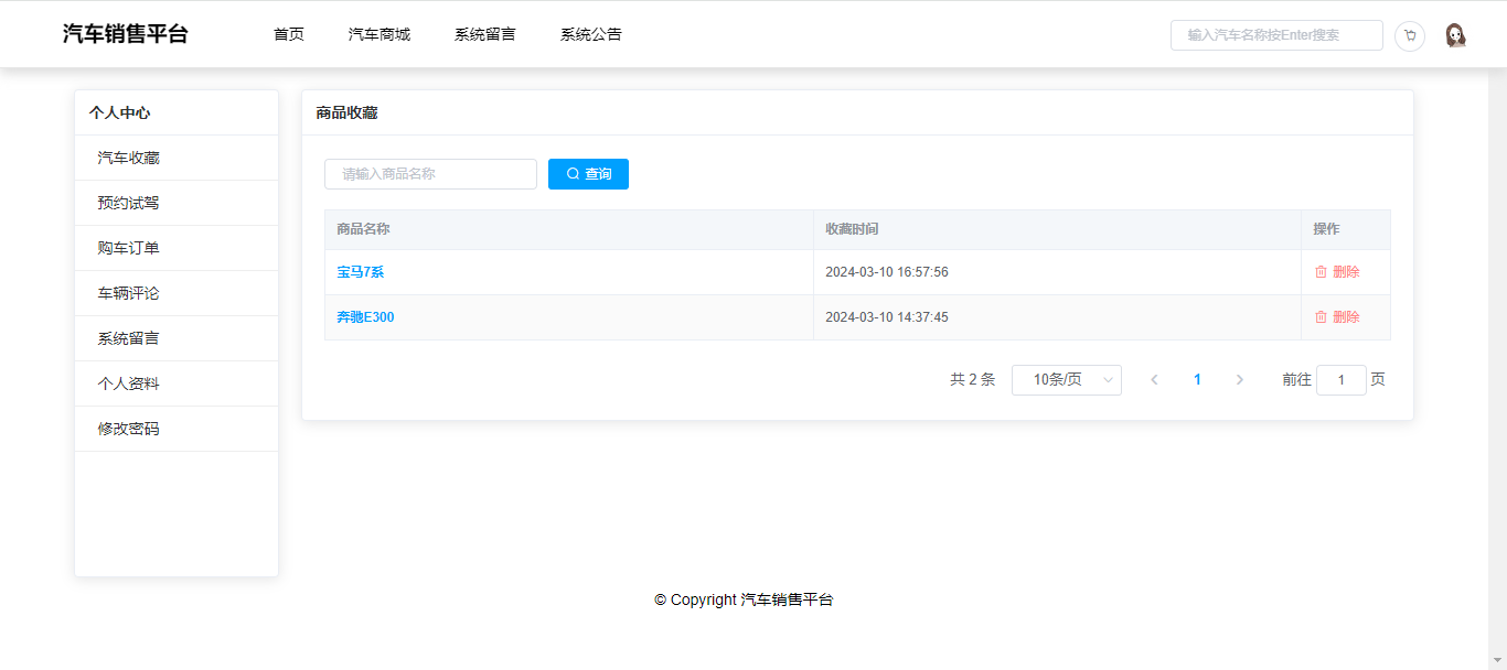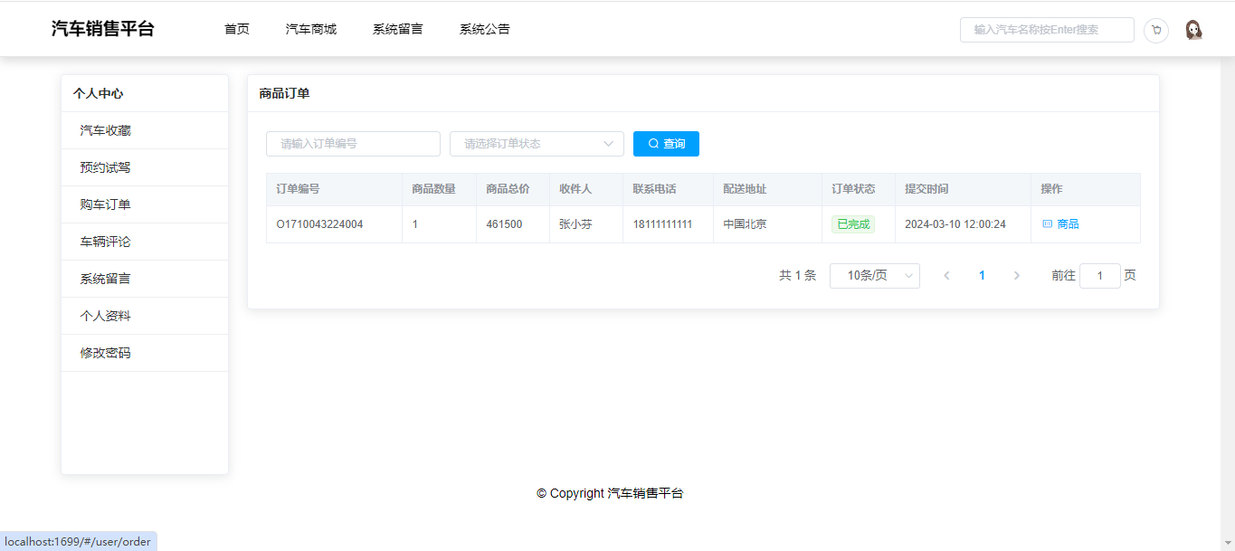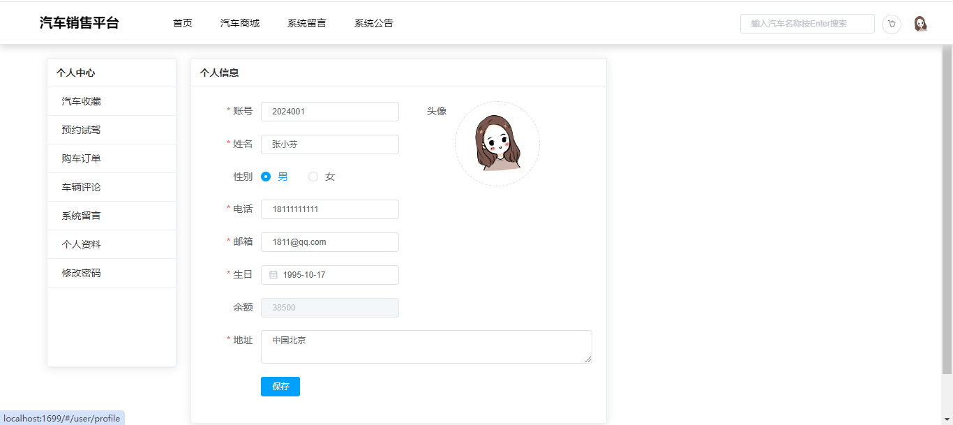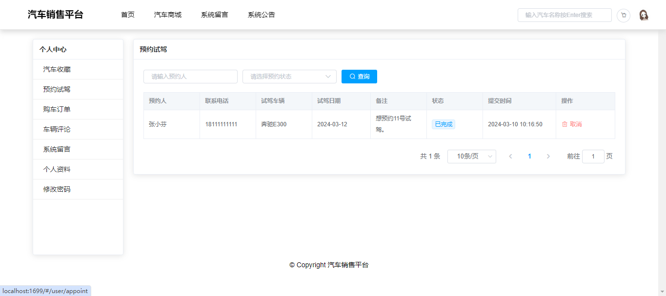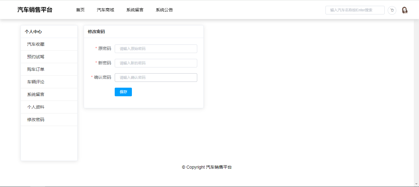 用户个人中心可以管理我的收藏、预约试驾管理、购车订单管理;车辆评论管理;系统留言管理;个人资料;修改密码。