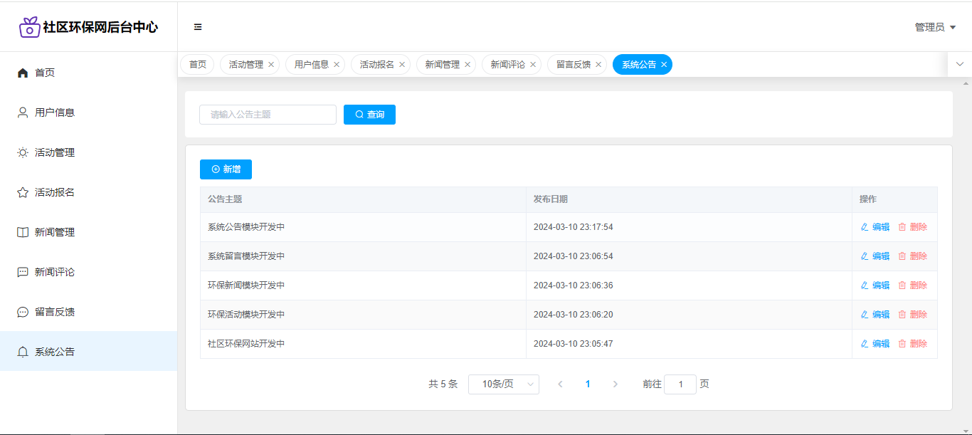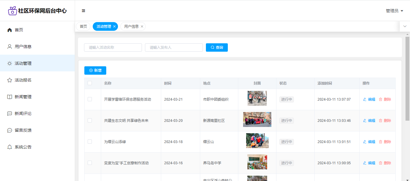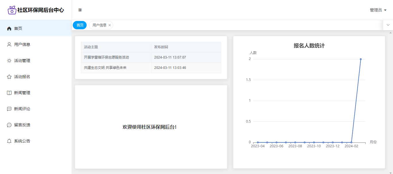 基于SpringBoot+Vue前后端分离的社区环保网,系统包含管理员、用户角色,功能如下: