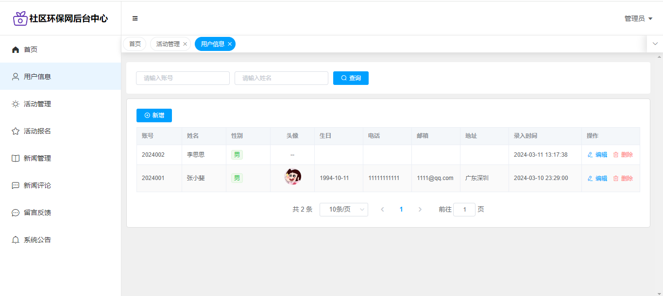 管理员:用户管理;活动管理;活动报名(审核);新闻管理;新闻评论;留言反馈;公告信息;个人信息;密码修改;