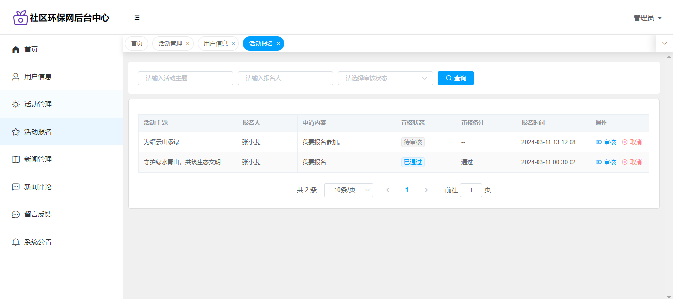用户:注册、登录系统;首页;环保活动列表(查看详情,可以申请报名活动);环保新闻(评论);系统留言;系统公告;