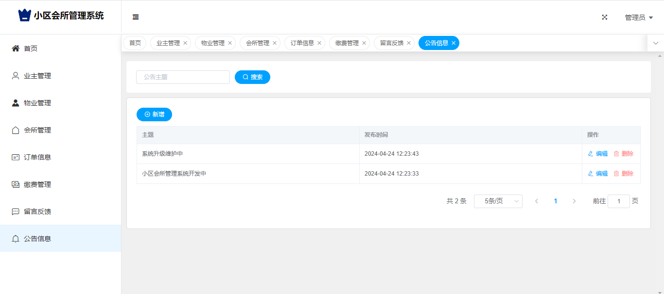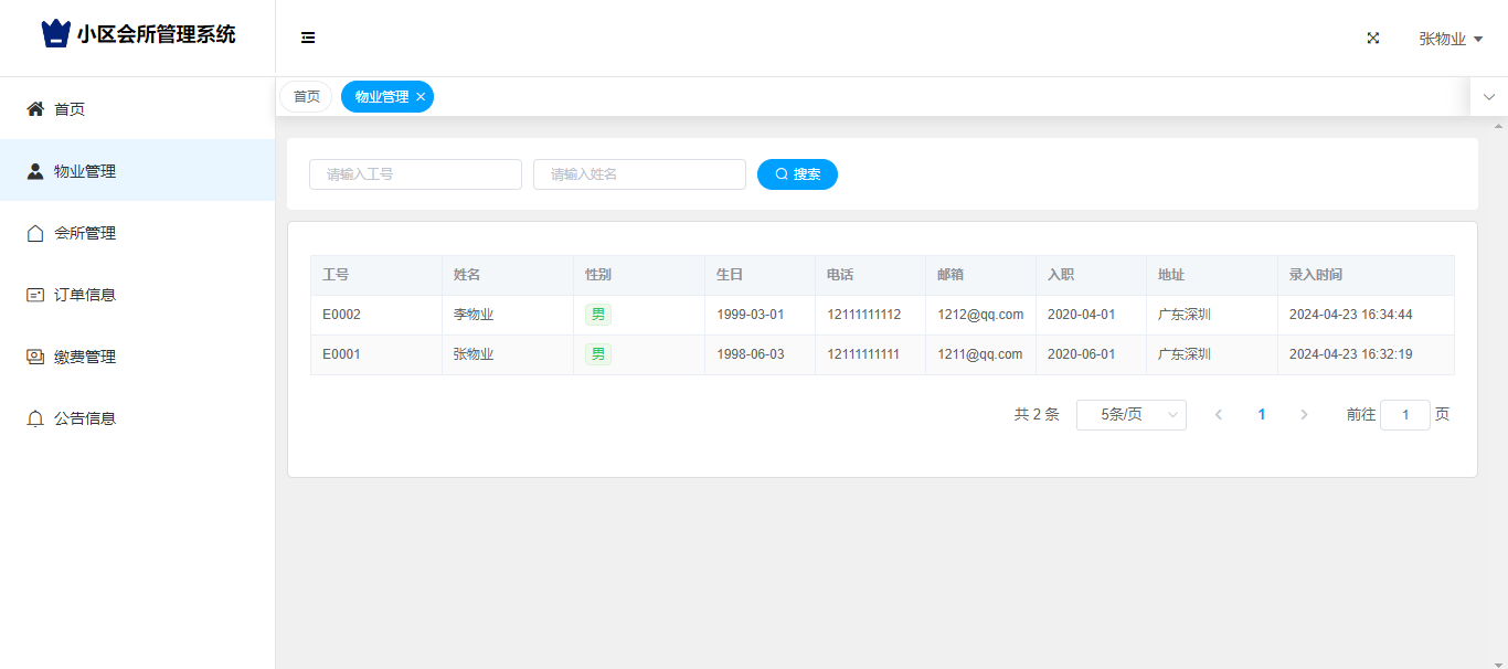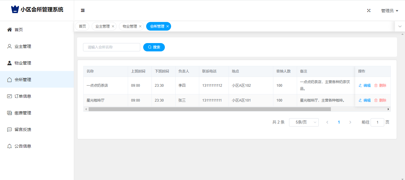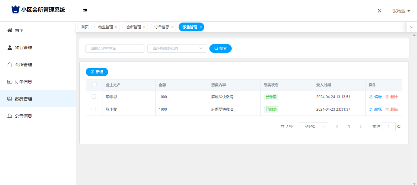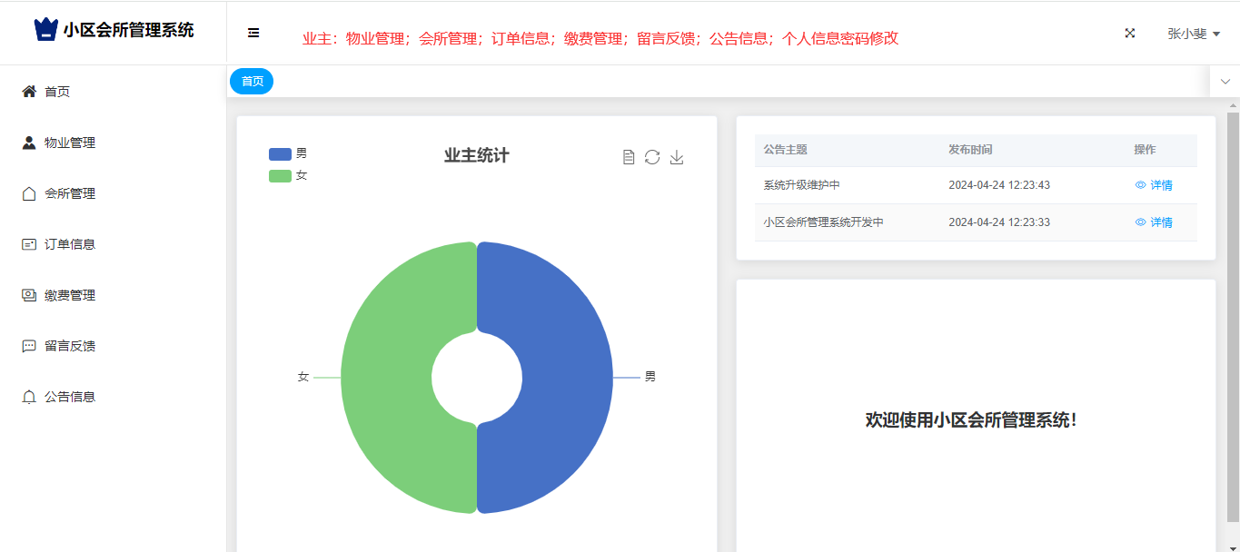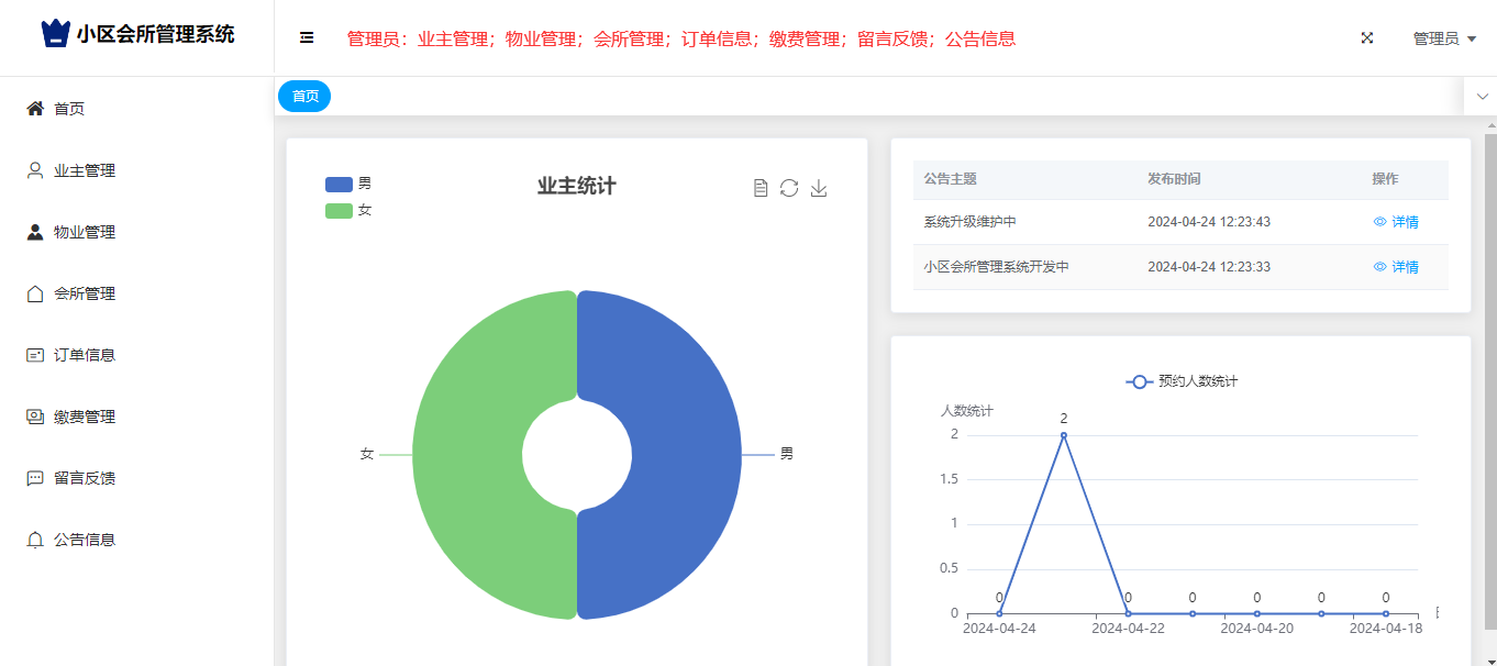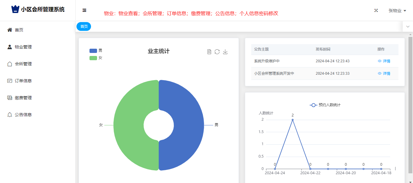 基于SpringBoot+Vue前后端分离的小区会所管理系统,系统包含管理员、物业、业主角色,功能如下: