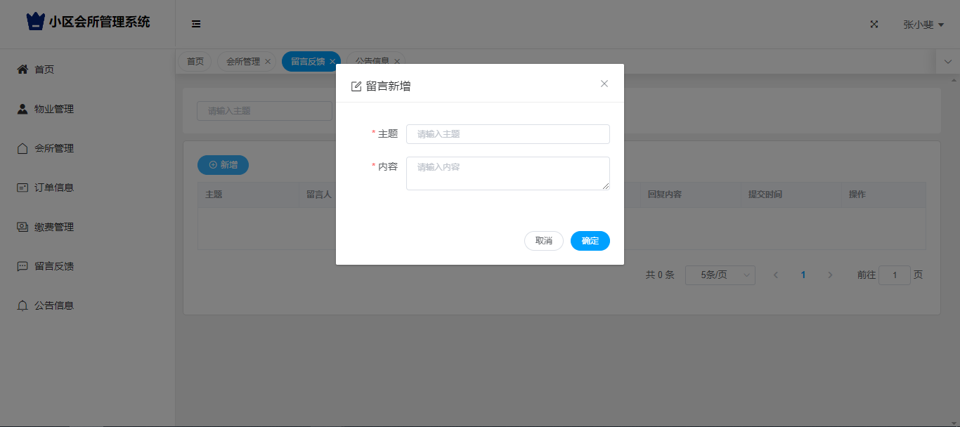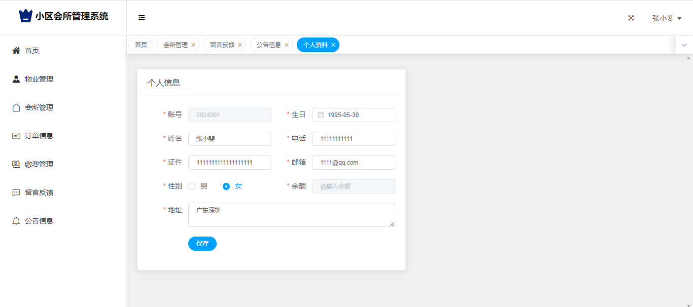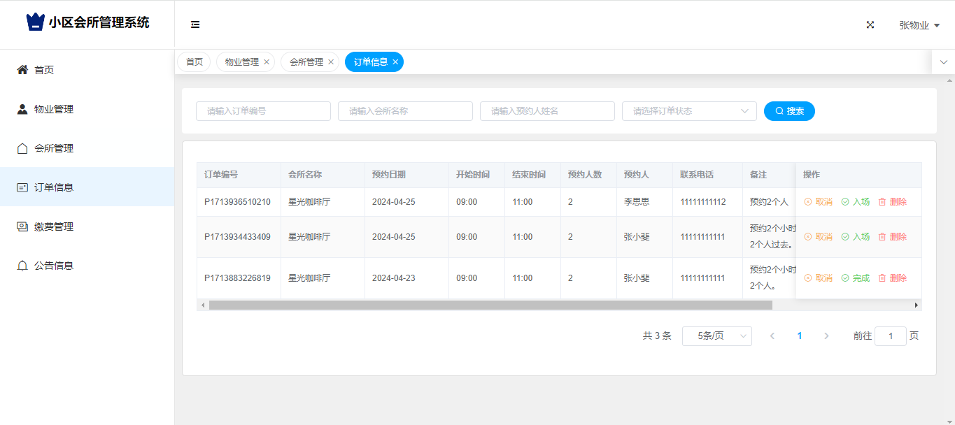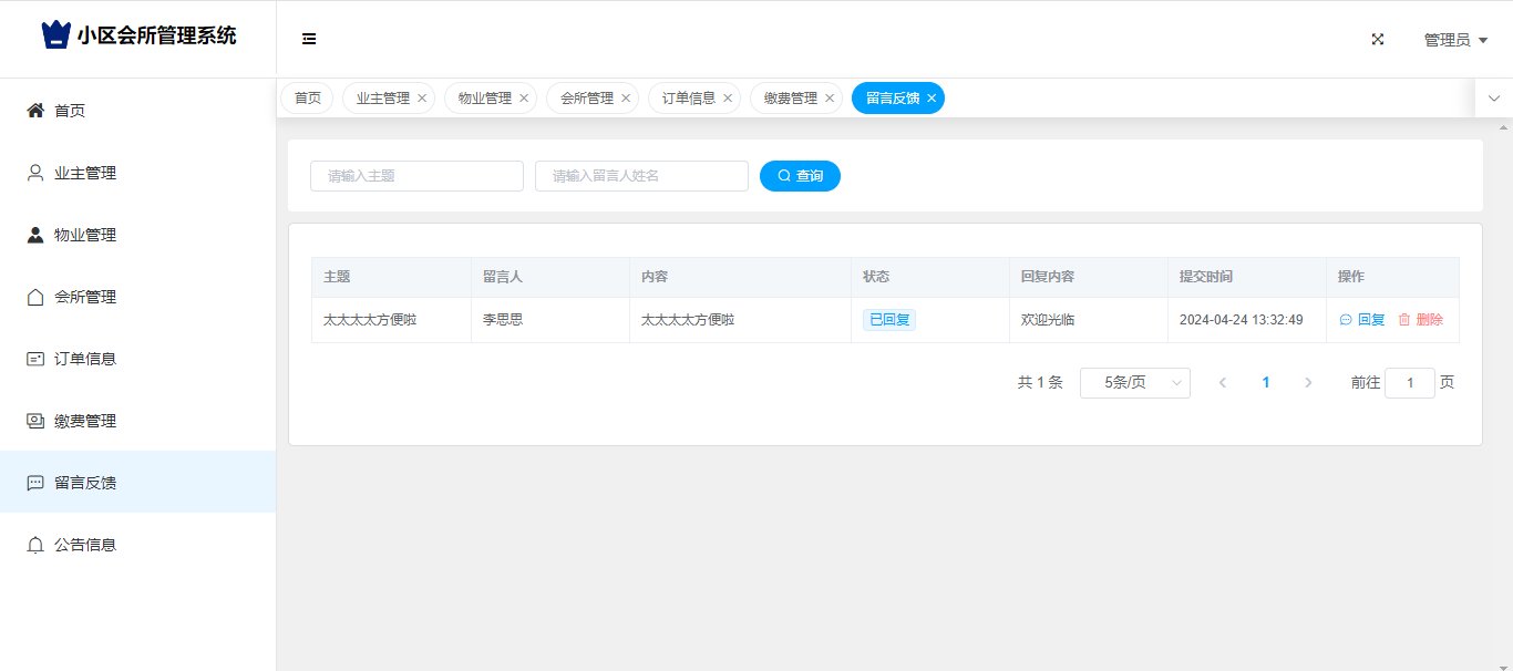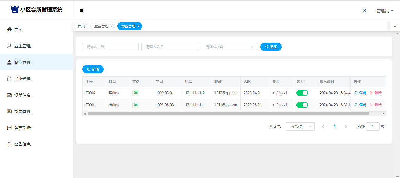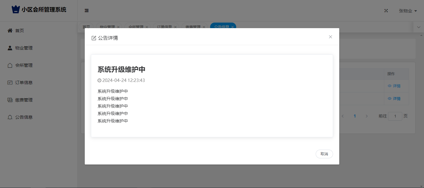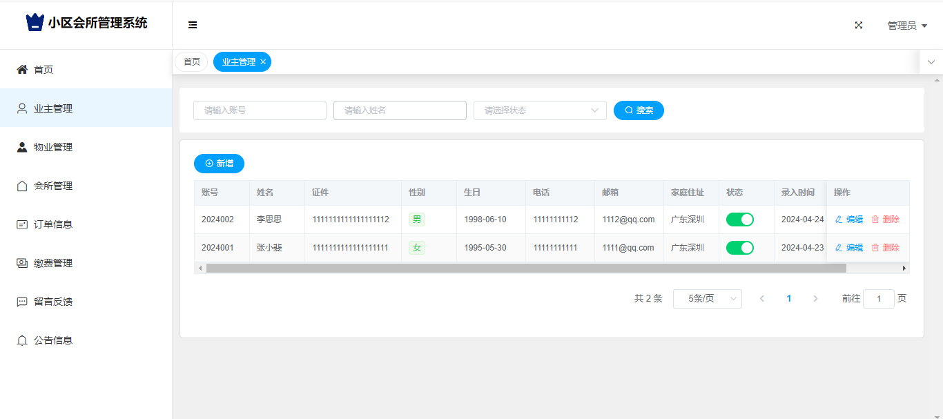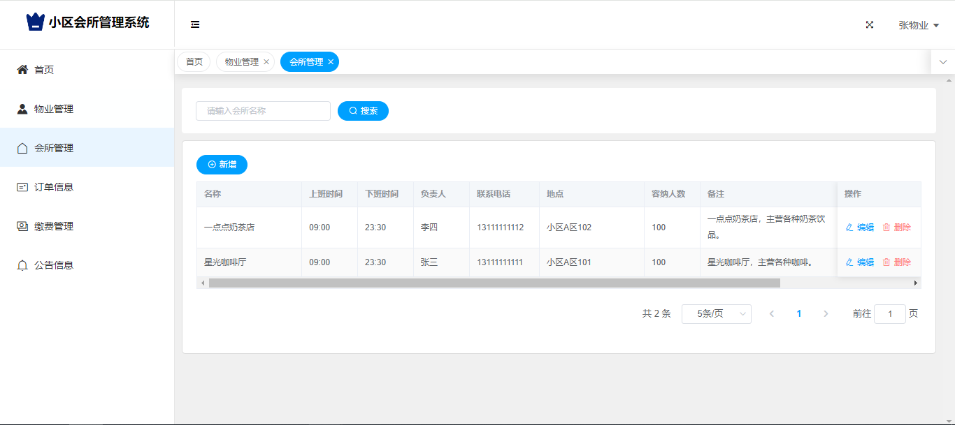 基于SpringBoot+Vue前后端分离的小区会所管理系统,系统包含管理员、物业、业主角色,功能如下: