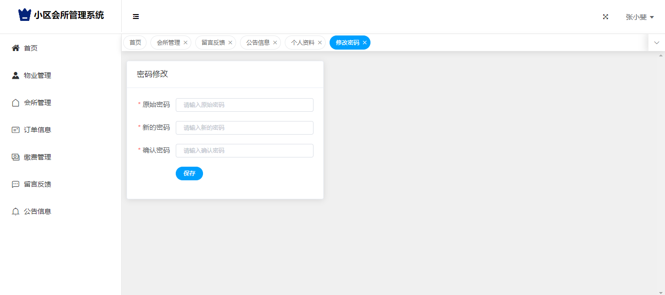 基于SpringBoot+Vue前后端分离的小区会所管理系统,本人原创开发。