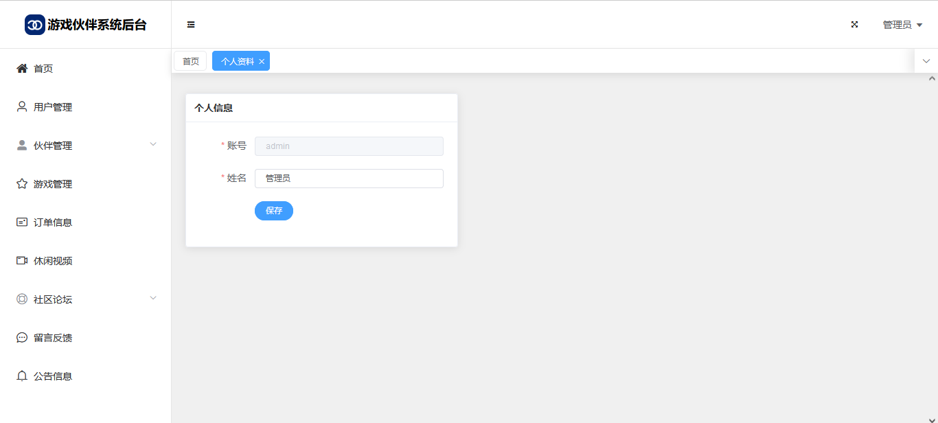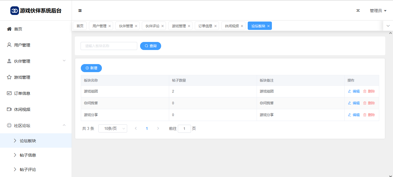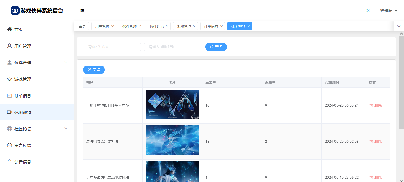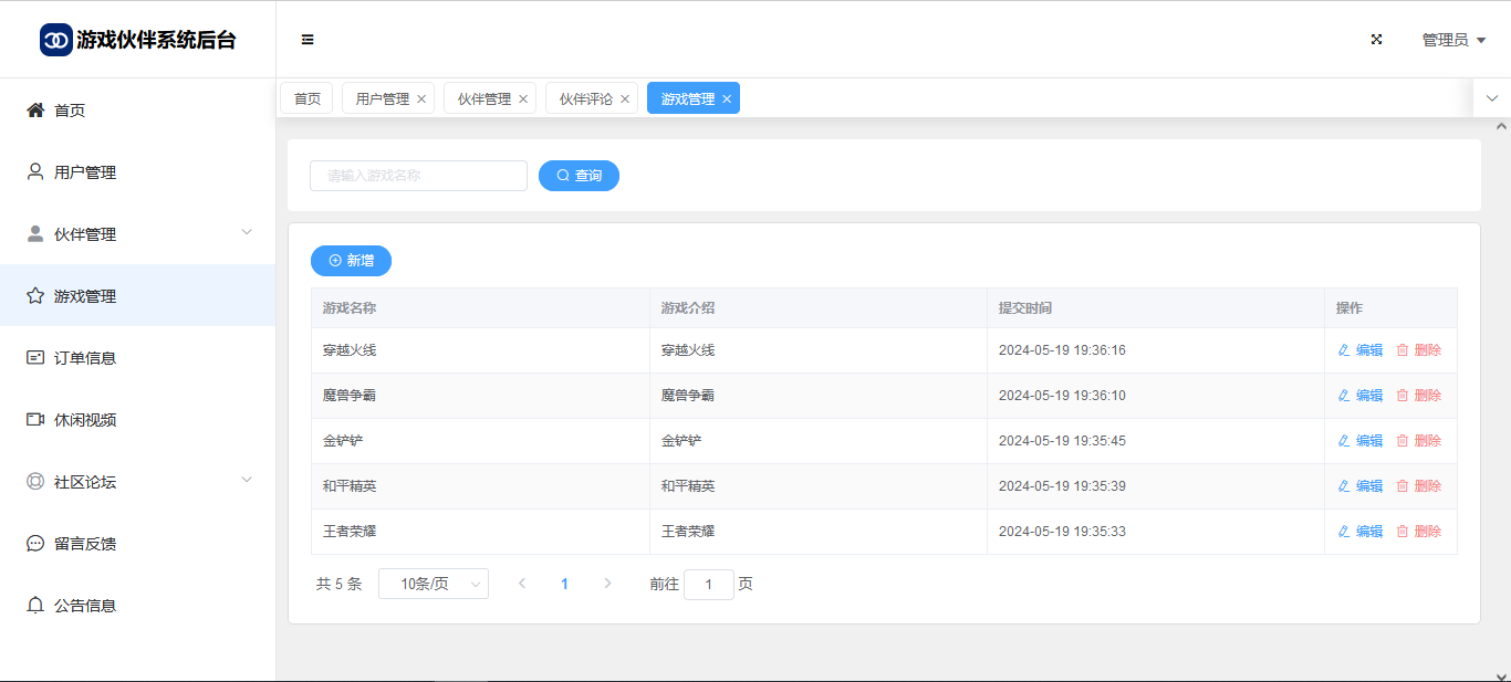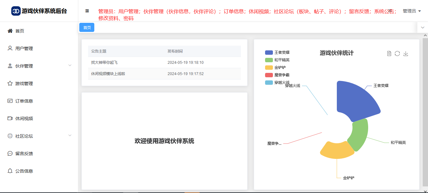 管理员:首页统计;用户管理;伙伴管理(伙伴信息、伙伴评论);游戏管理;订单管理;休闲视频;社区论坛(板块、帖子、评论);留言反馈;公告信息;个人信息;密码修改;