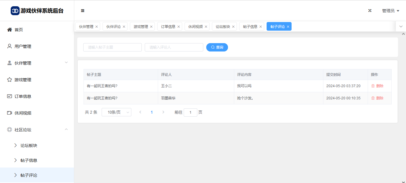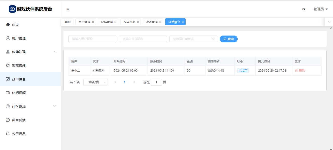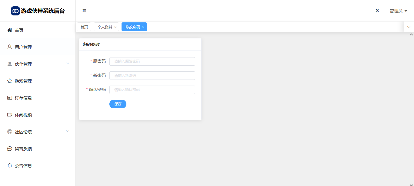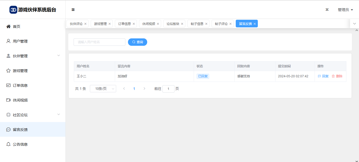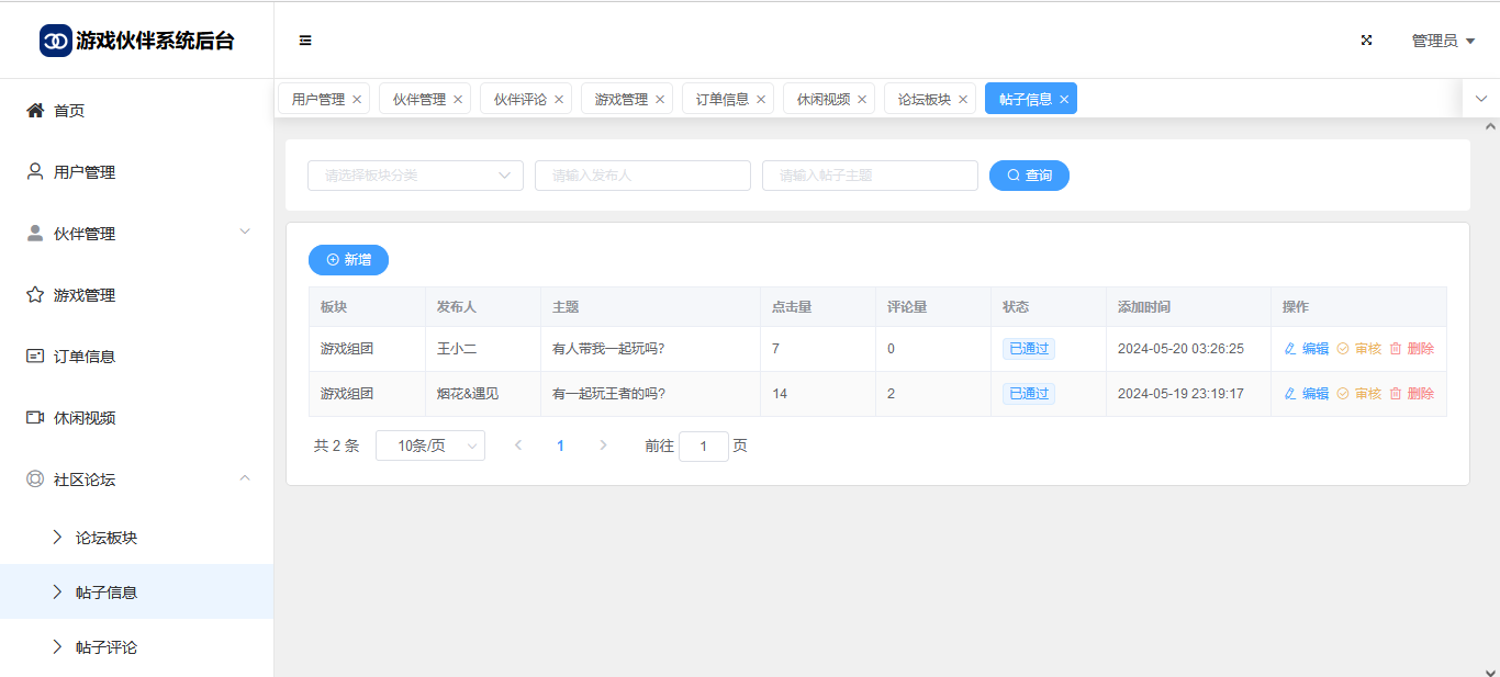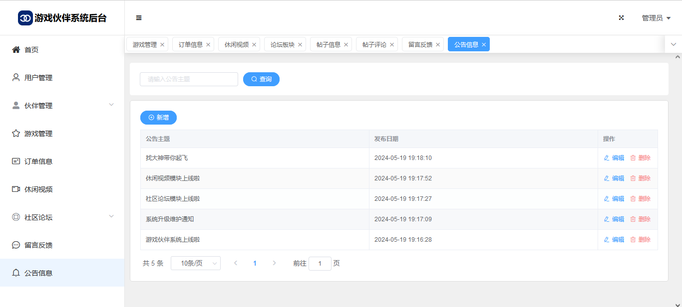 管理员:首页统计;用户管理;伙伴管理(伙伴信息、伙伴评论);游戏管理;订单管理;休闲视频;社区论坛(板块、帖子、评论);留言反馈;公告信息;个人信息;密码修改;