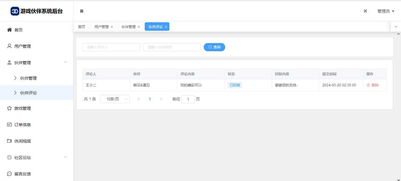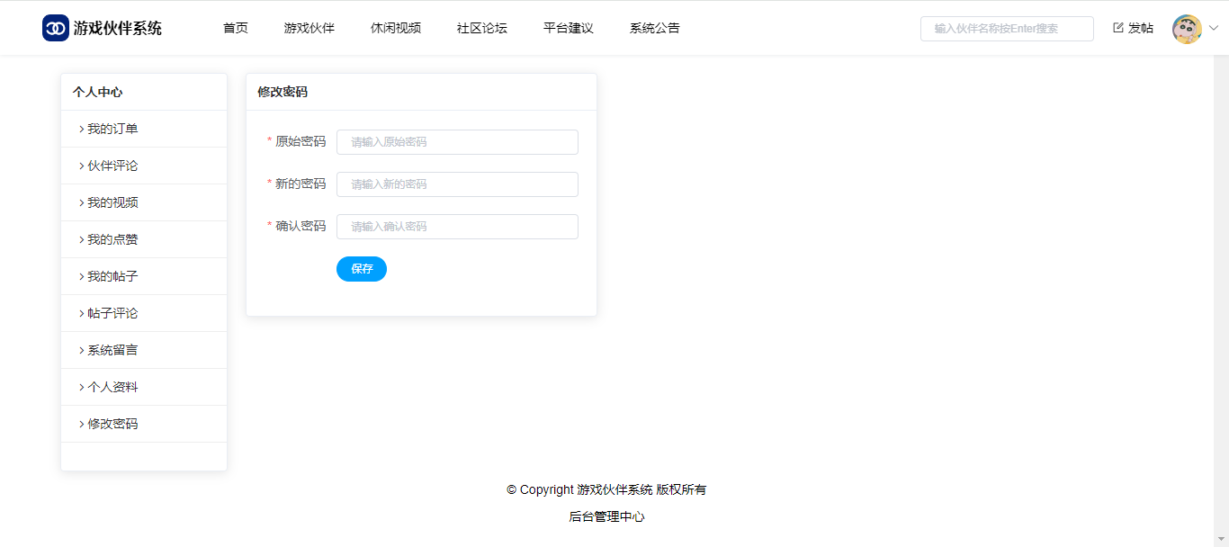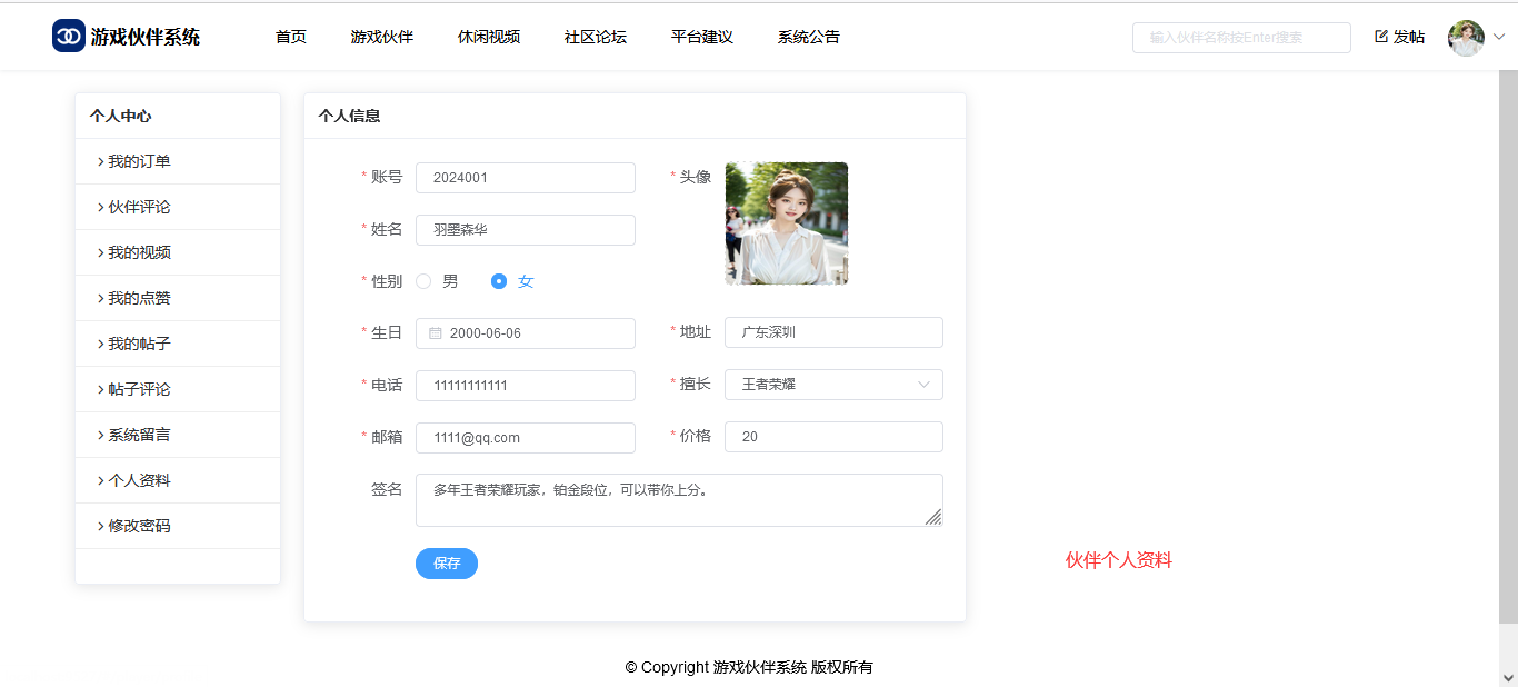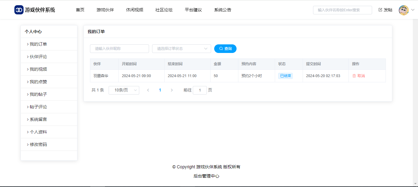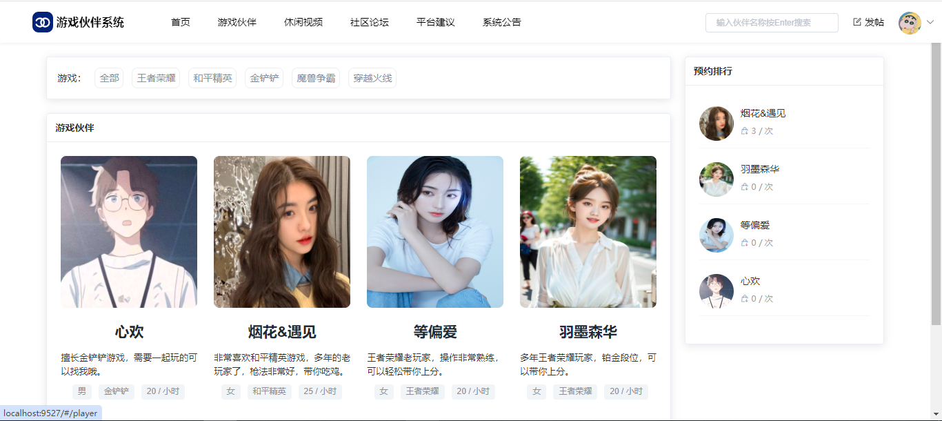 基于SpringBoot+Vue前后端分离的游戏伙伴系统,系统包含管理员、伙伴、用户角色,功能如下: