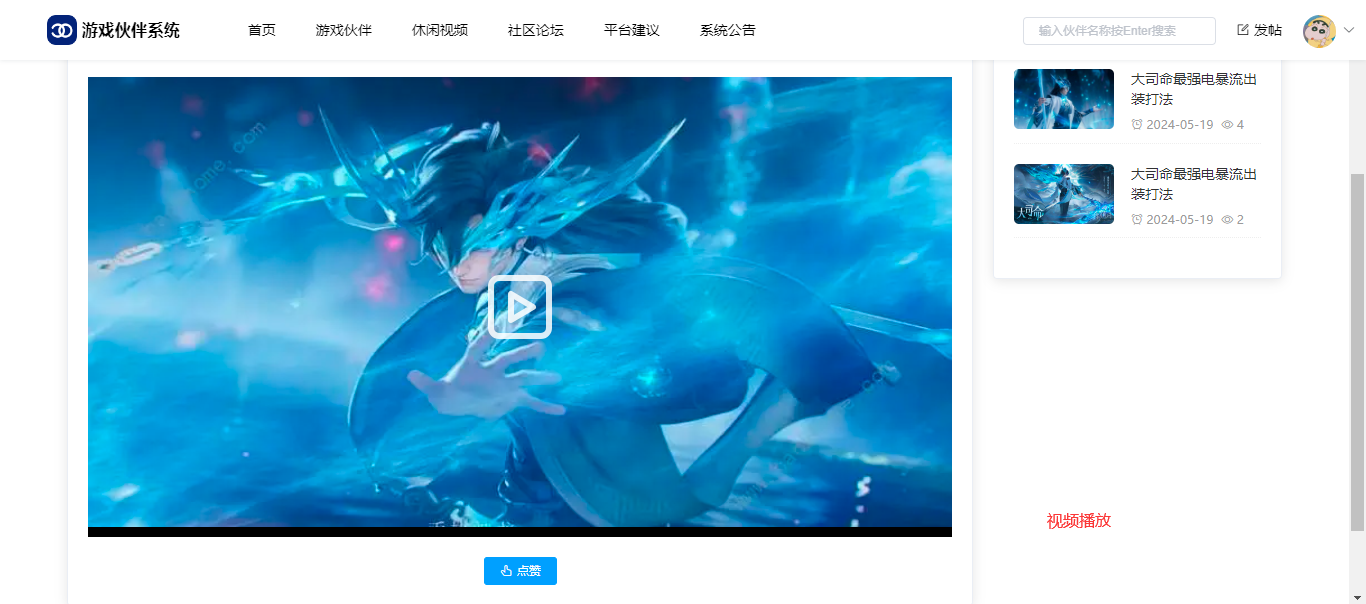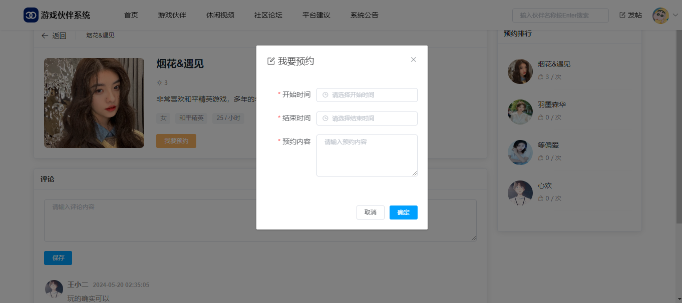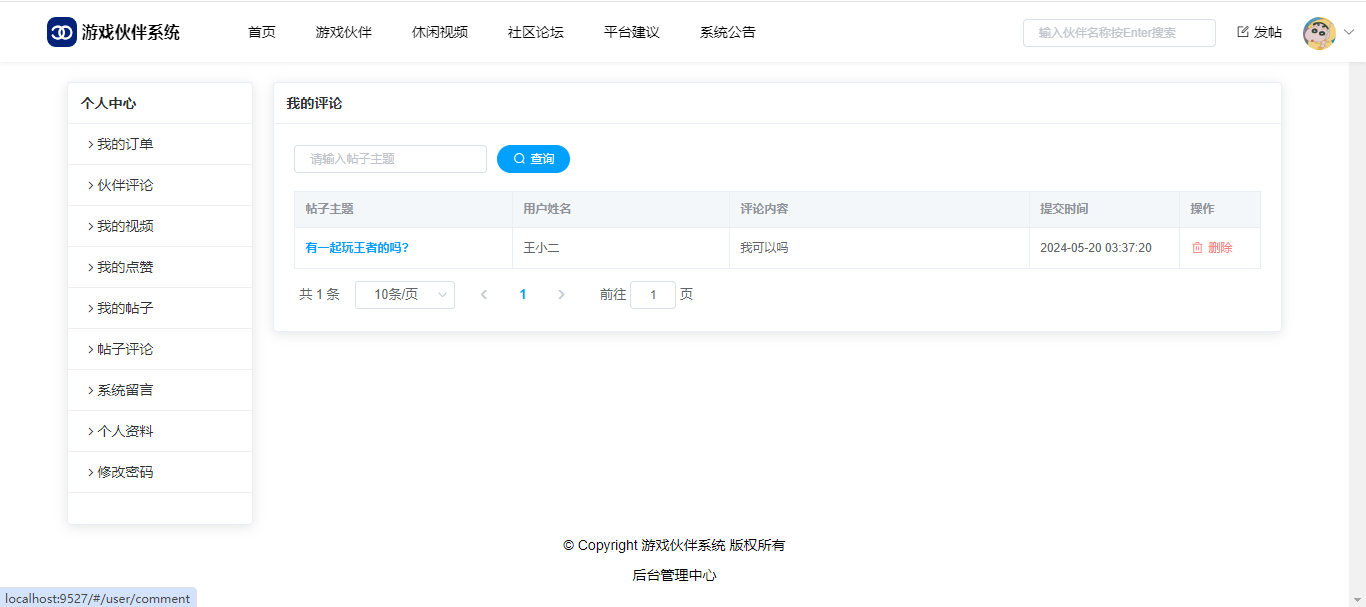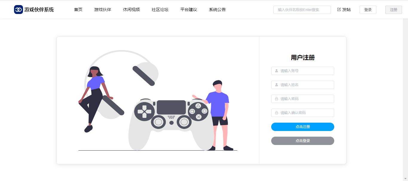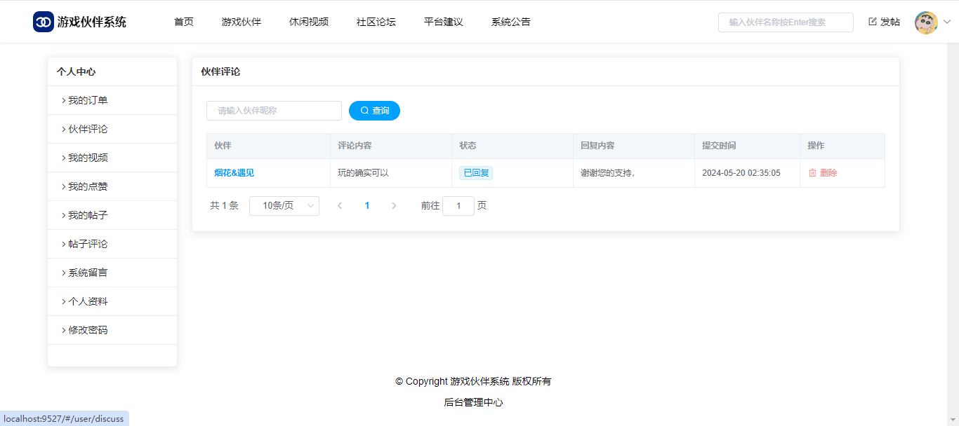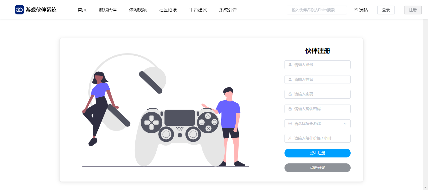 用户:查看前台;查看游戏伙伴并且预约或评论;发布休闲视频;查看帖子、发帖、评论;平台建议;查看公告;个人中心可以看到我的预约订单,我对伙伴的评论、我的视频、我的点赞、我的帖子、帖子评论、系统留言、个人资料、修改密码。